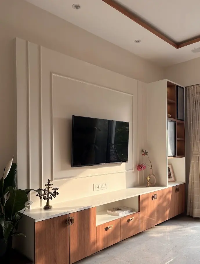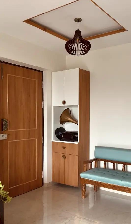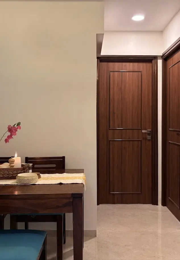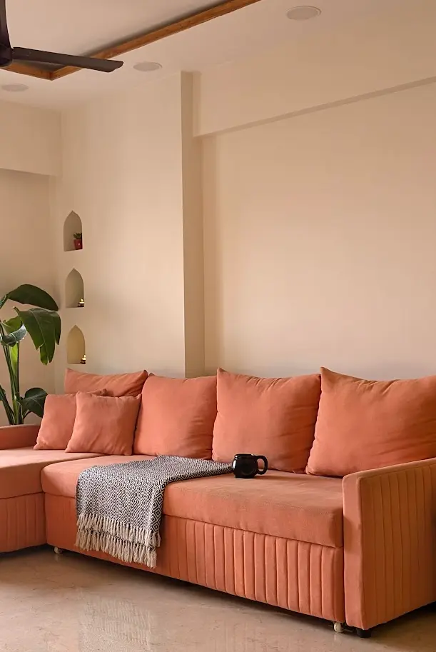 Designed for easy flow, the layout is clean and functional. The living room welcomes the first light of day, creating a cheerful start each morning. A kesar orange sofa adds a vibrant, traditional touch, balanced by brass and wood accents. Colourful konada niches in pink, yellow, and blue with golden prints lend a rich, cultural flair.