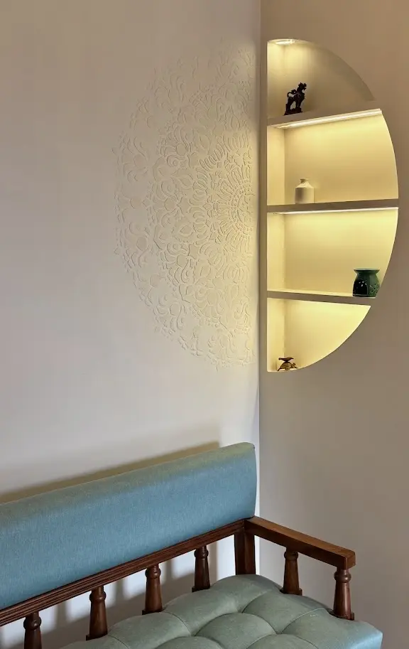 Traditional ‘konada’ niches act as small display shelves, finished in vibrant floral tones bougainvillea pink, marigold yellow, and peacock blue with a delicate golden ethnic print adding a touch of cultural richness.
