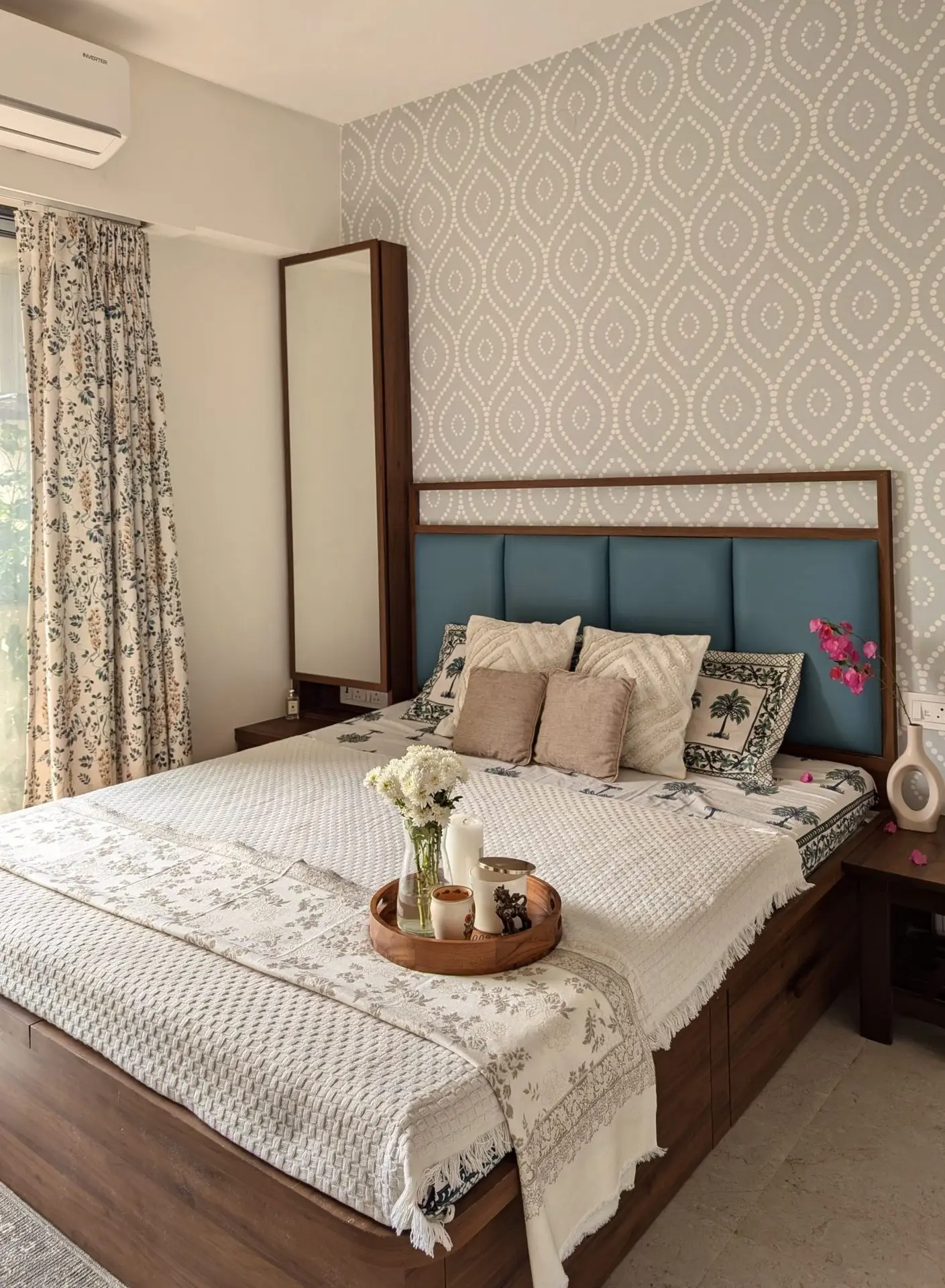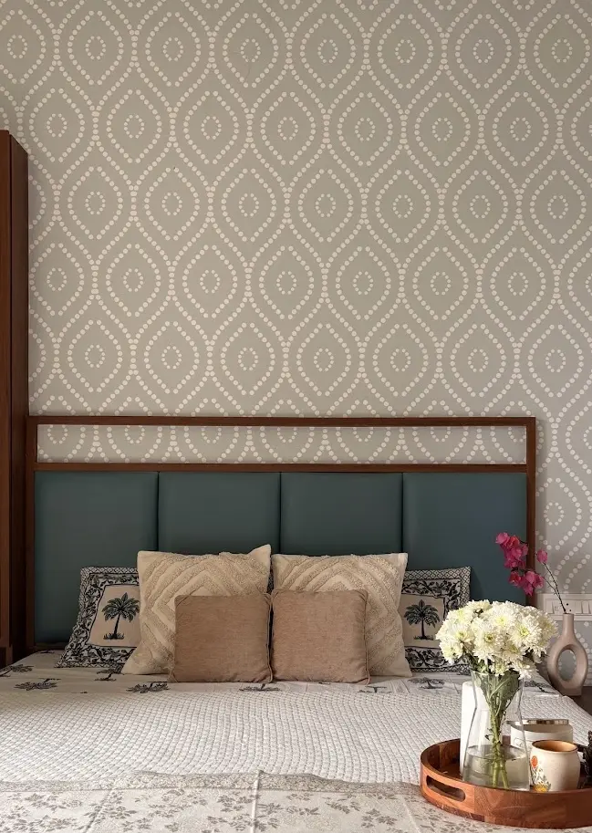 To avoid a plain white backdrop and add warmth, a light blue ethnic print wallpaper highlights the bed’s back wall, bringing subtle pattern and depth. The room strikes a balance between clutter-free comfort and strong material presence.