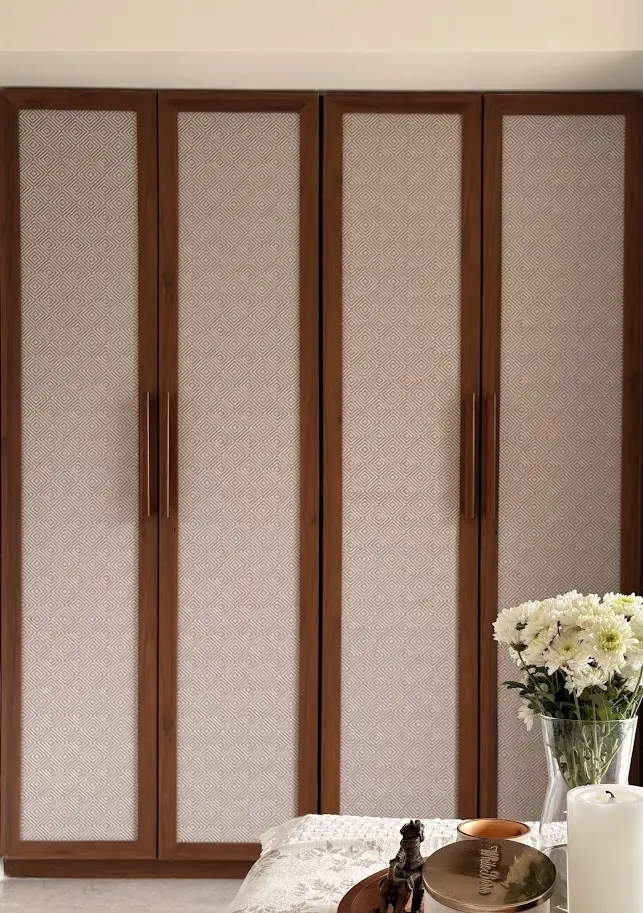 The master bedroom features a beautiful woven patterned laminate, perfectly framed on top of the wardrobe shutters, bringing in a textured, natural element inspired by traditional Indian crafts.