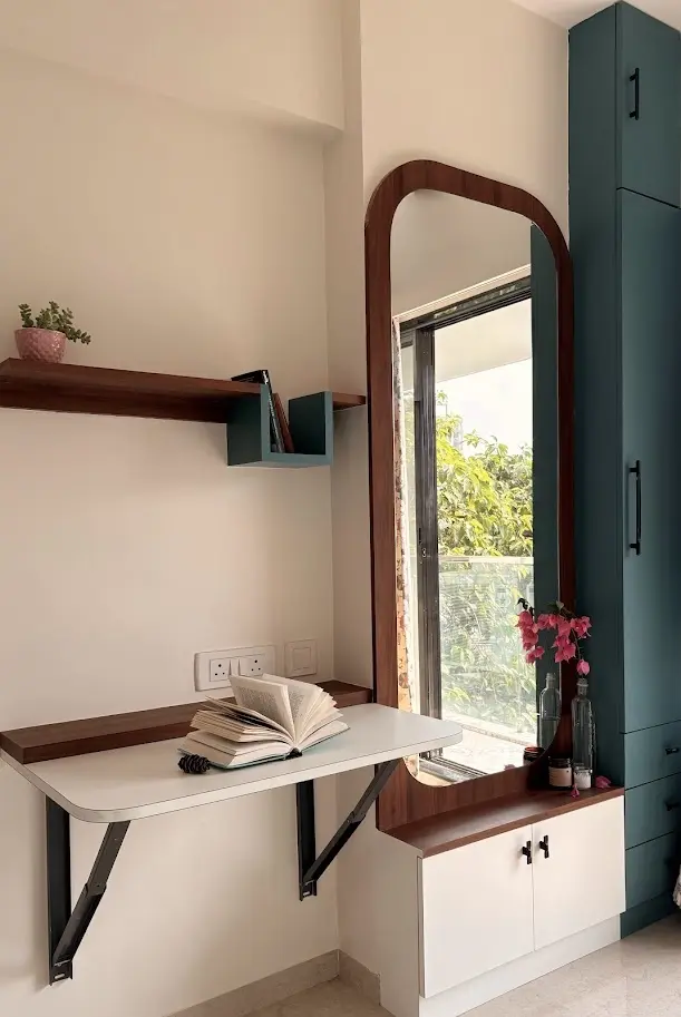 Small bedroom, holds a clean open layout during the day by using foldable furniture such as a folding study table and a sofa cum bed. To continue the ethnic theme, a rich peacock blue shade was introduced which brought a royal charm while keeping the space cozy and calming.