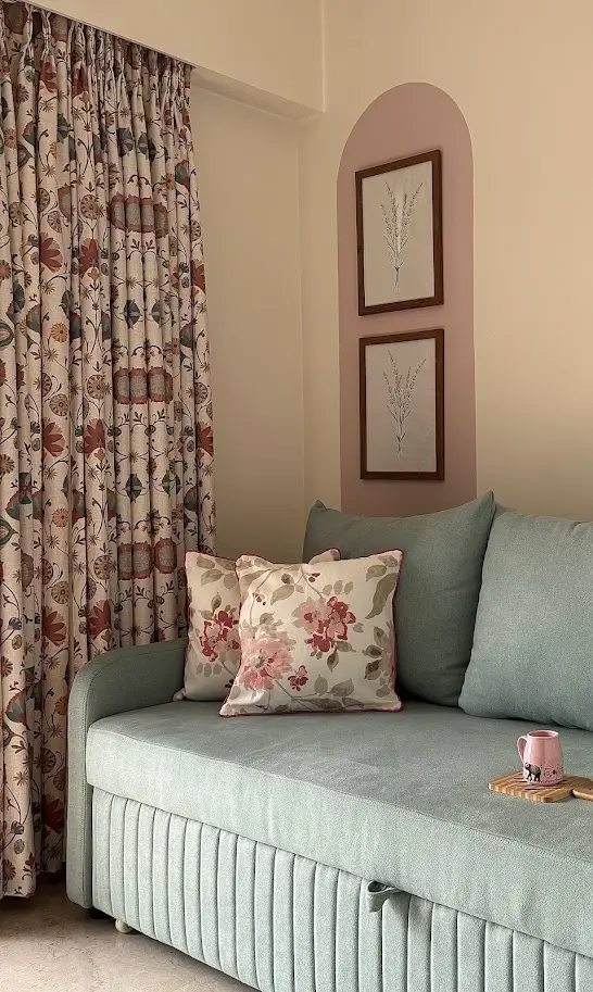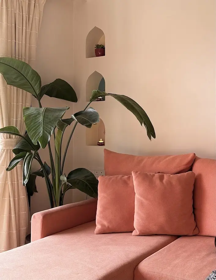 The layout is clean and functional, ensuring smooth flow between spaces. The living room, bathed in early sunlight, sets a bright tone for the day. A warm kesar orange sofa adds a bold, traditional accent, inspired by Indian rituals and paired with brass and wood for a modern balance. Vibrant konada niches in bougainvillea pink, marigold yellow, and peacock blue, finished with golden ethnic prints, add a rich cultural touch.