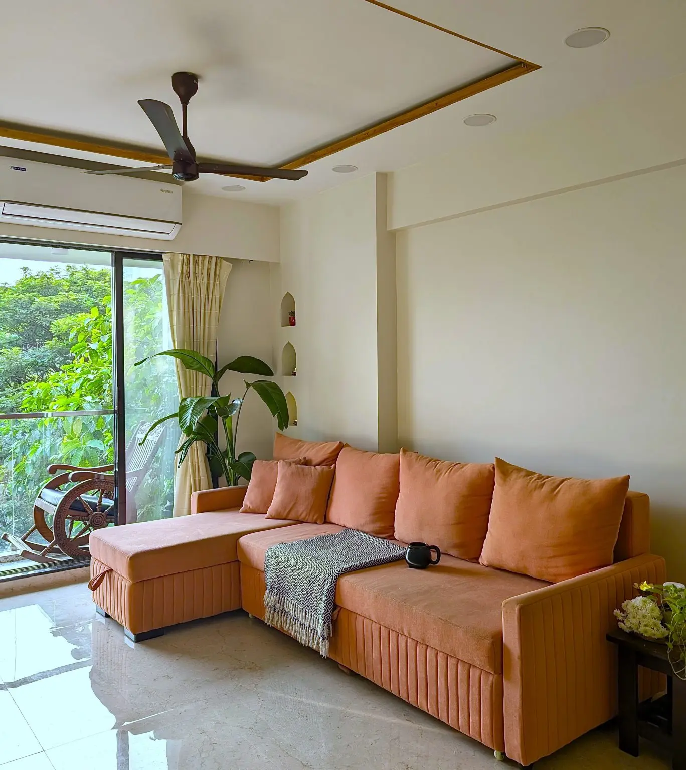 A warm ‘kesar’ orange sofa anchors the living room, adding a bold, traditional touch. Inspired by Indian rituals, the colour brings energy and positivity, complemented by brass accents and wooden elements for a balanced, modern feel.
