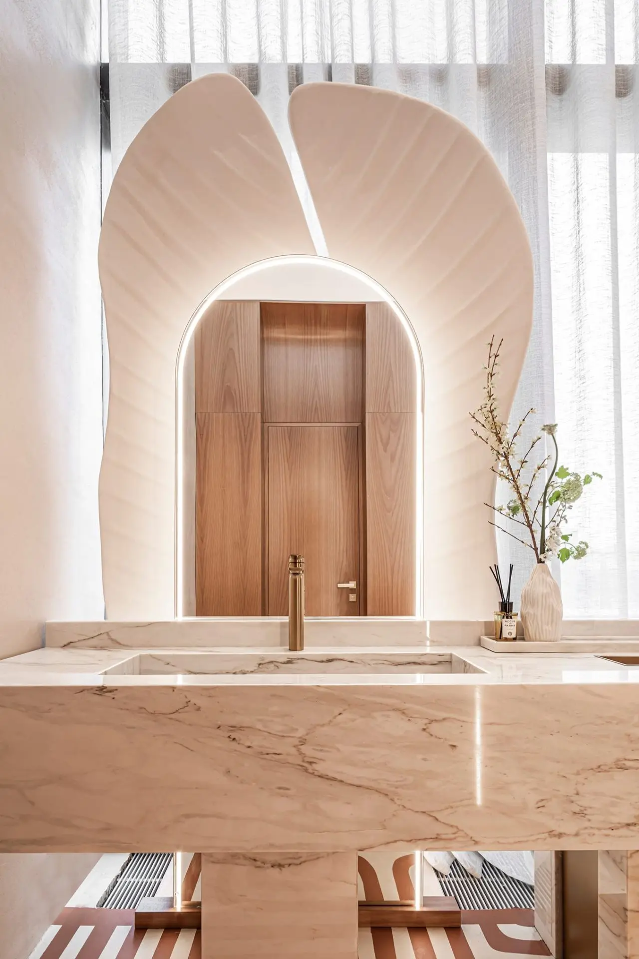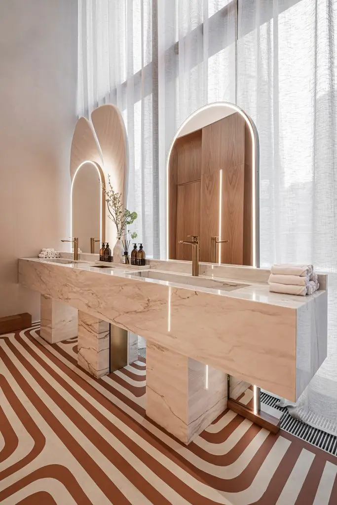 The bathrooms in the restaurant were designed by the architects as selfie zones. Marble sinks, semicircular arched mirrors, and huge lotus petals painted in the background provide a beautiful backdrop for photos.