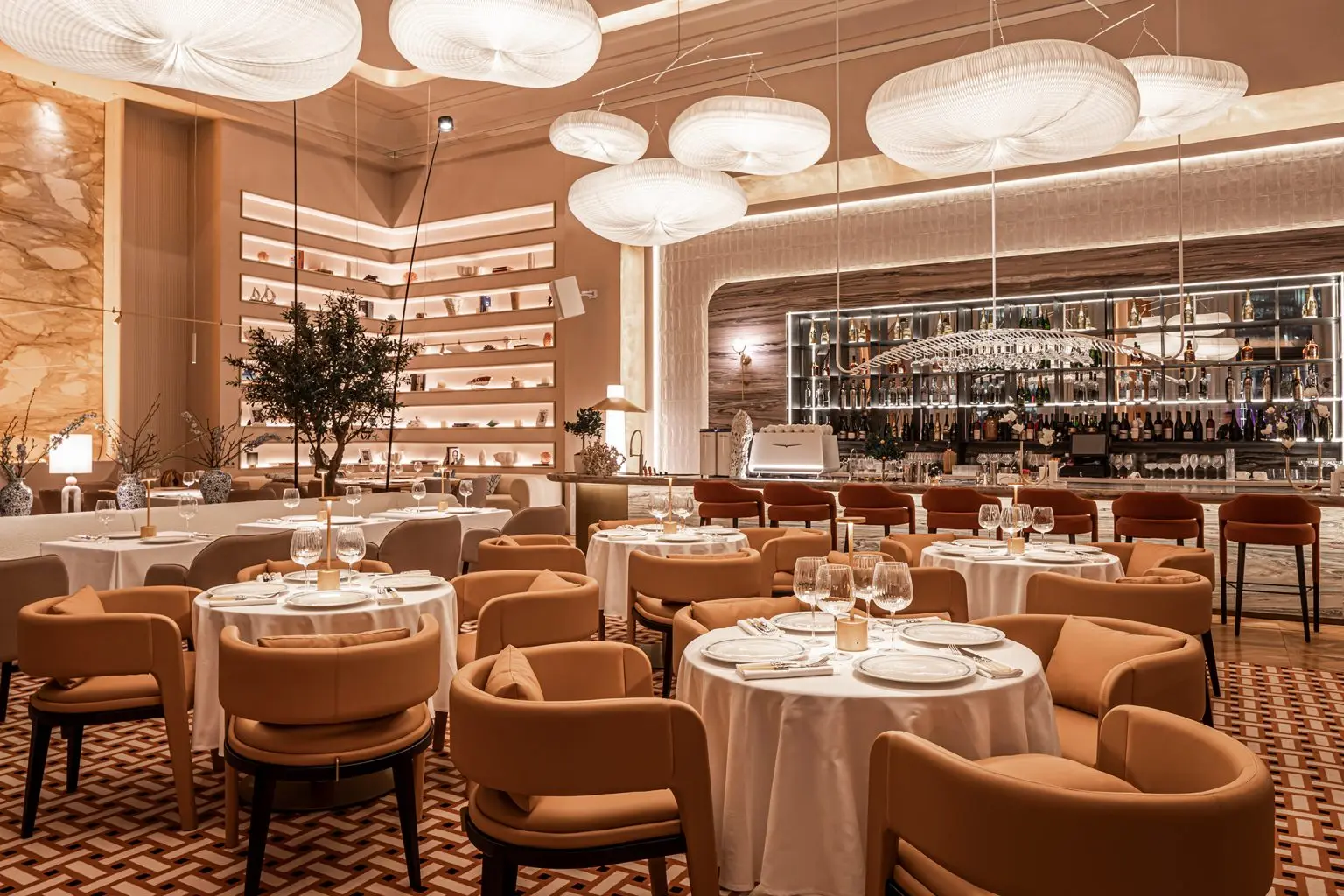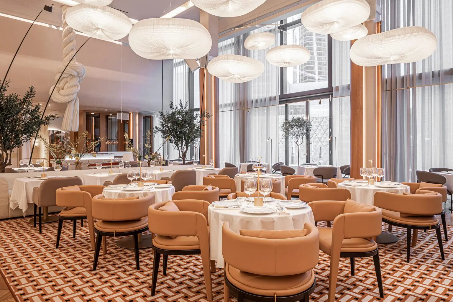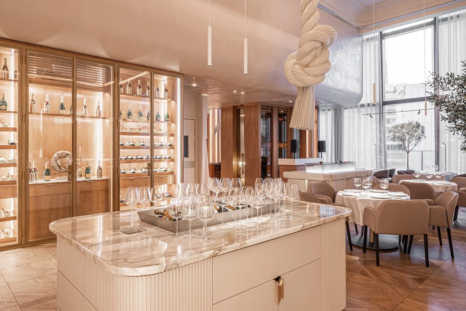 Inspired by the Mediterranean, we chose a creamy color palette that gives the impression of a tropical climate outside. The walls are heated to 50 degrees to further enhance this effect. As you explore the interior, you will notice the luxurious terrazzo tiles laid out in a special pattern, which remind you of a luxury Hermes boutique.