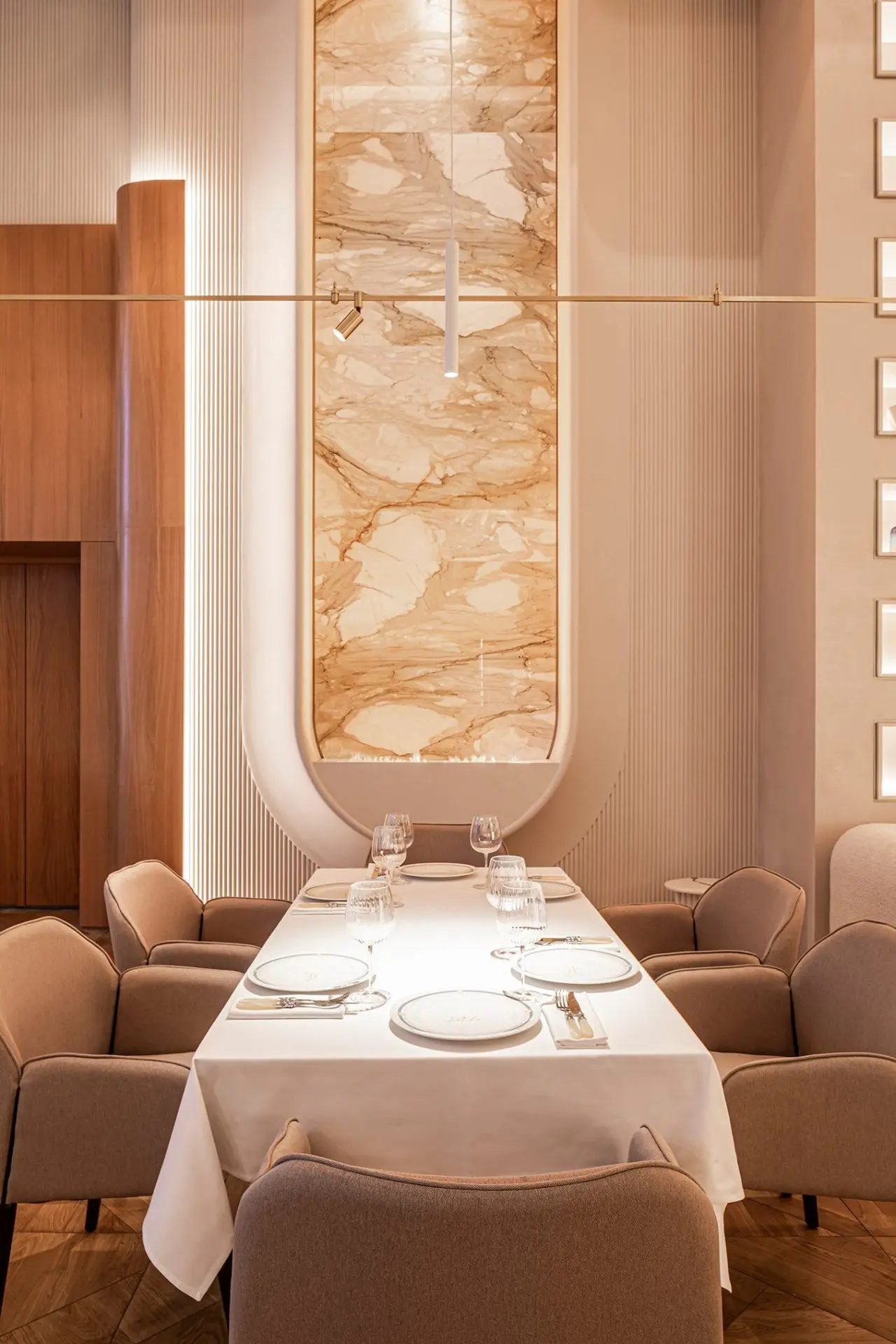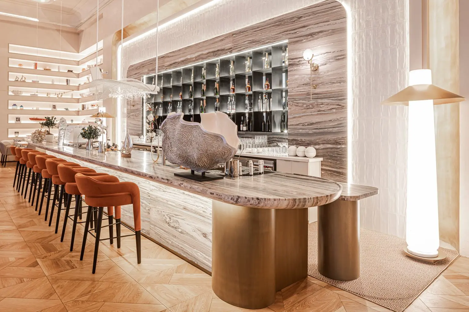 Expensive and unique marble was used to create the long bar counter, fireplace, and sink in the bathroom. Plaster on the walls is interspersed with warm honey-colored anigre veneer panels.