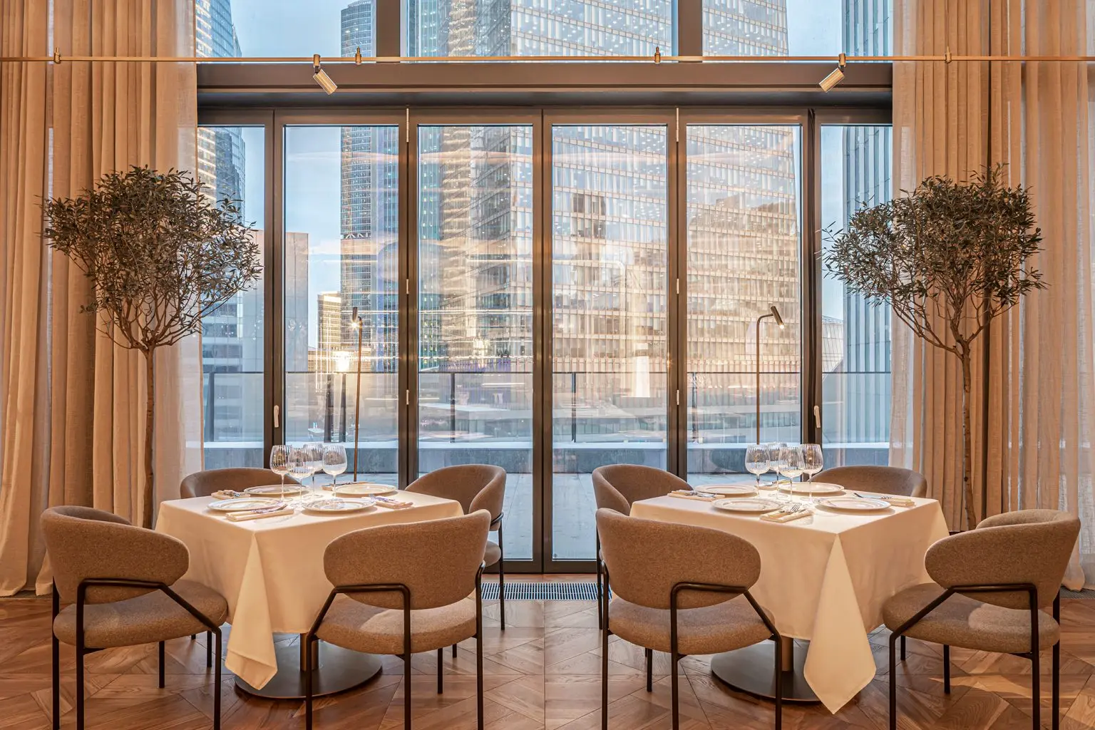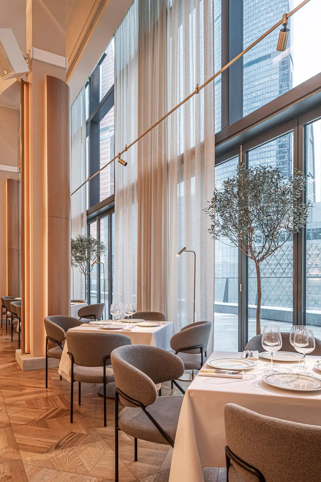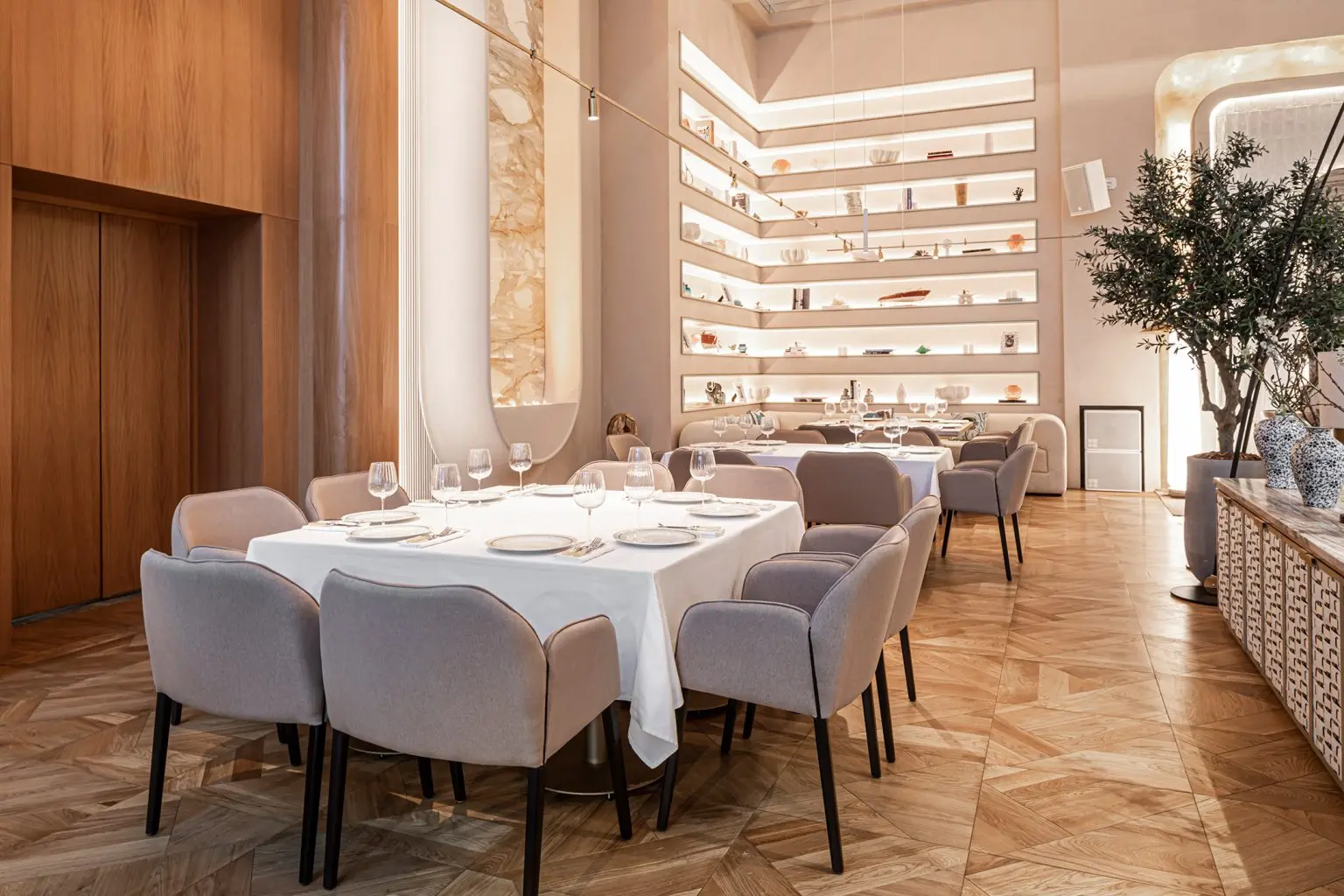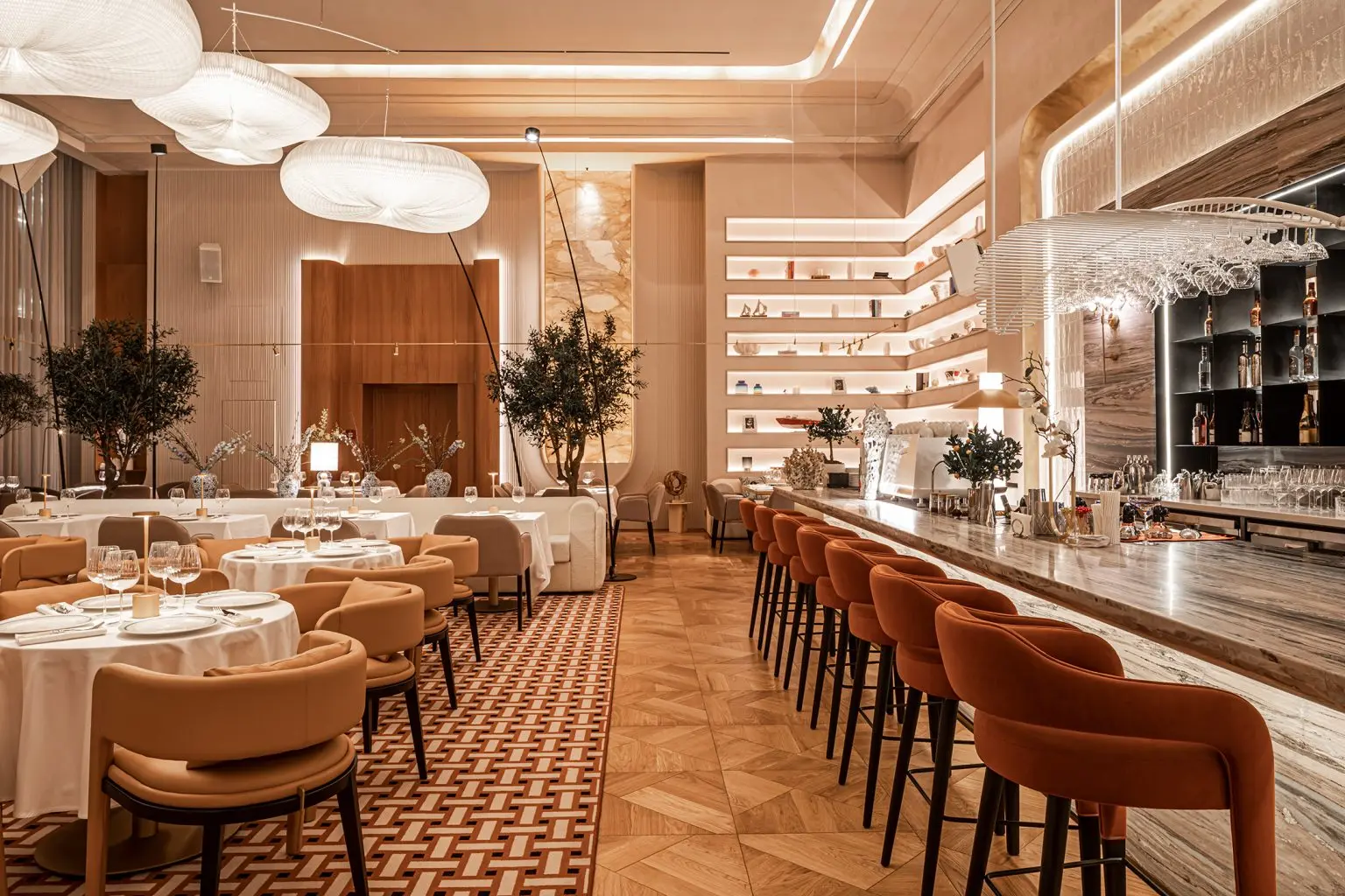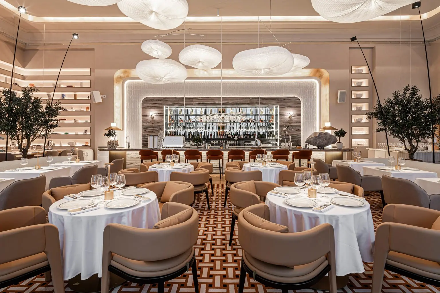 All the furniture, including the soft chairs, tables, and reception desk, were made according to the architects’ sketches. The tables are covered with snow-white tablecloths served with author’s ceramics. Cloud lamps made of non-woven textiles from Molo Design float under the ceiling.