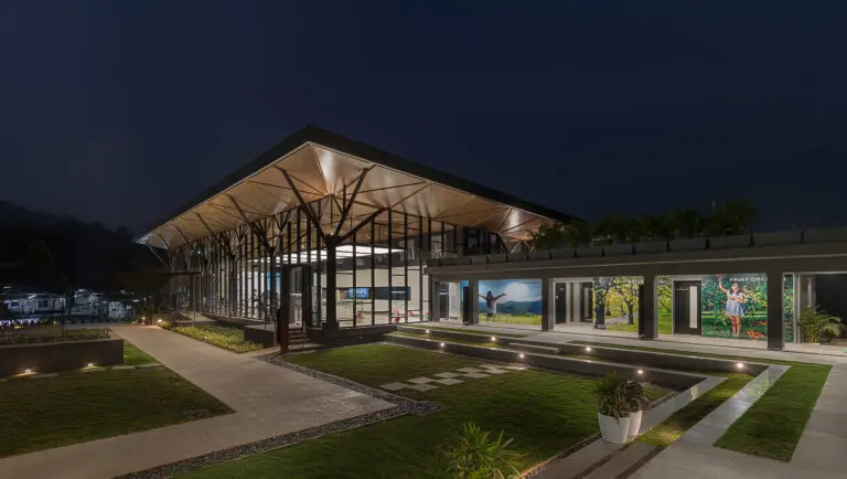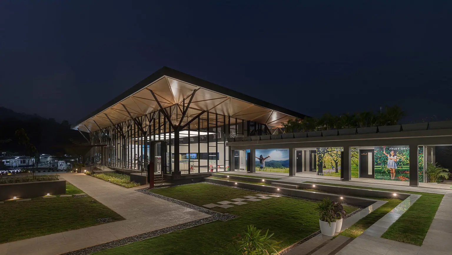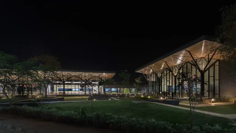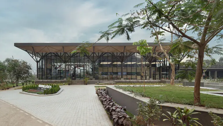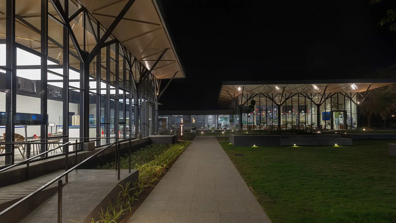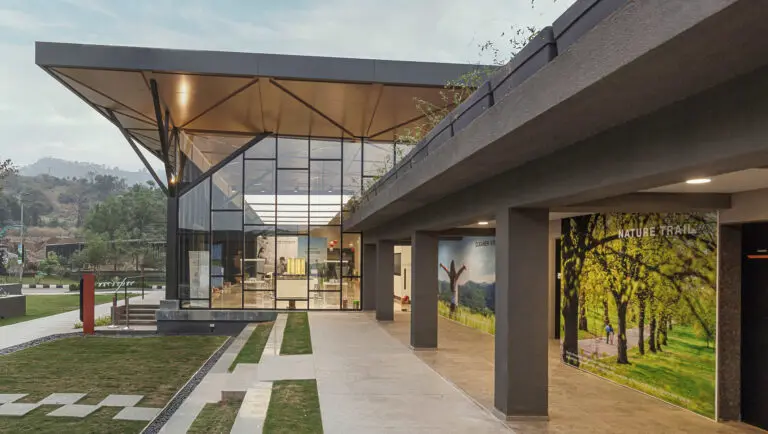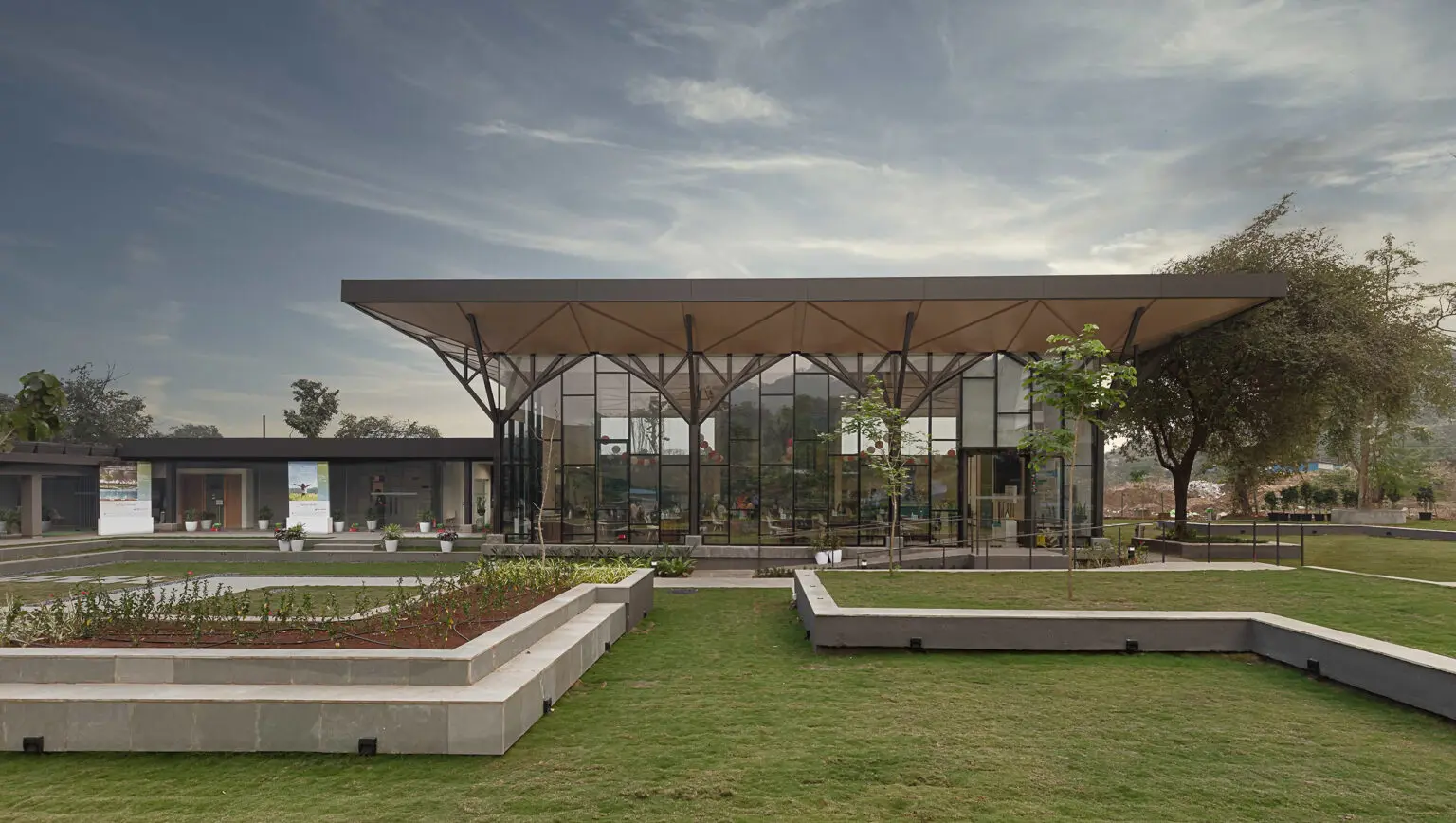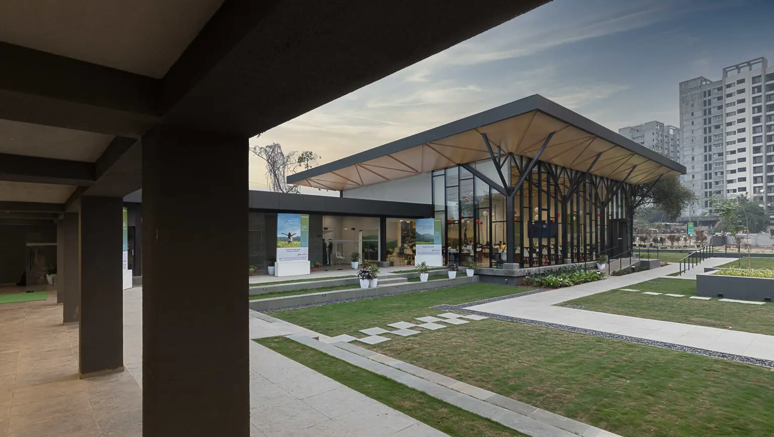 Glass walls allow a good interaction of the internal spaces & external landscape. There is a good balance of volumes with covered, semi covered & open spaces which gives a glimpse of community spaces of the township.