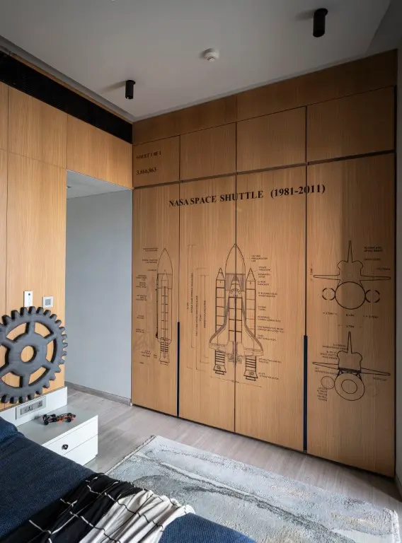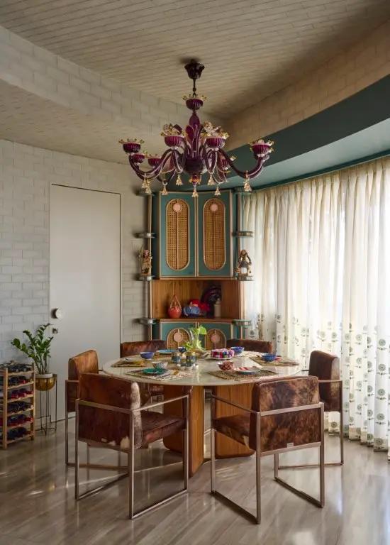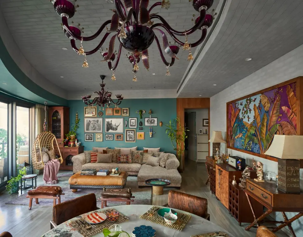 wooden chests stand alongside sleek, contemporary lighting fixtures, reflecting the clients’