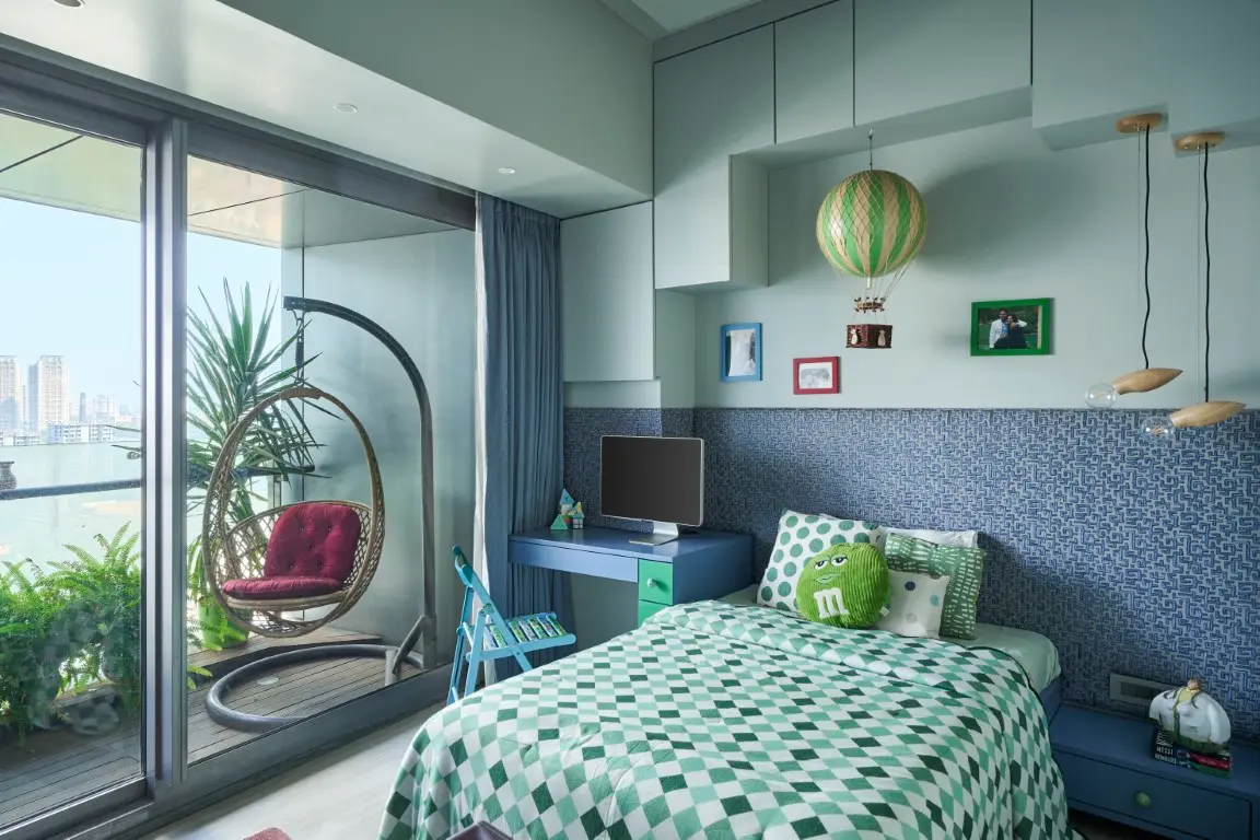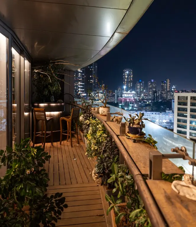 Beyond the confines of the apartment, the balconies are adorned with abundant greenery,