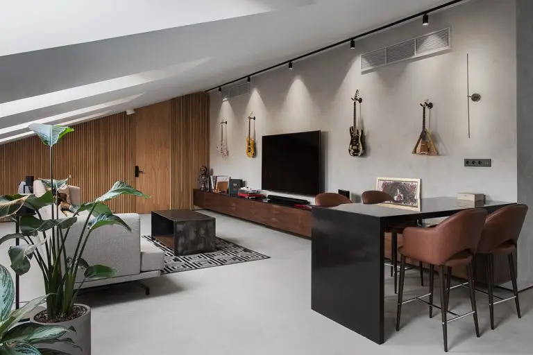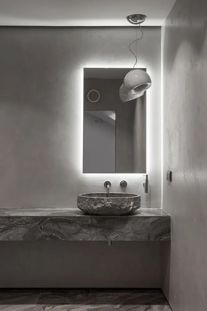 Another designer table created for a secretary is situated on the third floor. The table design sticks with the overall style of the interior: its basement is made of concrete and covered with an artificial stone top. This table attracts attention, so the architects thoughtfully saved some space inside the concrete base for all the wires from the computer and other equipment so that the electrics are hidden from the eye.