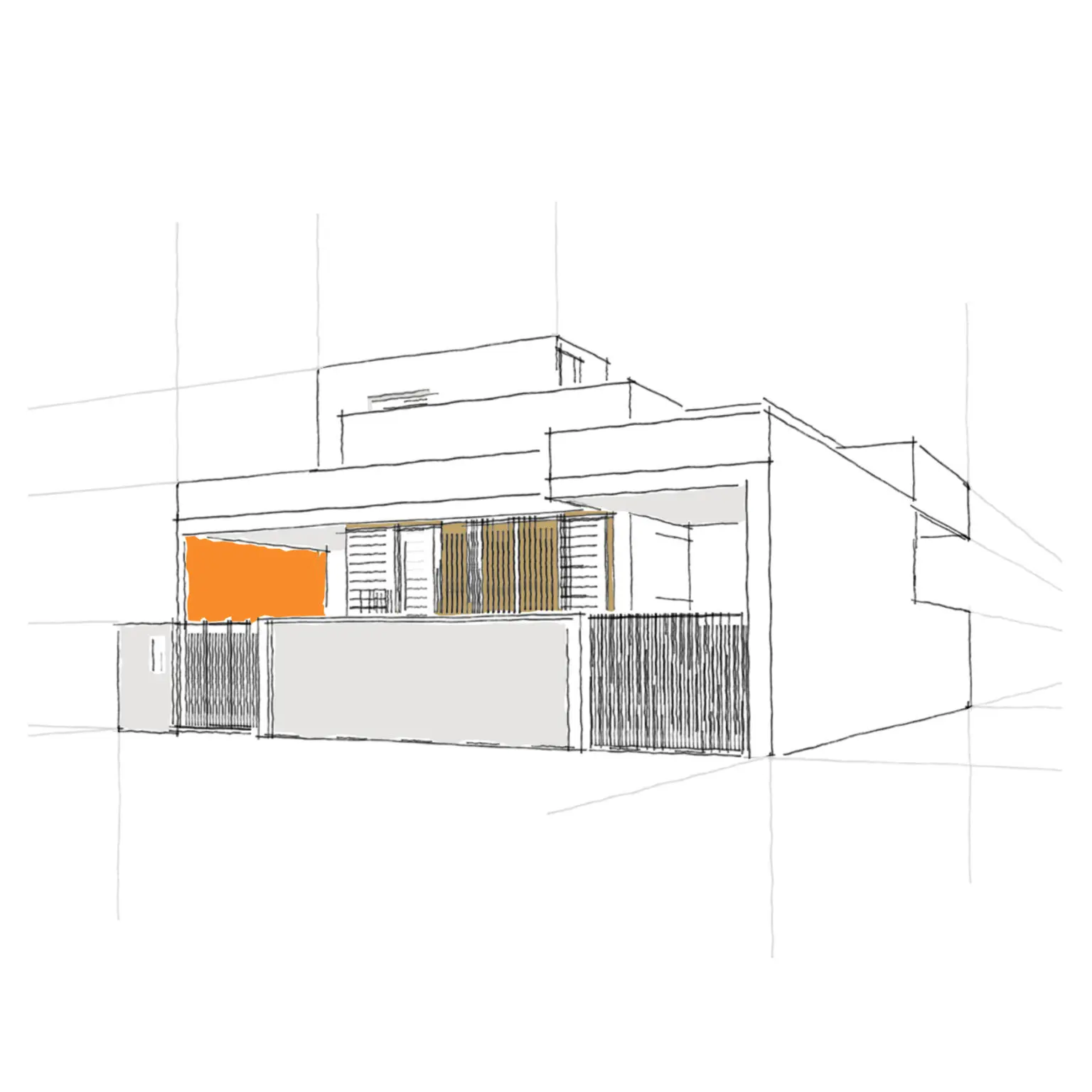 The house is designed in a wood, white and grey theme with orange used to highlight the walls enveloping the front façade. The use of orange emphasizes the volume and dramatizes the entrance.