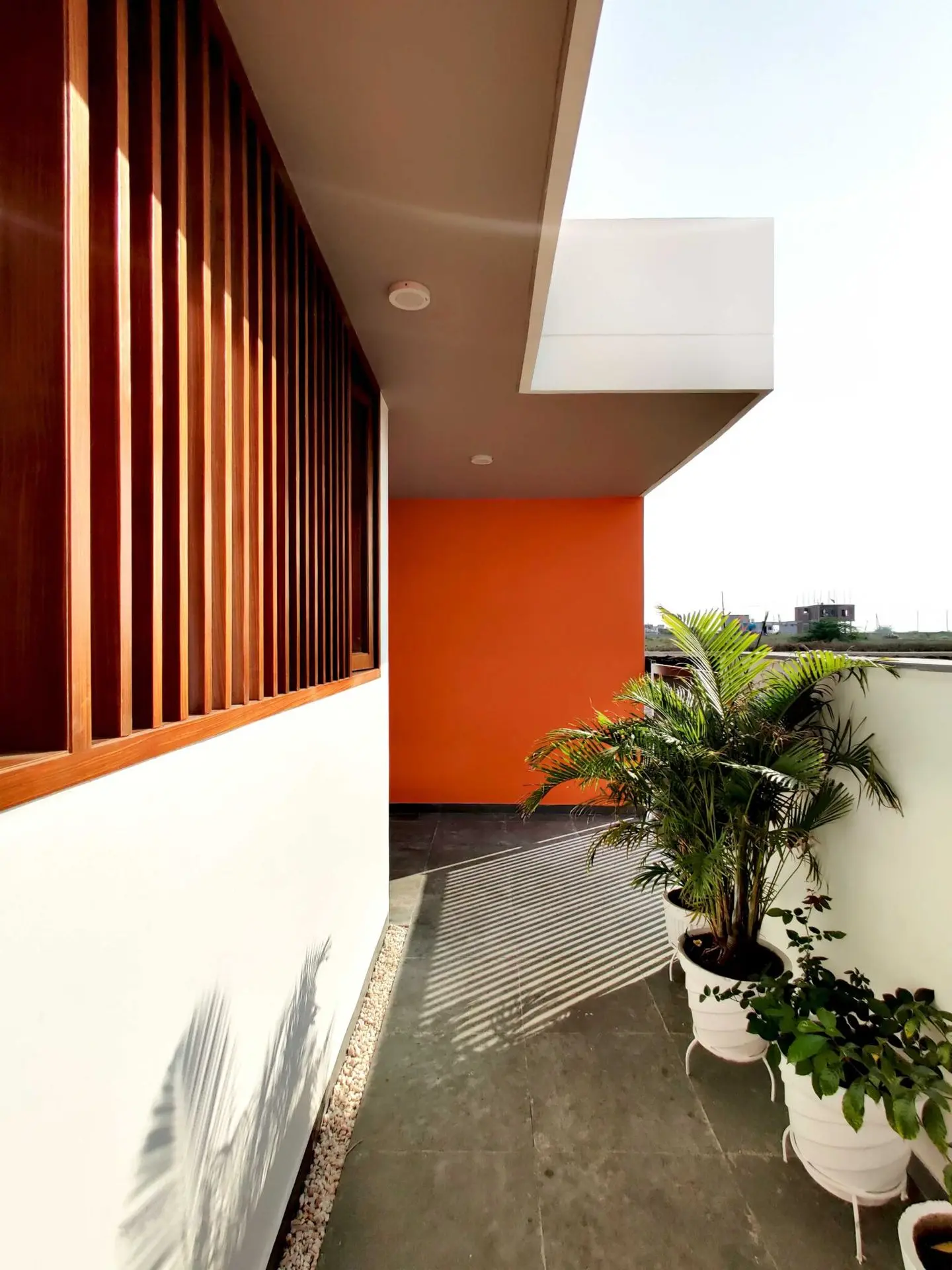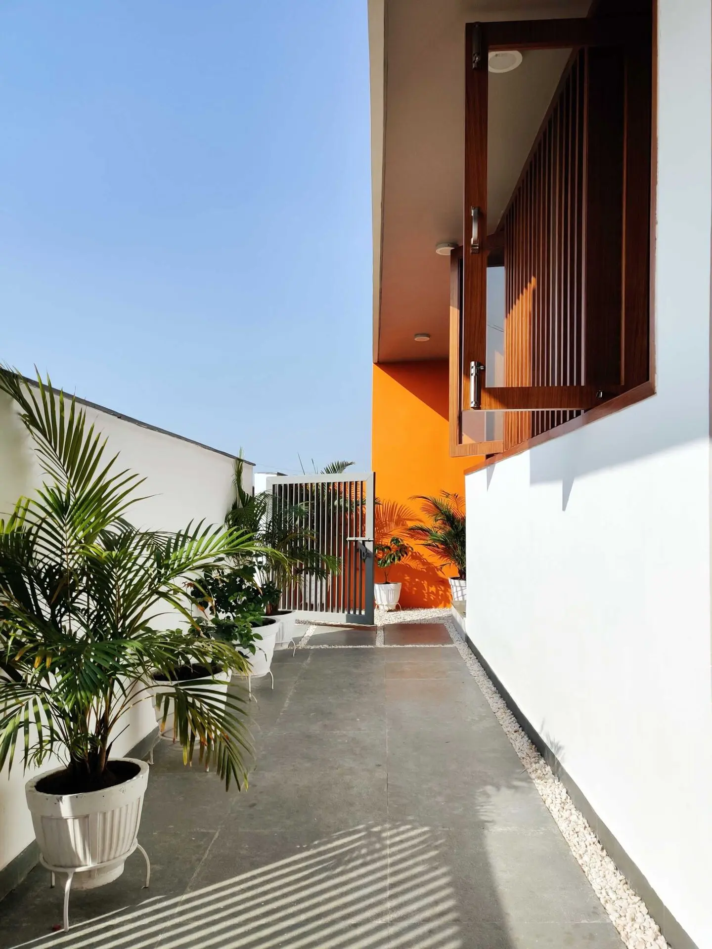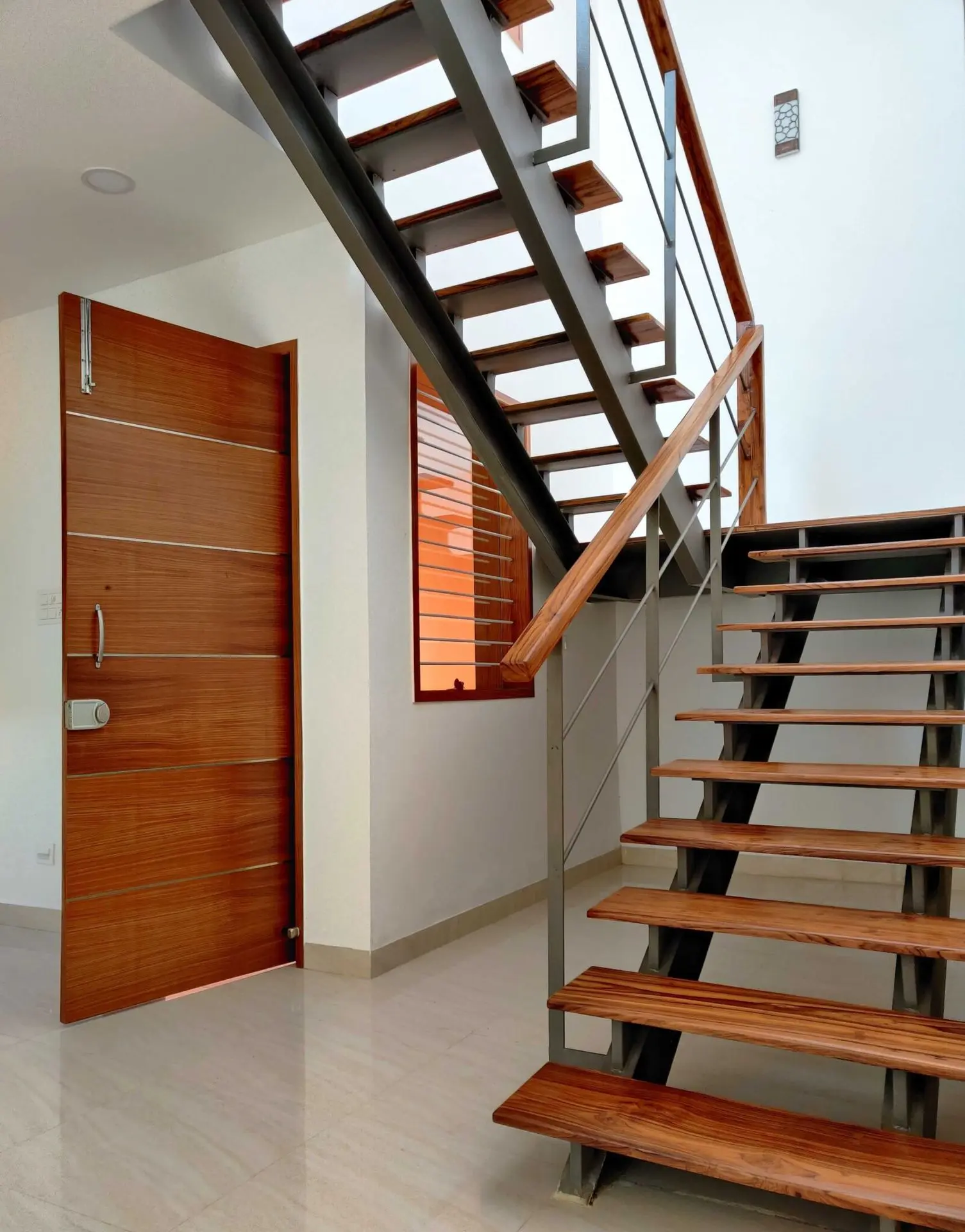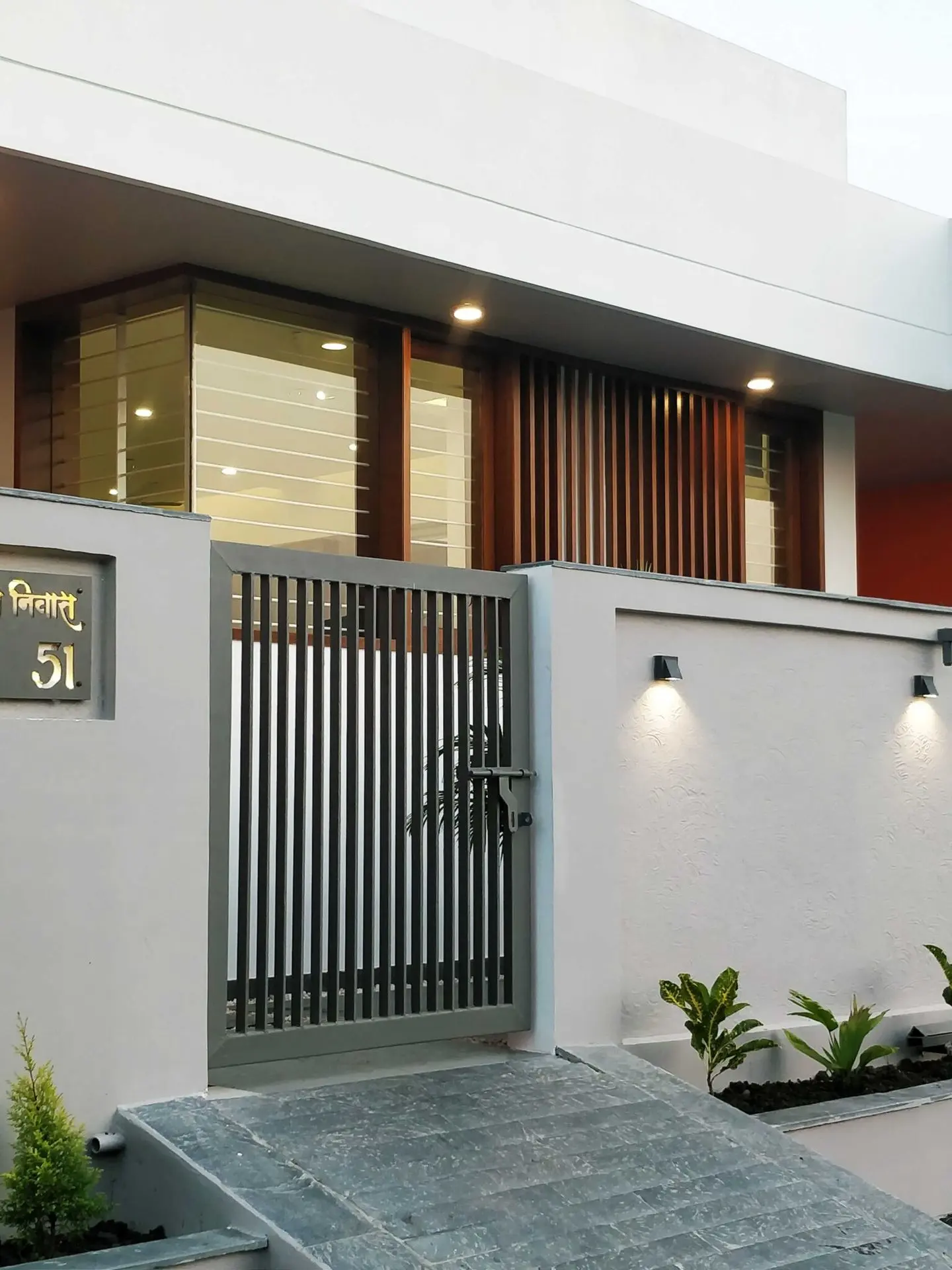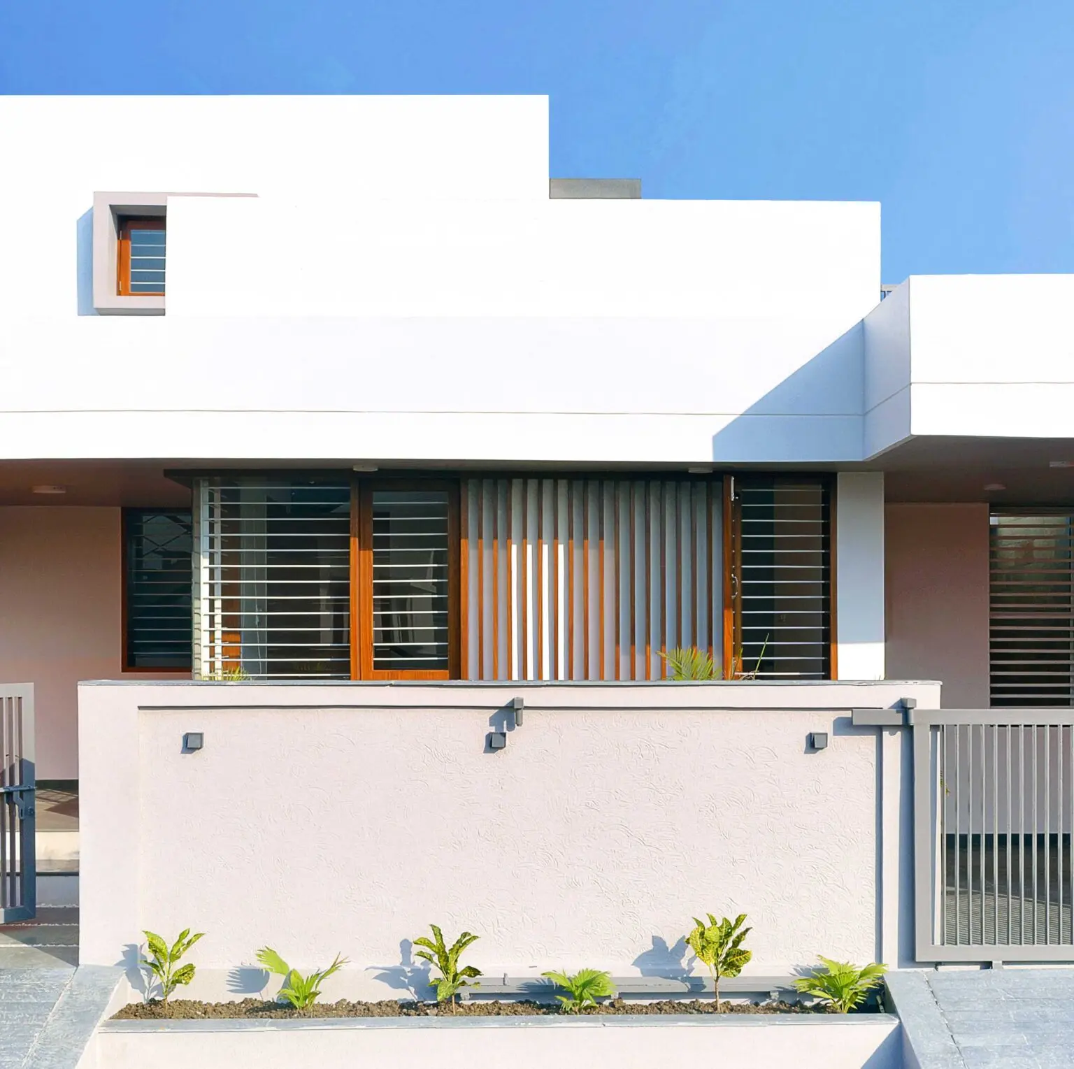 The wood used in the front elevation to create vertical louvers, windows and fabricated staircase brings a touch of luxury to the house.