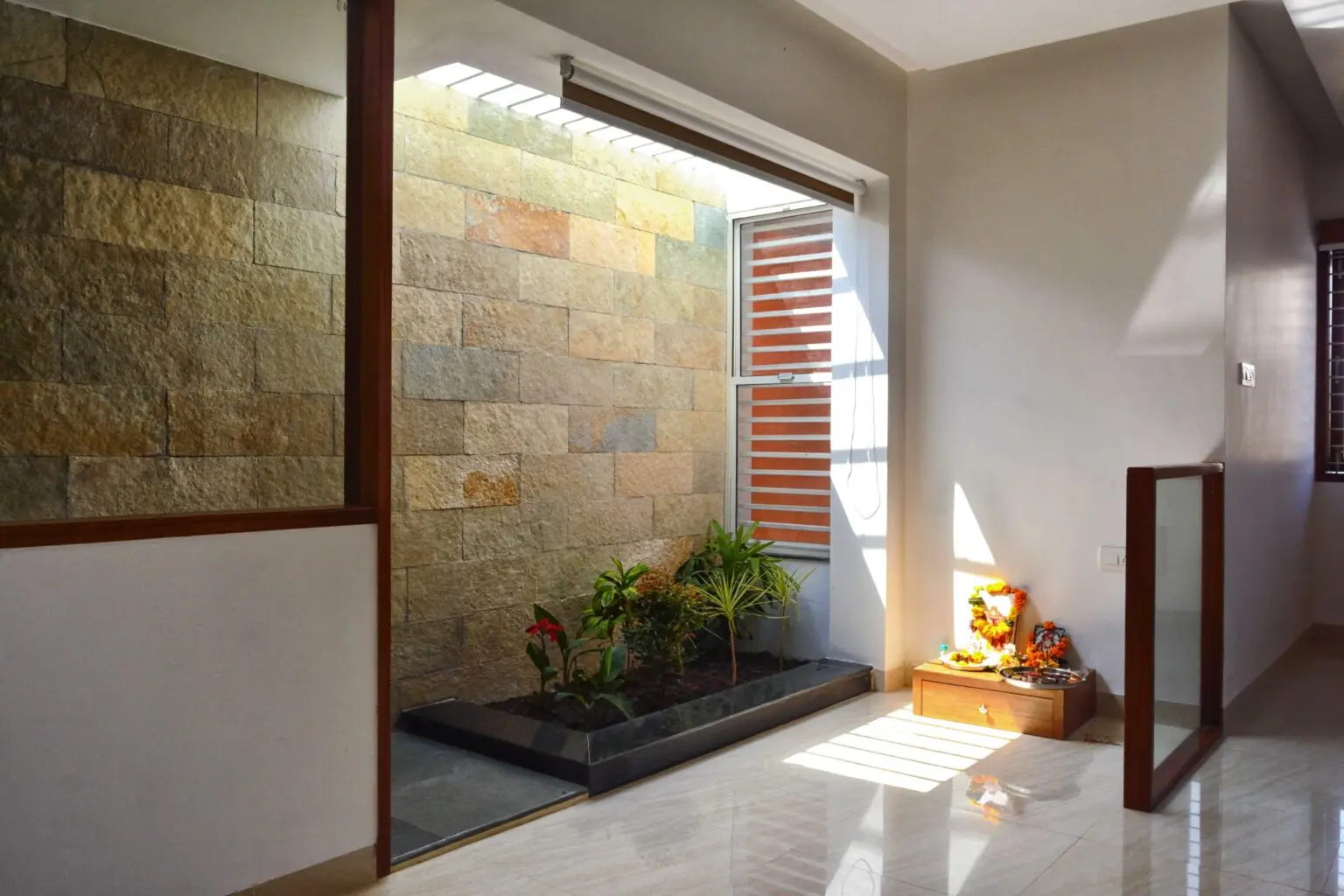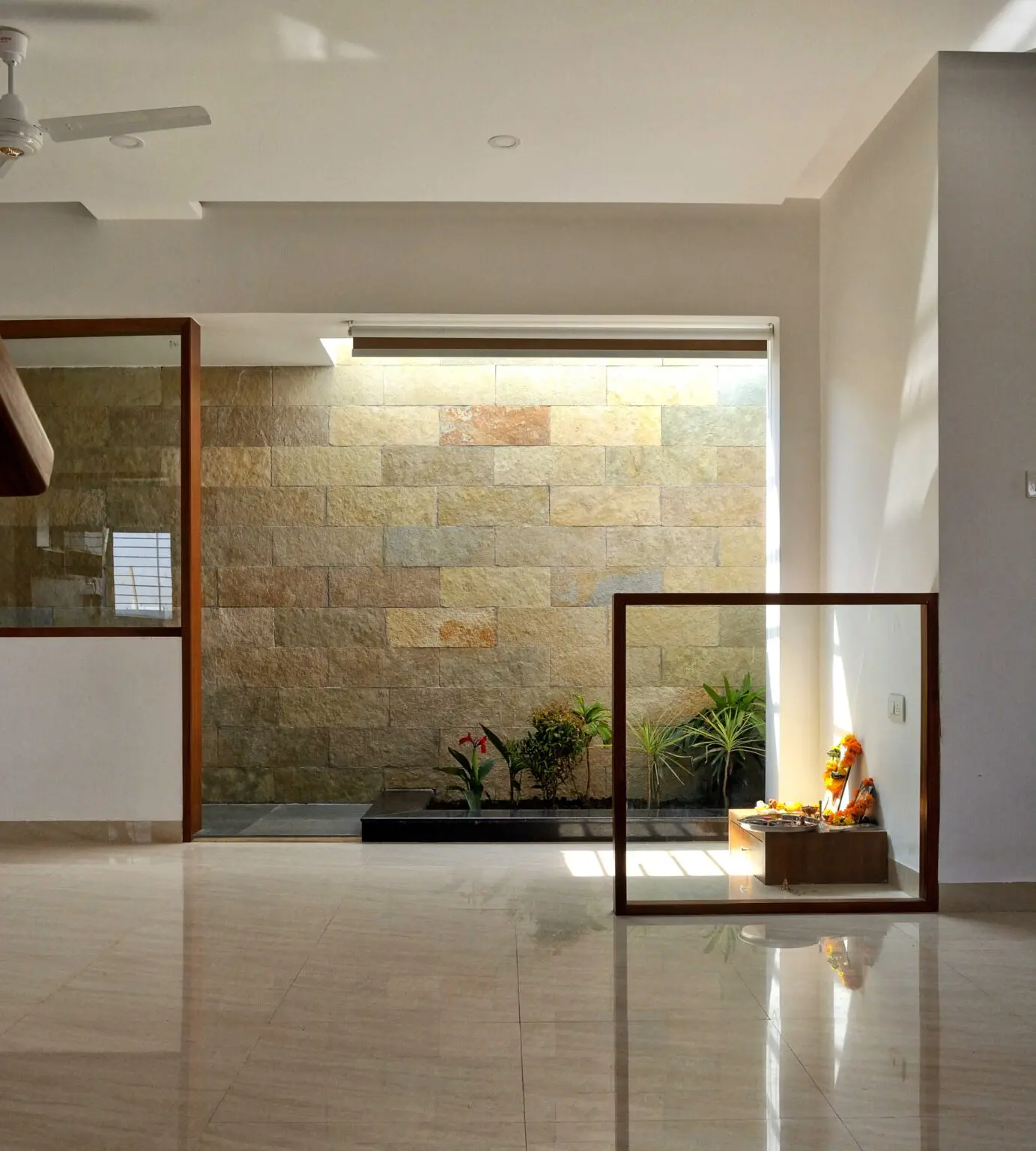 The wall underneath the skylight is cladded using yellow Shahabad stone which acts as a natural canvas for the light entering through the skylight and a perfect backdrop for the living area.