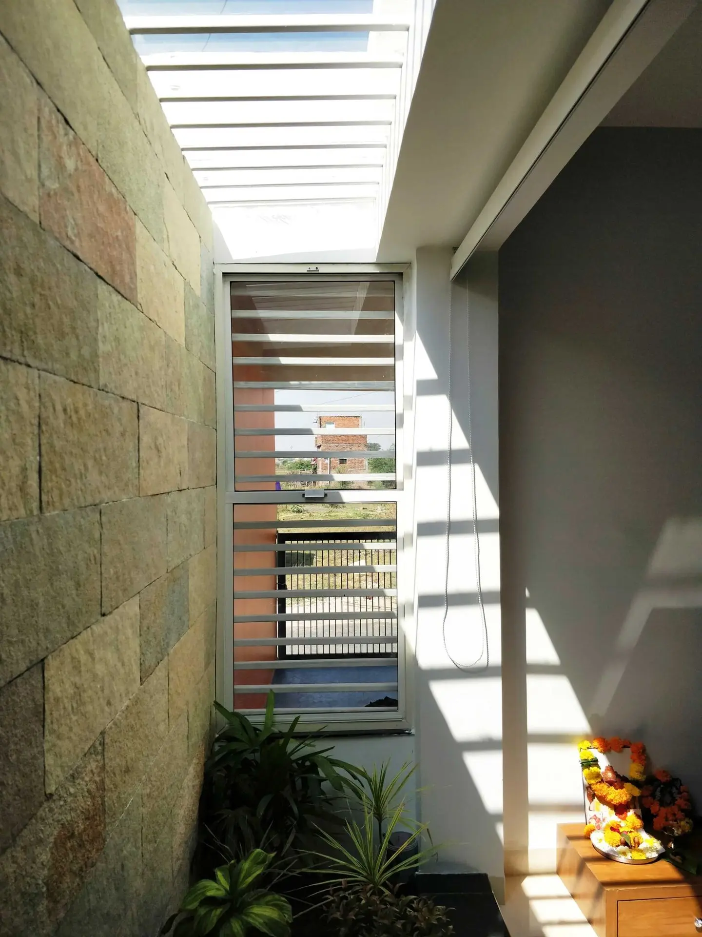 We felt a strong need to bring nature into the house by creating green pockets and emphasizing the natural light penetrating through the volume. We have incorporated a small court adjoining the living and dining area with an overhead skylight creating the drama of light and shadows within the house.