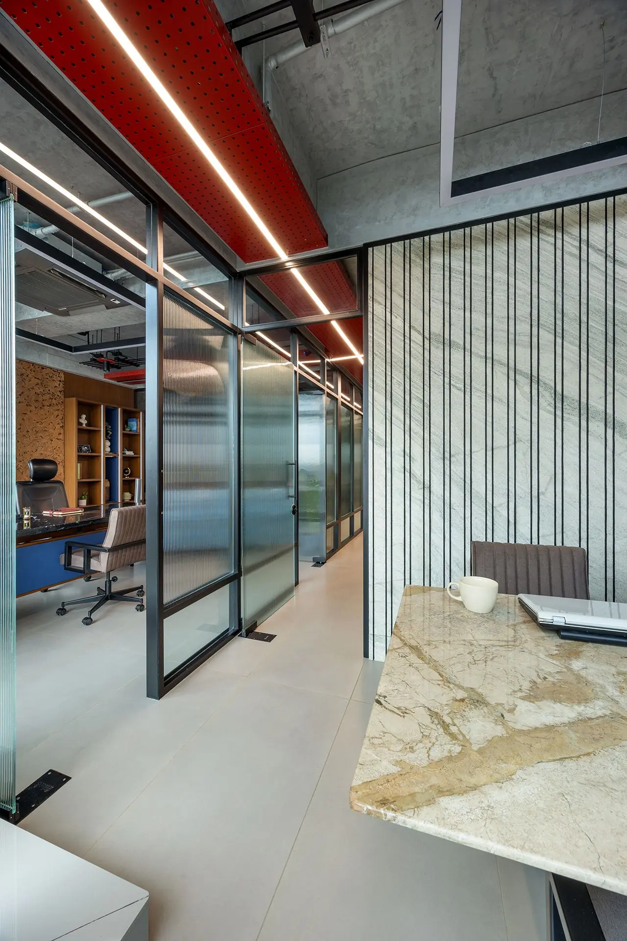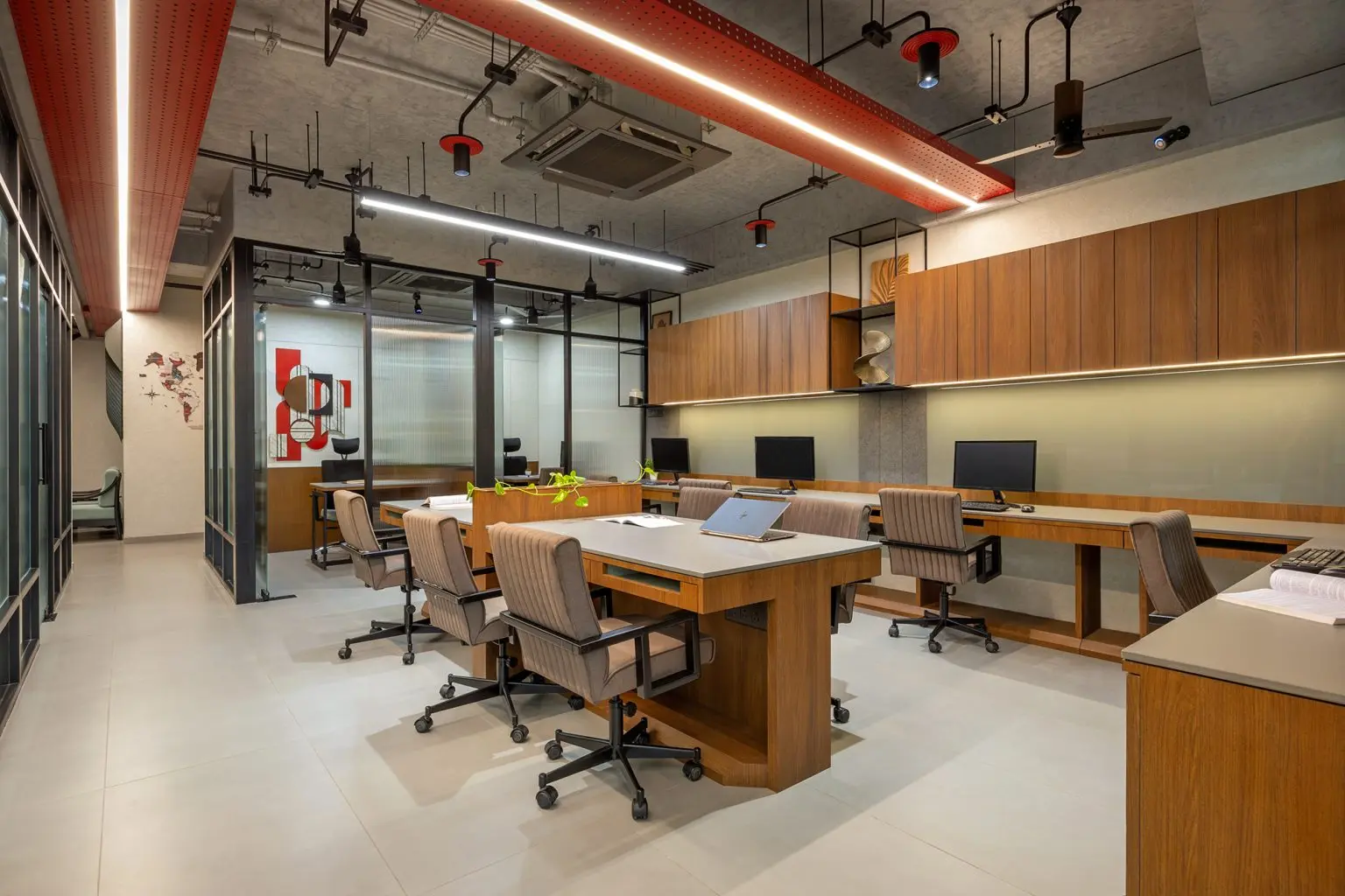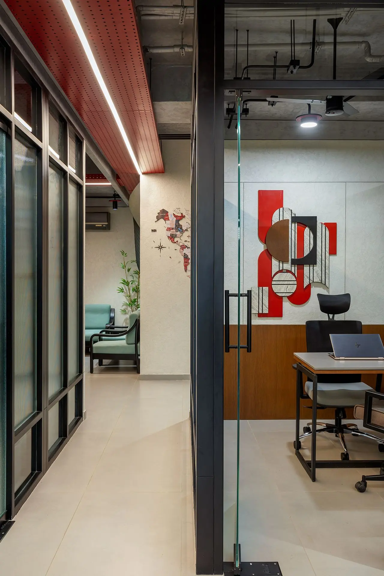 wallpaper and the bold red light box on the ceiling, reinforcing the office’s