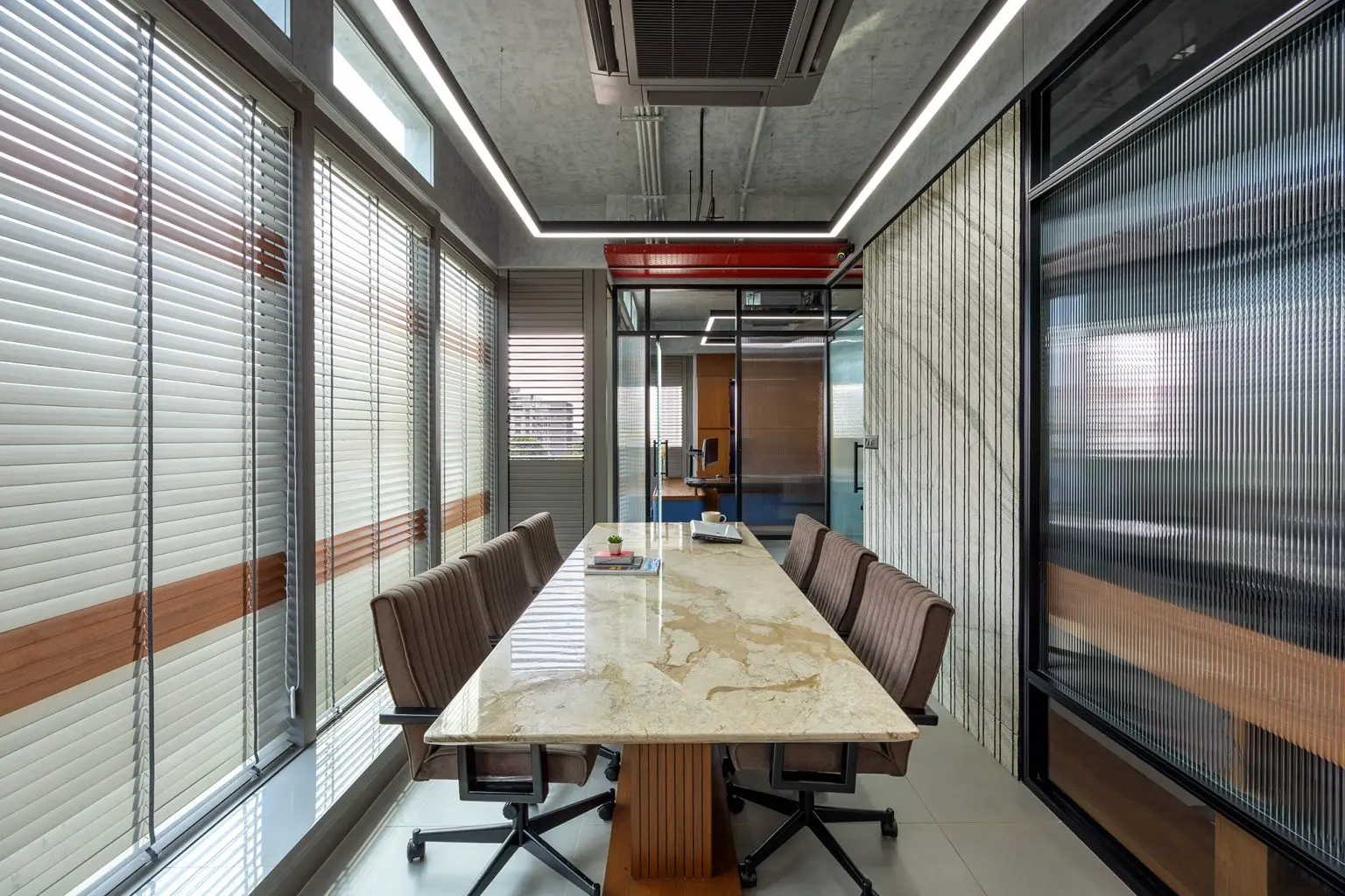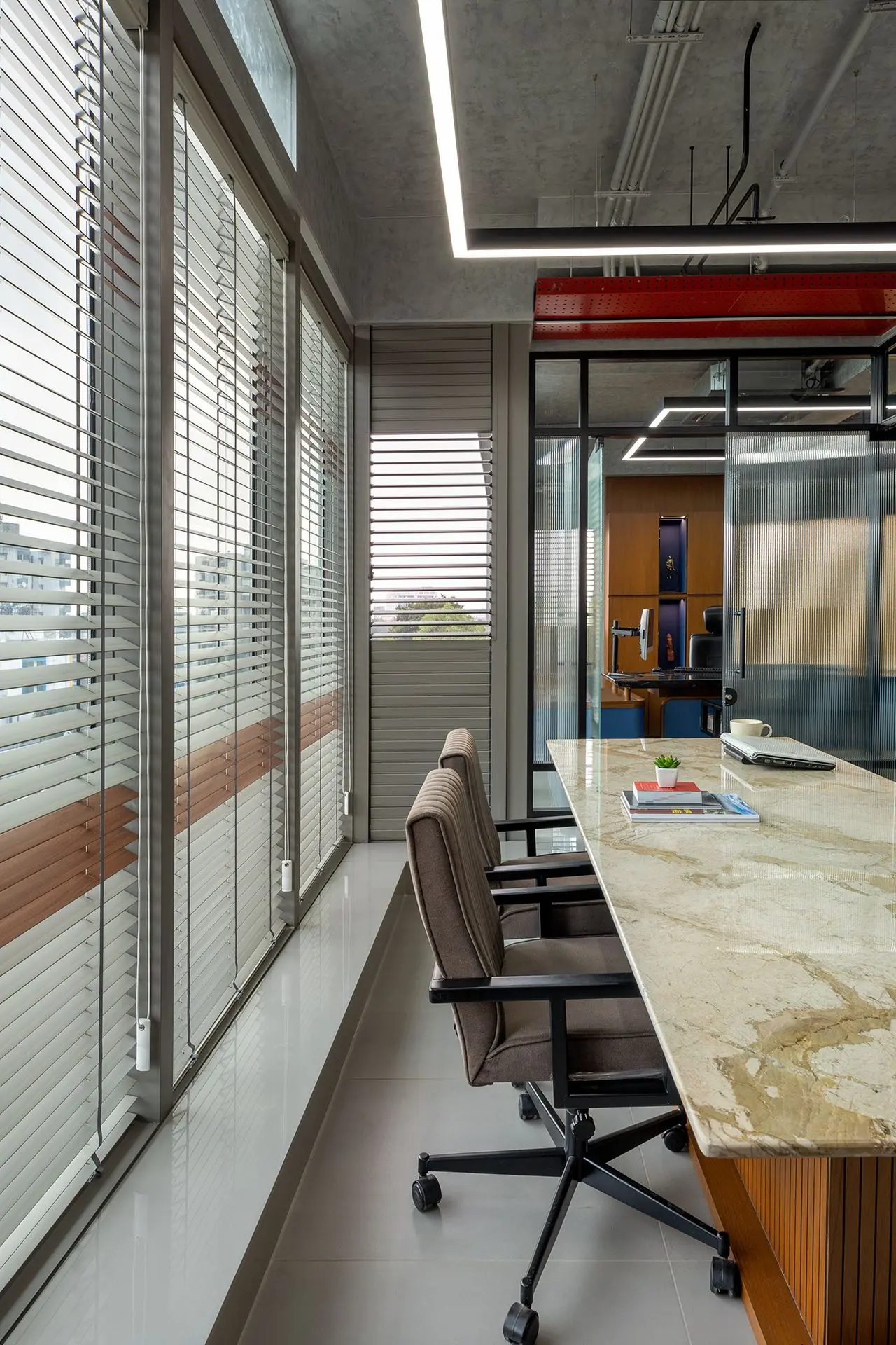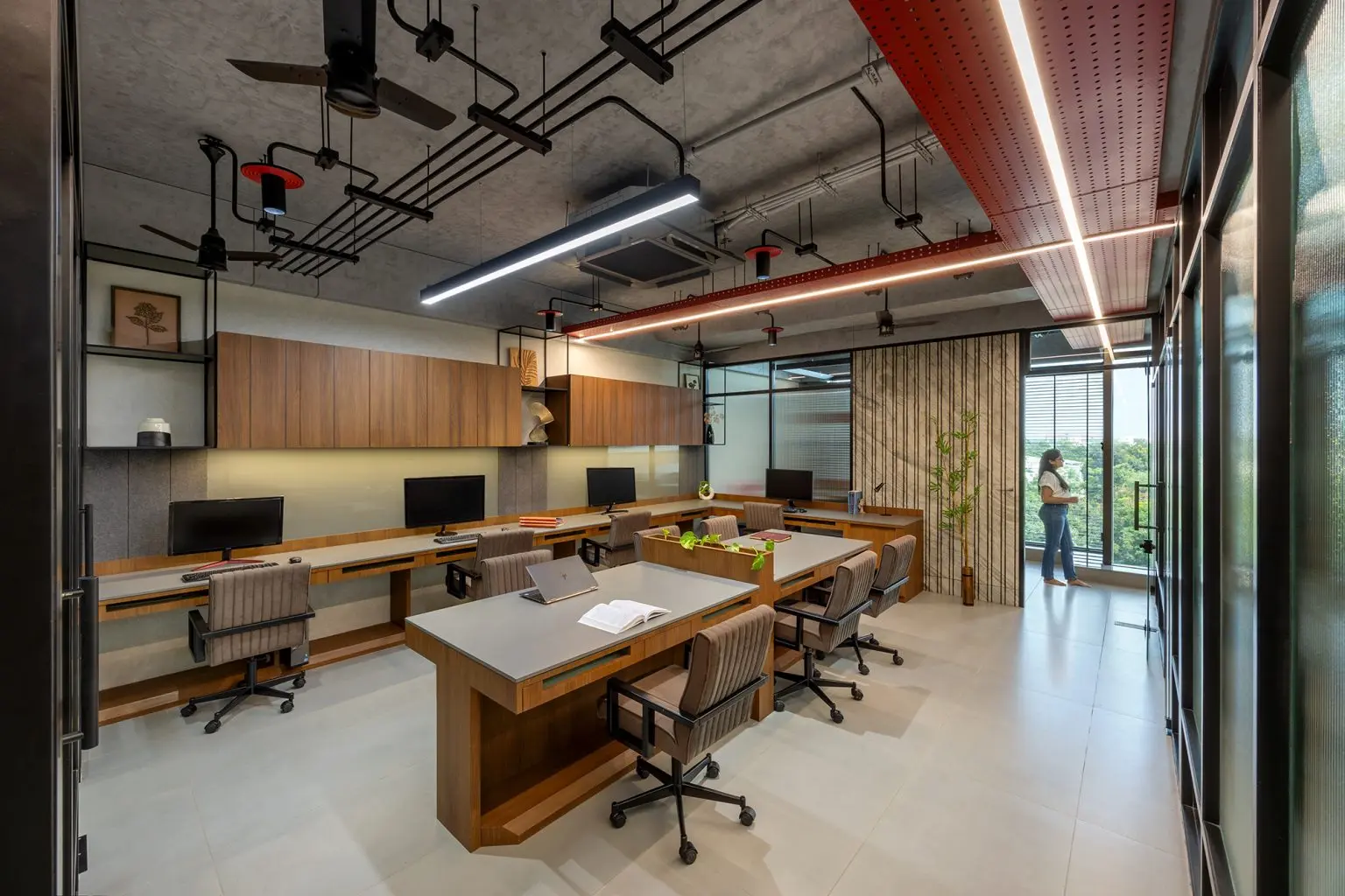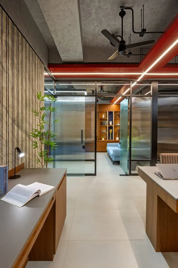 wallpaper and the bold red light box on the ceiling, reinforcing the office’s