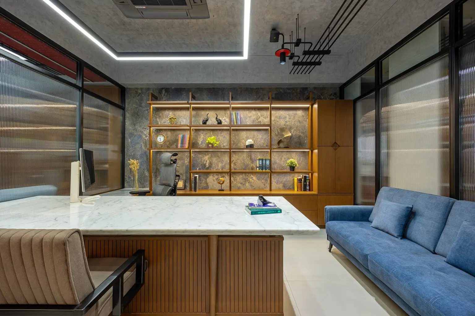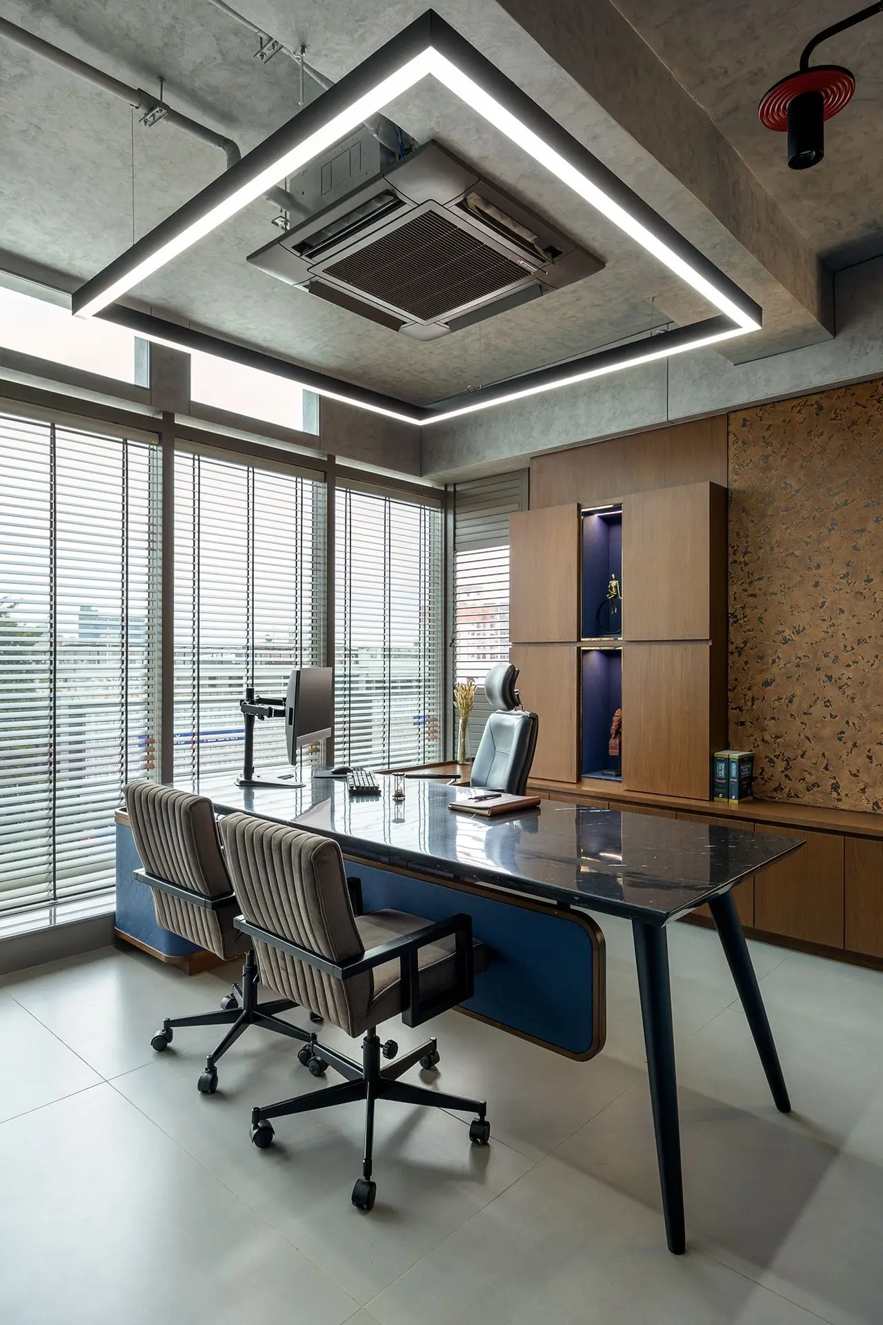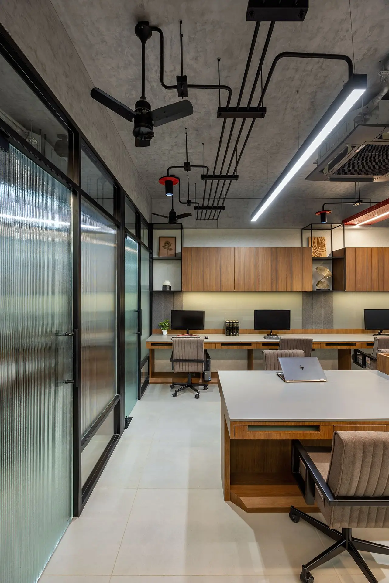 space with an industrial yet polished aesthetic. Surface-mounted ceiling lights,