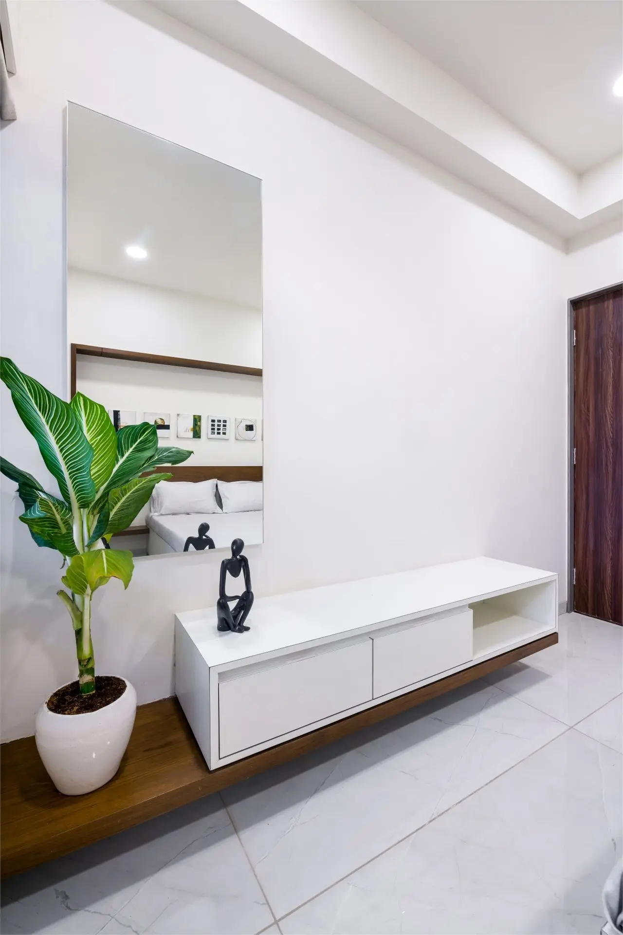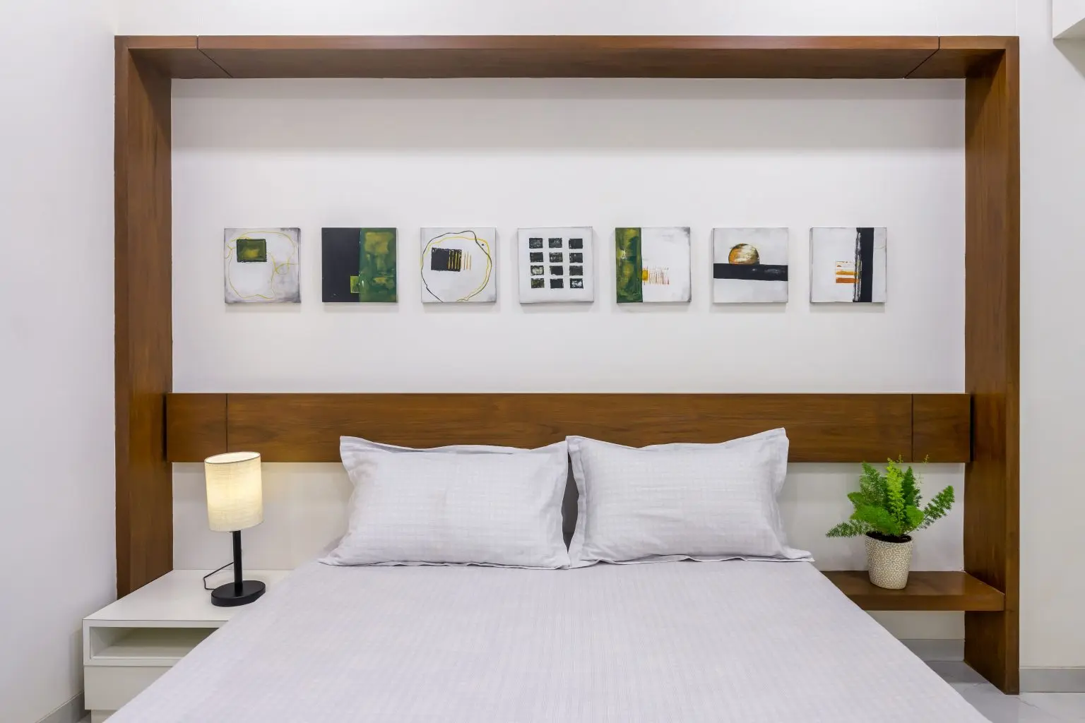 The third bedroom appears to have a minimalistic style with a touch of modern design elements. The space is dominated by white walls with accents of brown from the wooden headboard and surrounding frame. The series of artworks displayed above the headboard adds a personal touch and visual interest.