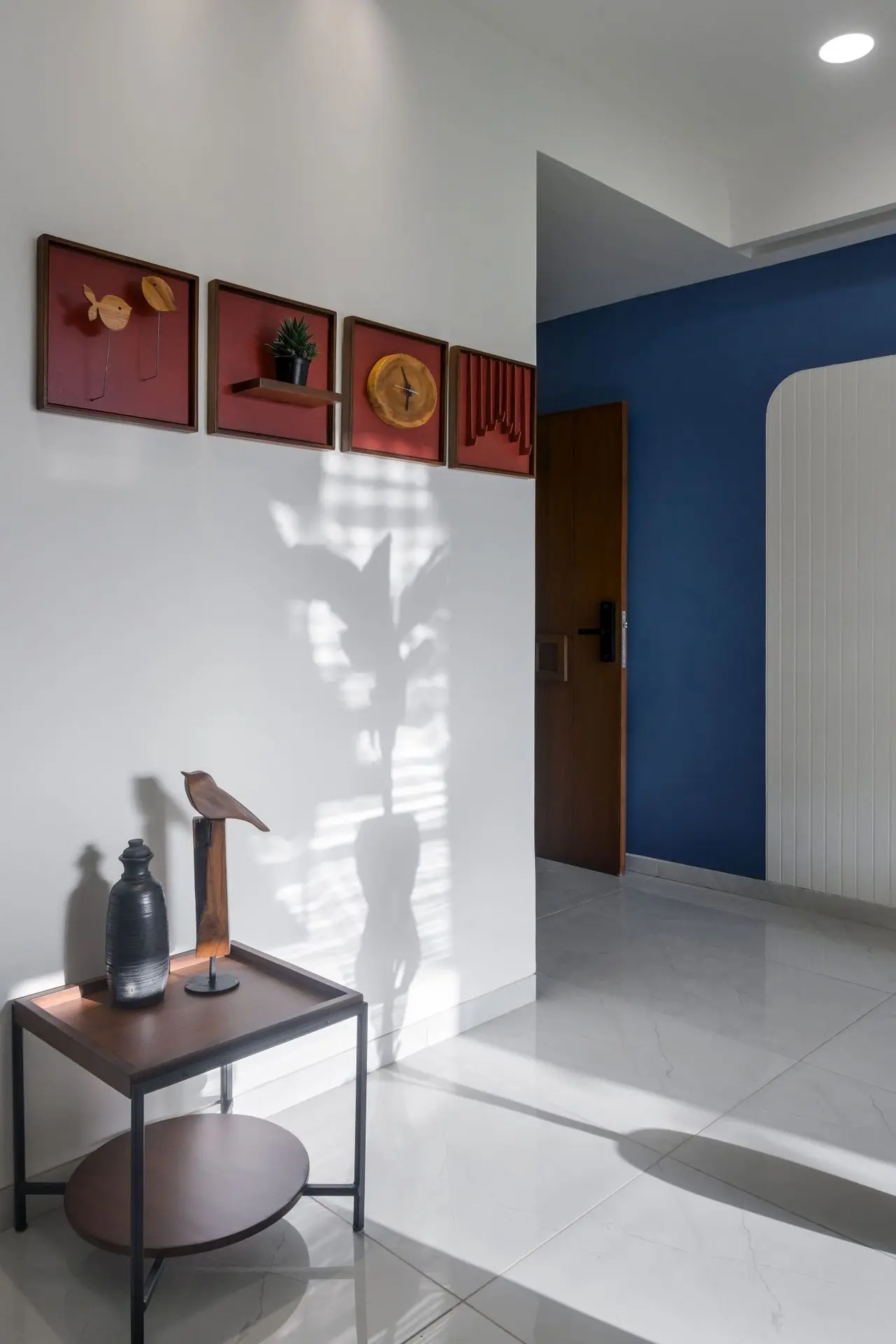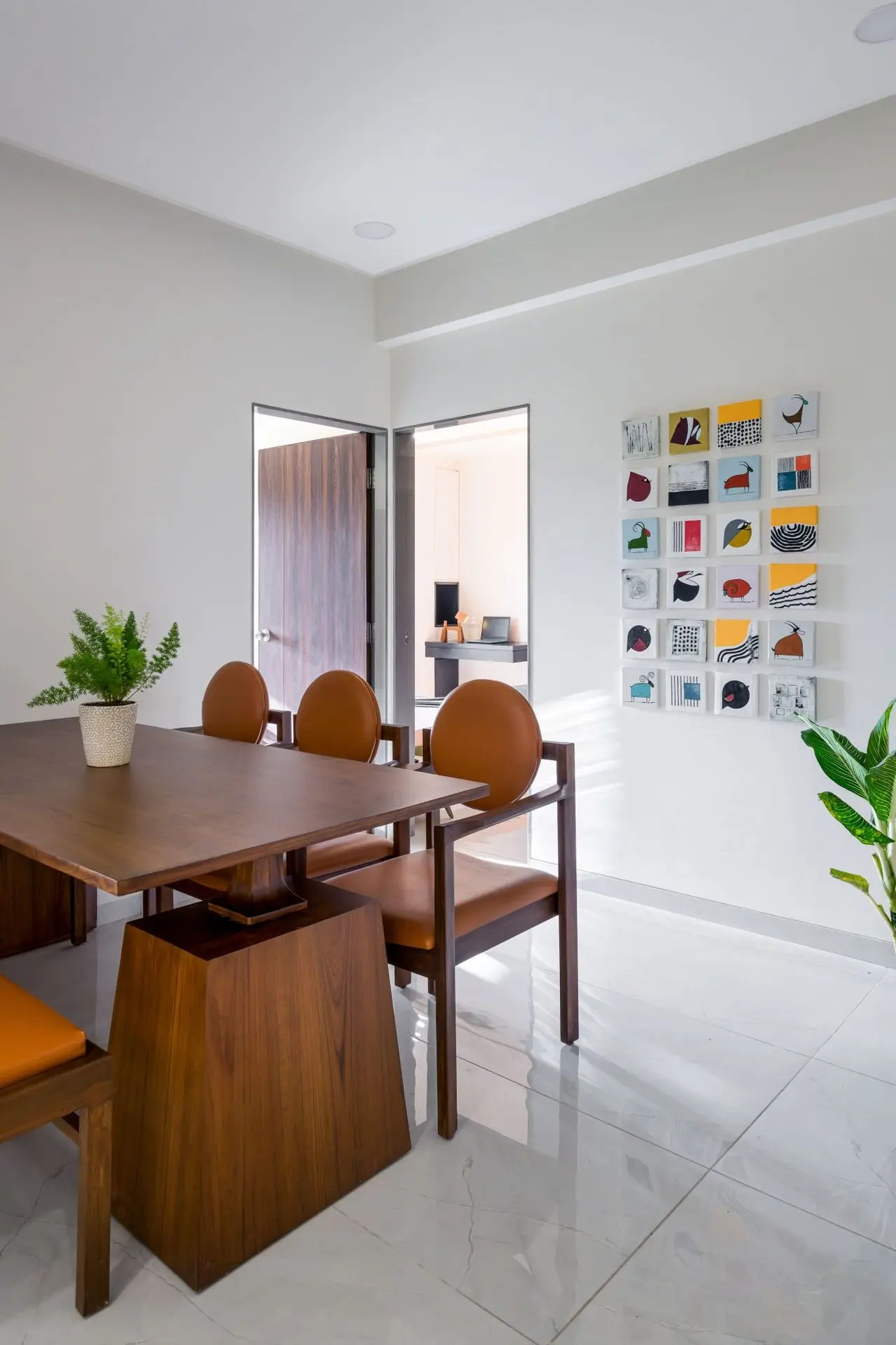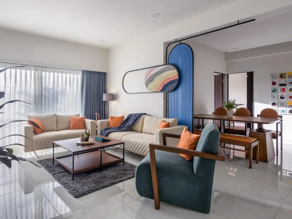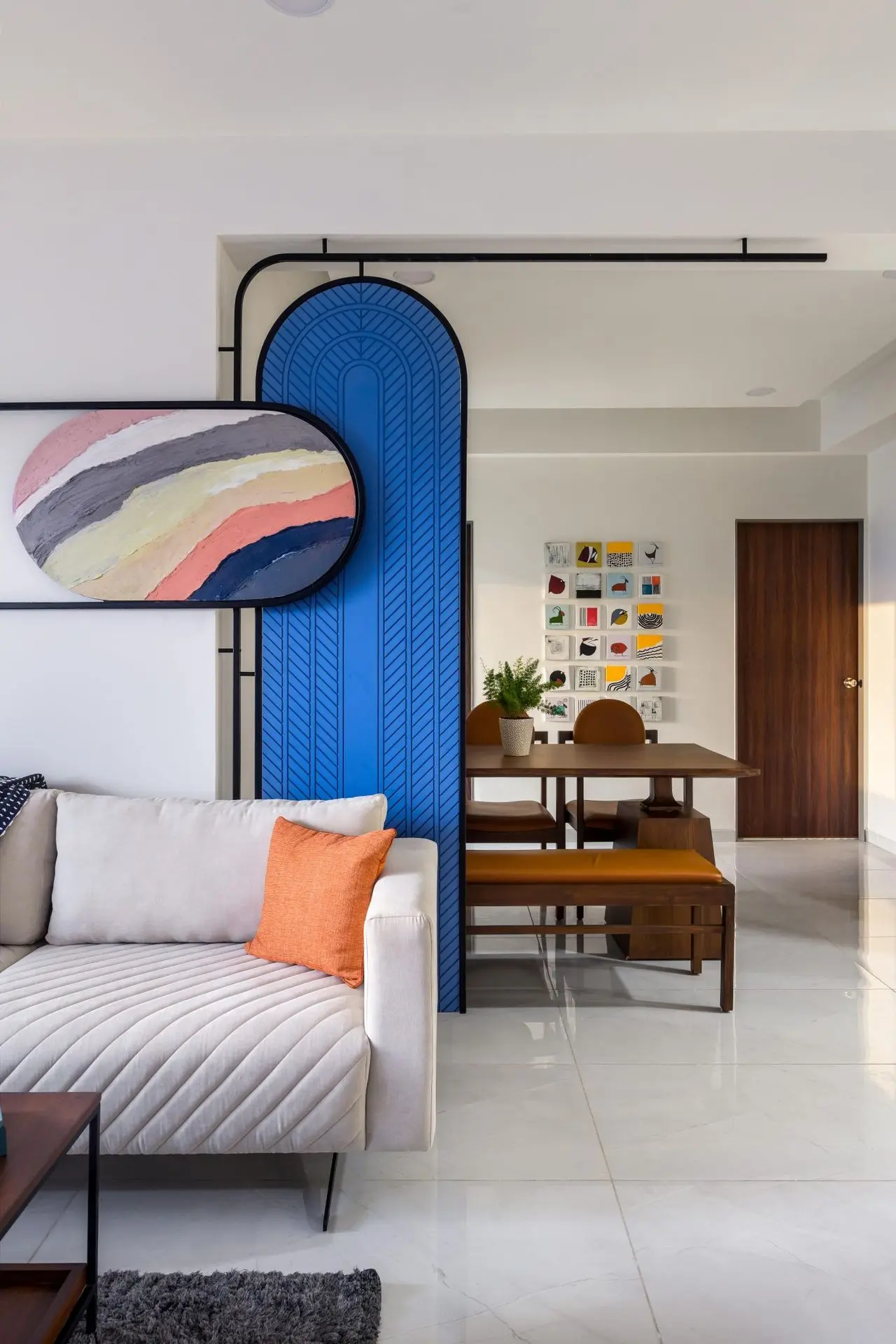 The dining area comprises of wooden dining table, providing a warm contrast to the vibrant blue partition. While the seating comprises of one bench and an upholstered chairs covered in a tan shade ,merges well with the overall space. The space is further enhanced by a wall displaying a collection of colorful abstract artworks, creating a focal point.