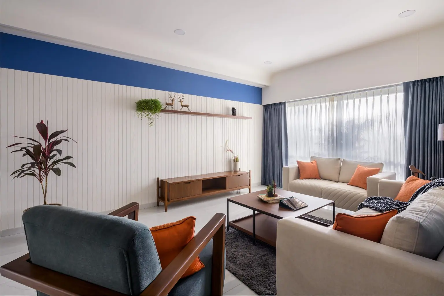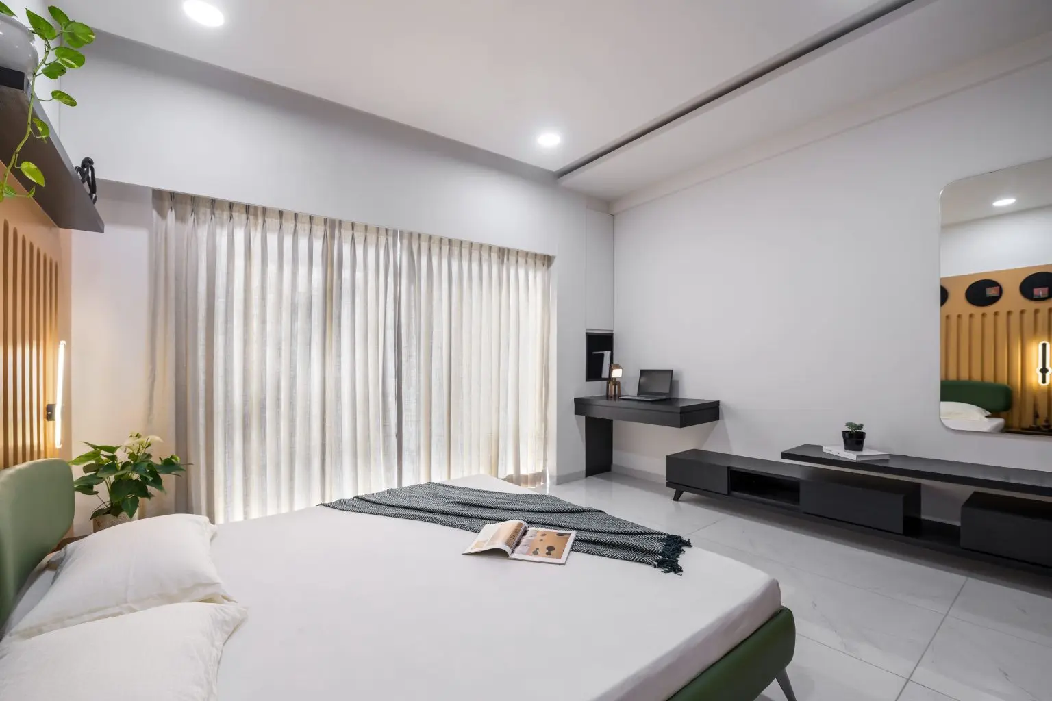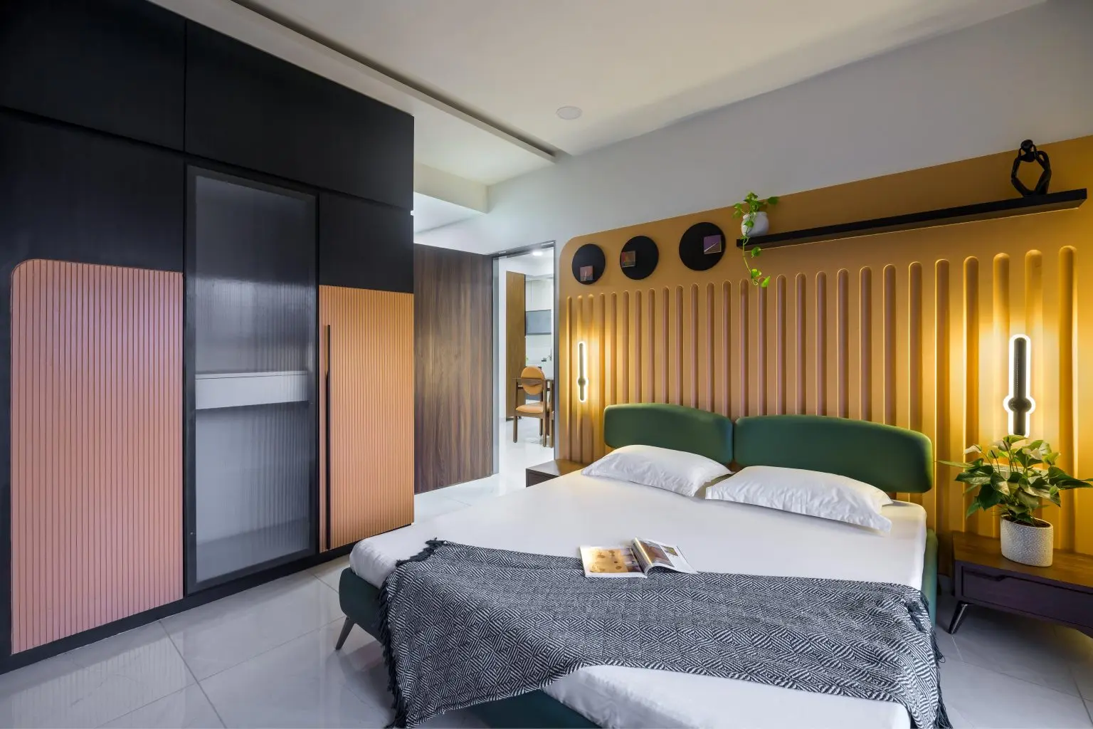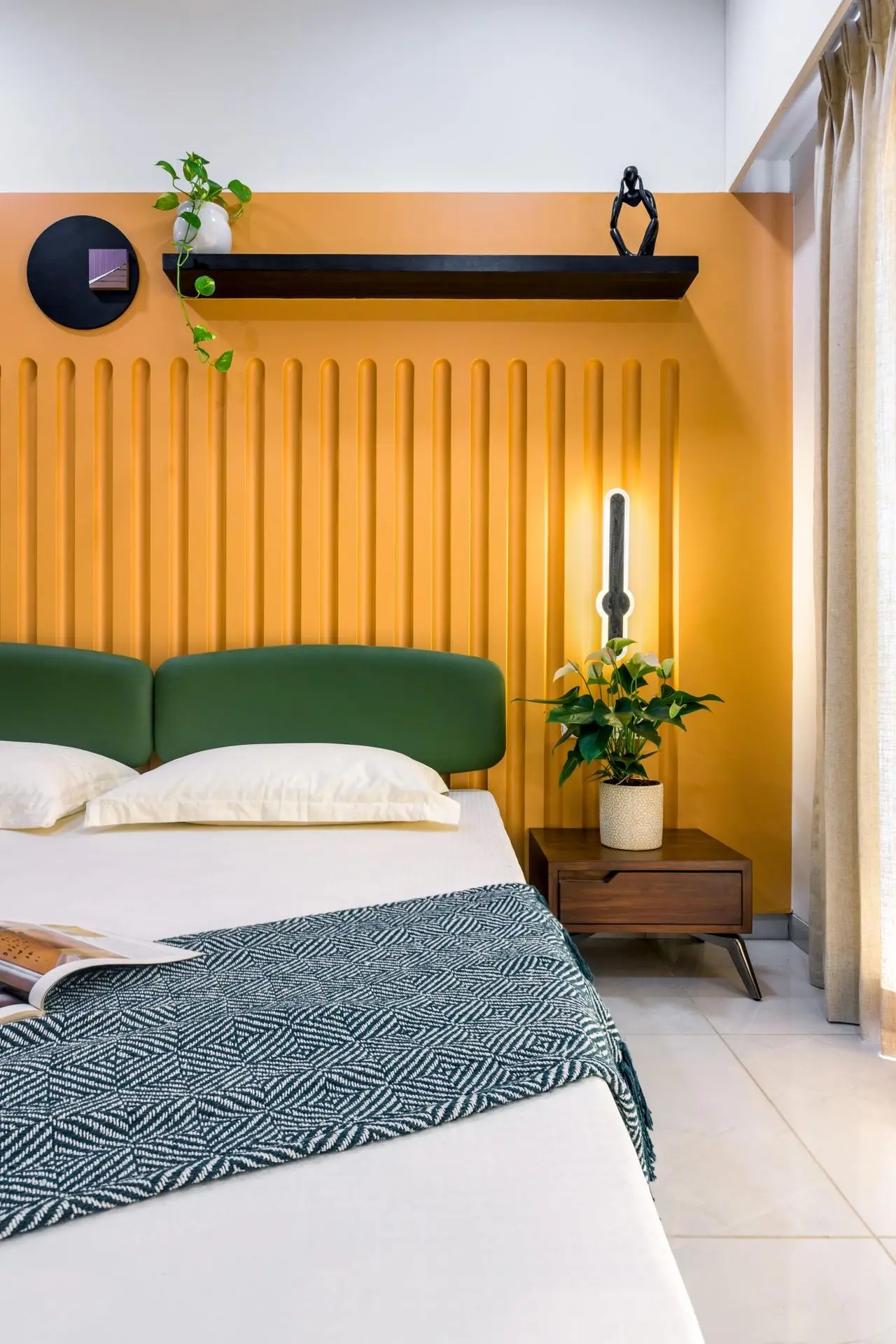 The first bedroom showcases a vibrant and contemporary design with a focus on bold colors and geometric shapes. The focal point is the striking orange wall with its sleek vertical lines creating a dynamic and eye catching backdrop. The bed with its clean lines and plush green upholstery adds a touch of sophistication. The addition of black color, like in TV unit, shelves and artwork introduces a sense of contrast and balance.