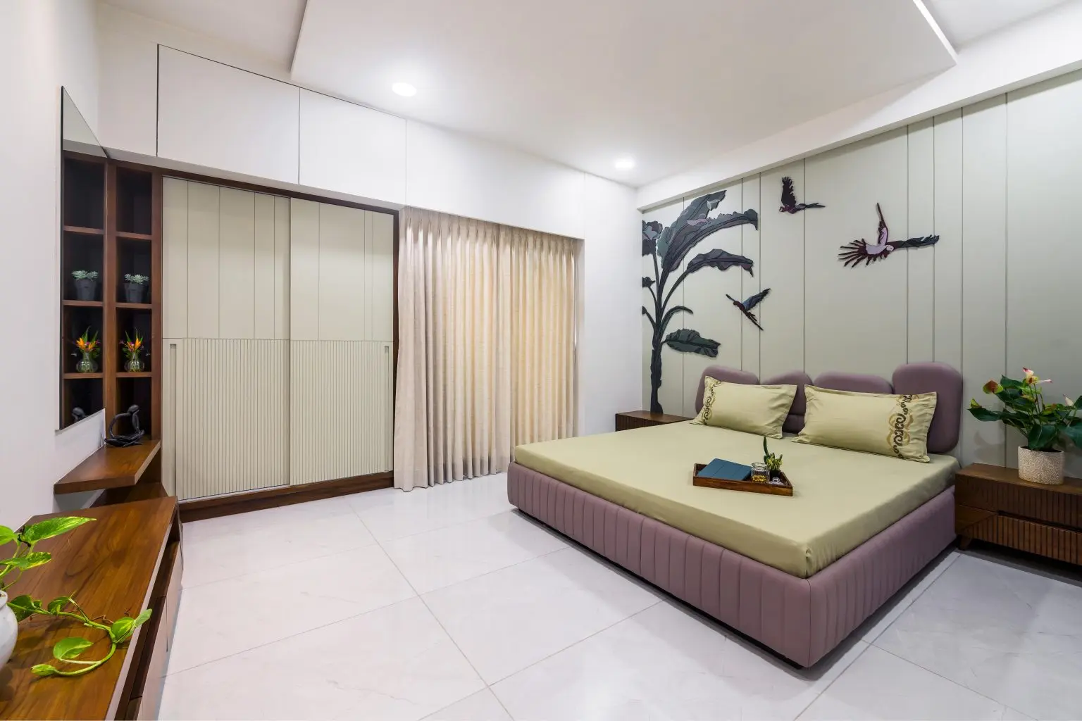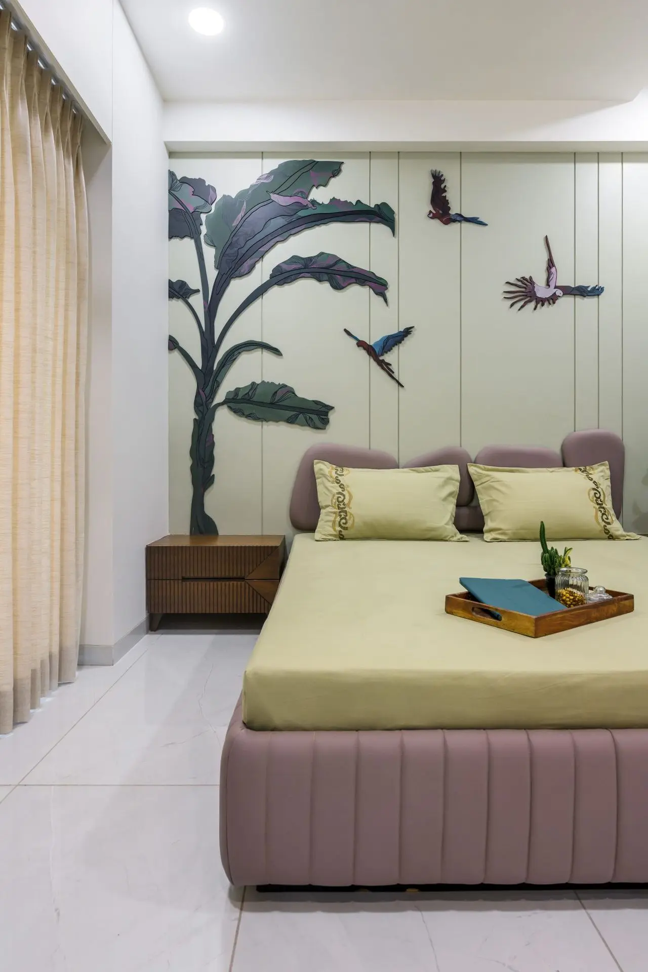 The second bedroom showcases a serene and elegant design. The focal point in the wall having intricate artwork depicting a tree branch, leaves and birds creates a sense of calmness and bringing the outdoors in. The soft beige wall and an upholstered headboard in mauve tint provides a calming backdrop.