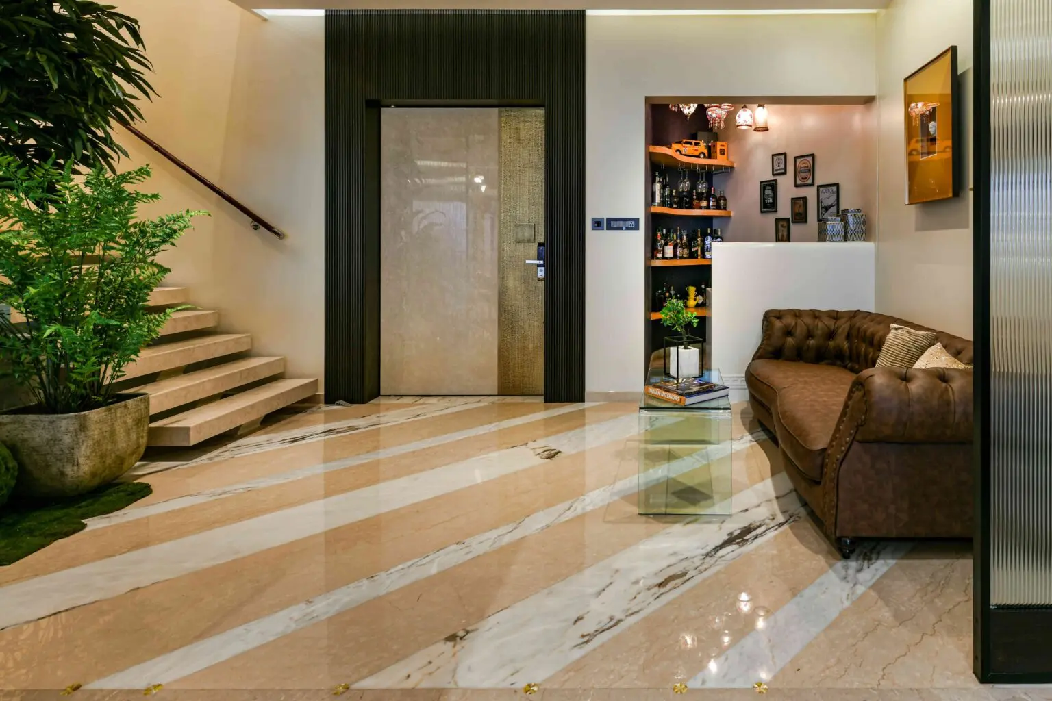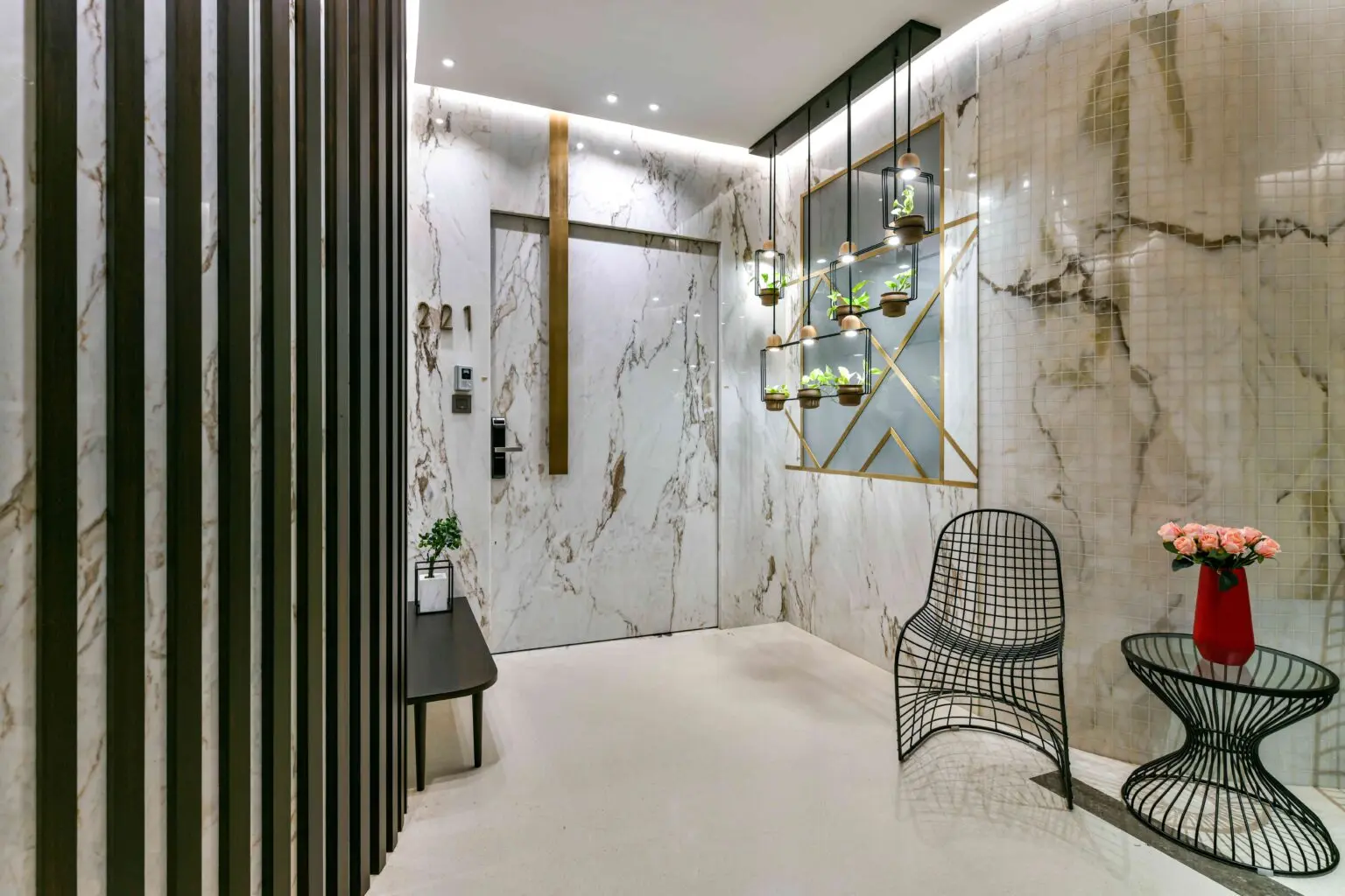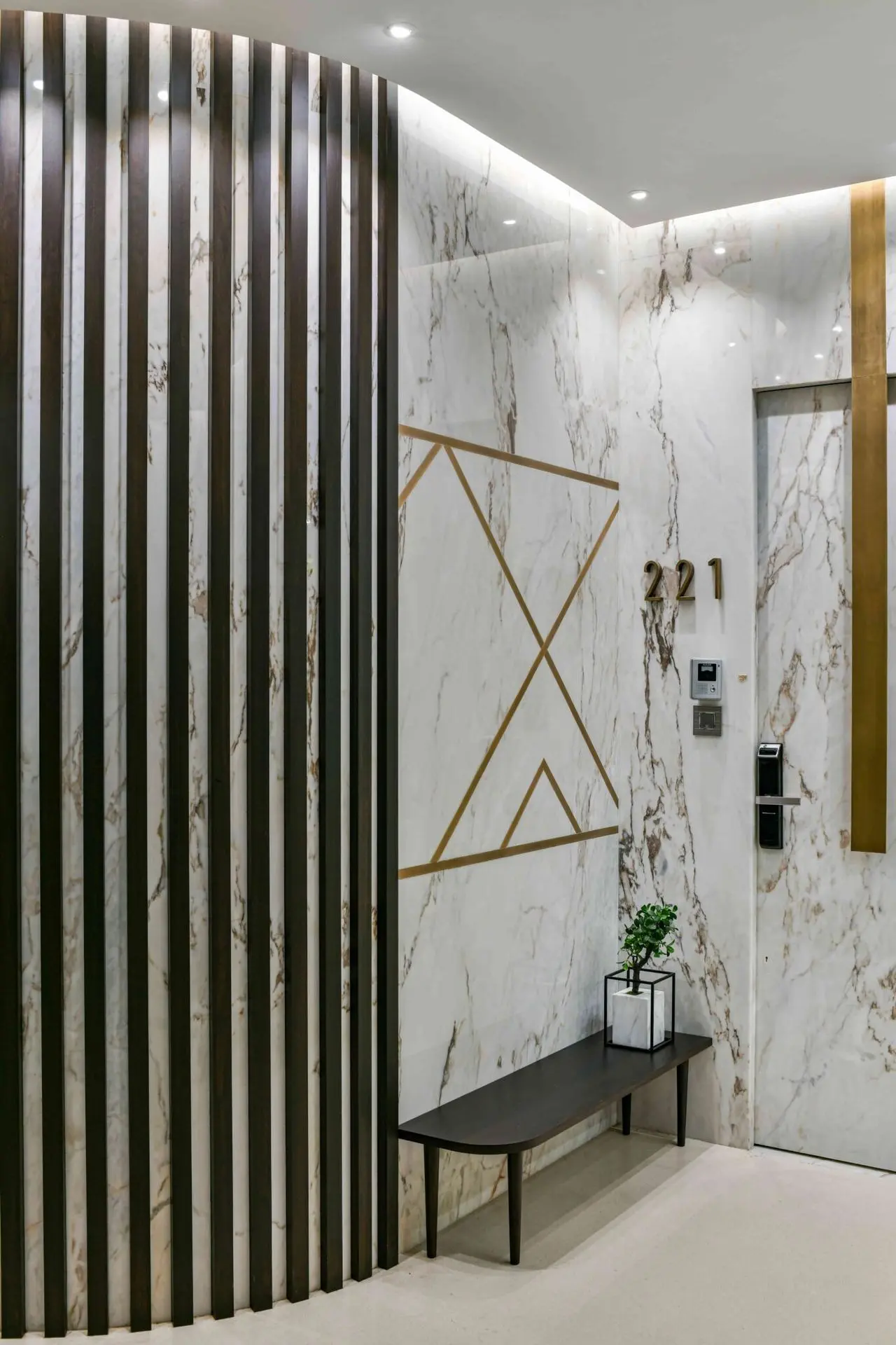 The entrance lobby outside the house has been done up completely in Michaelangelo marble. Including the door, all vertical surfaces has been done up in the marble.