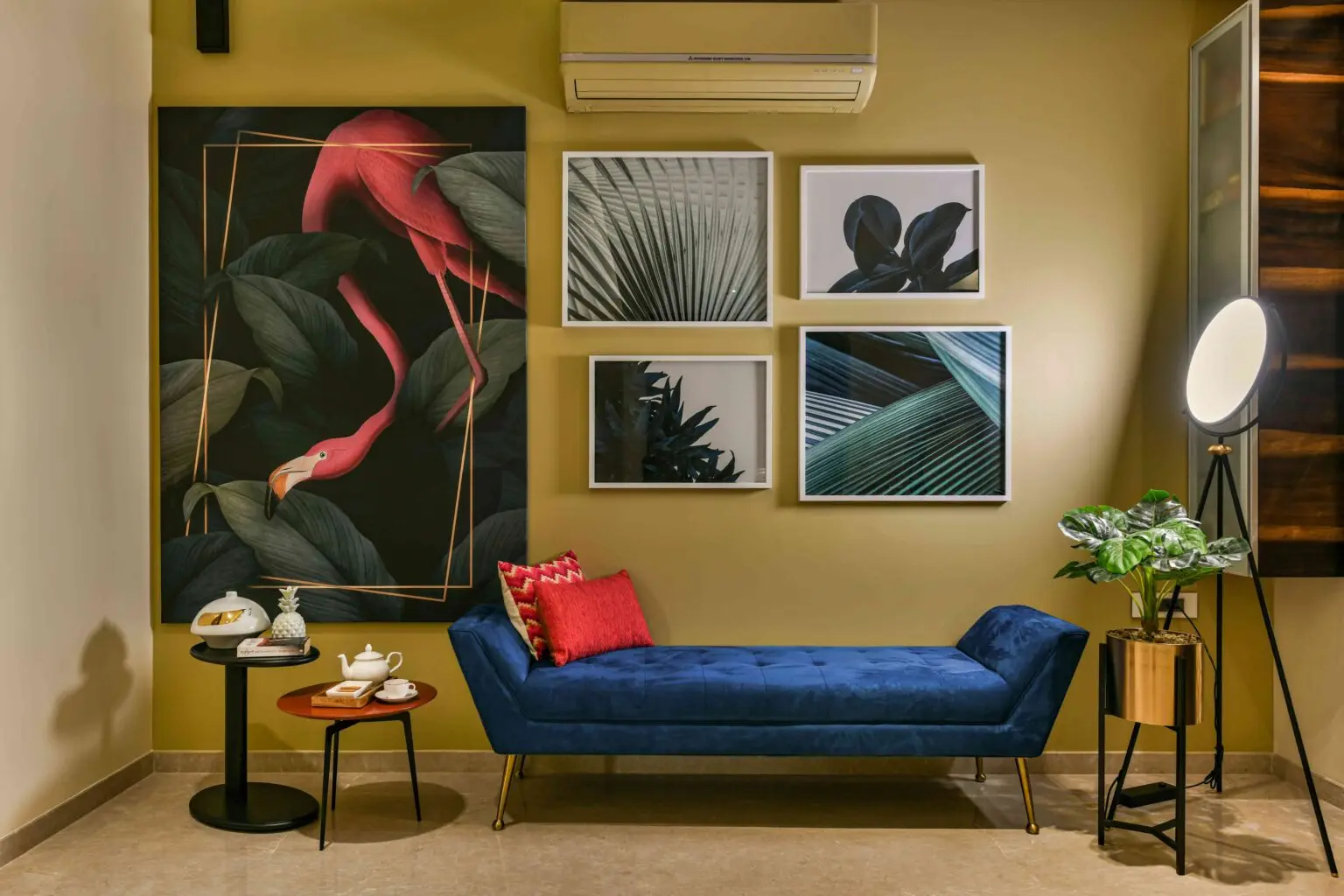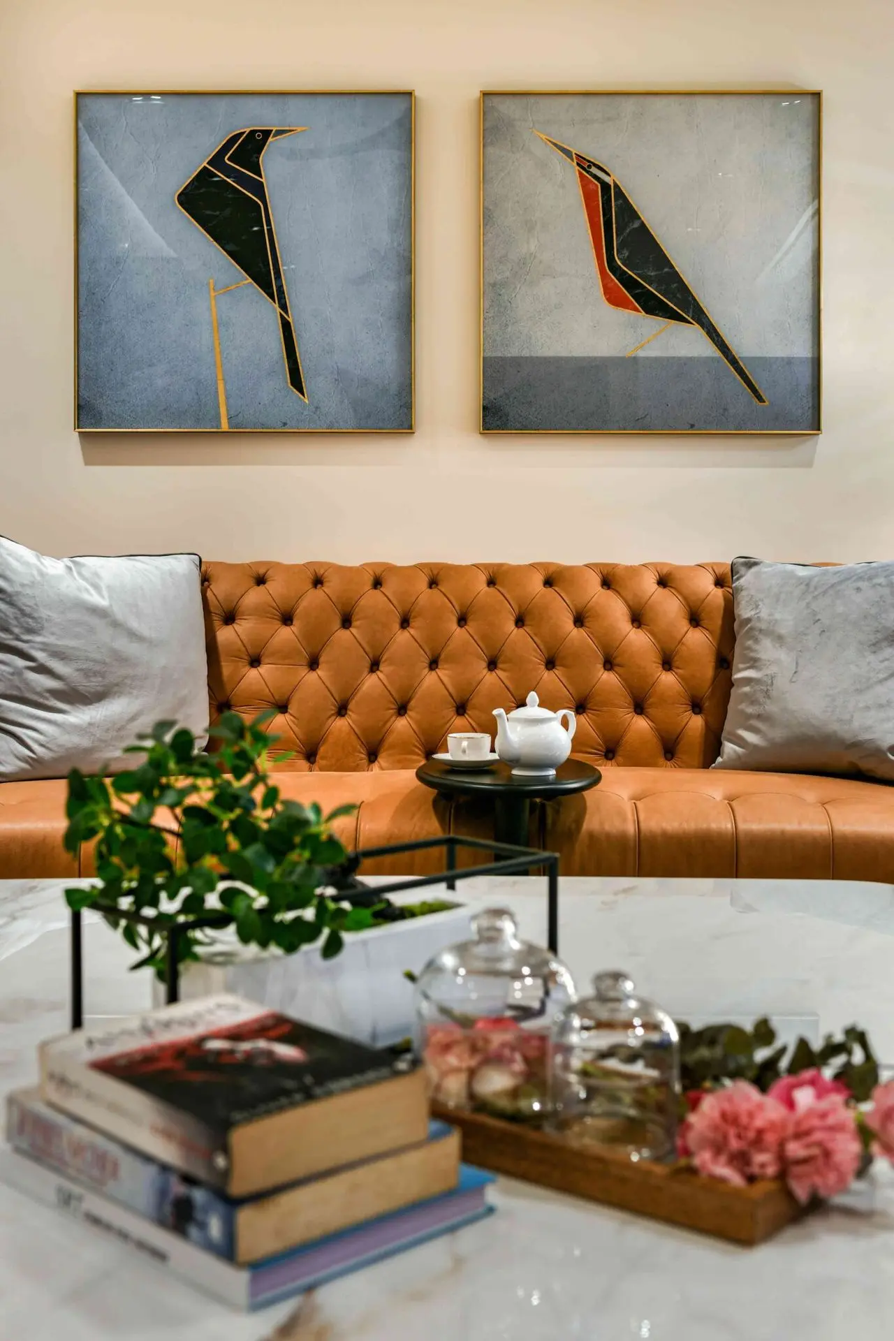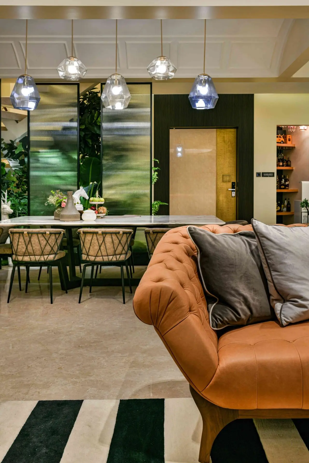 A glass centre table has been provided so that the floor pattern is not disturbed by the furniture pieces. A small niche in the corner has been converted into a bar.