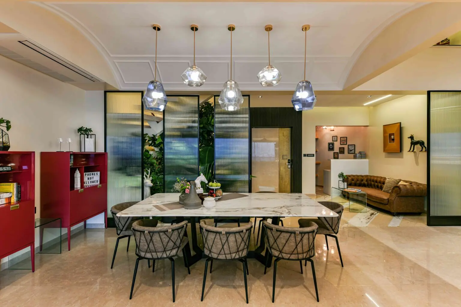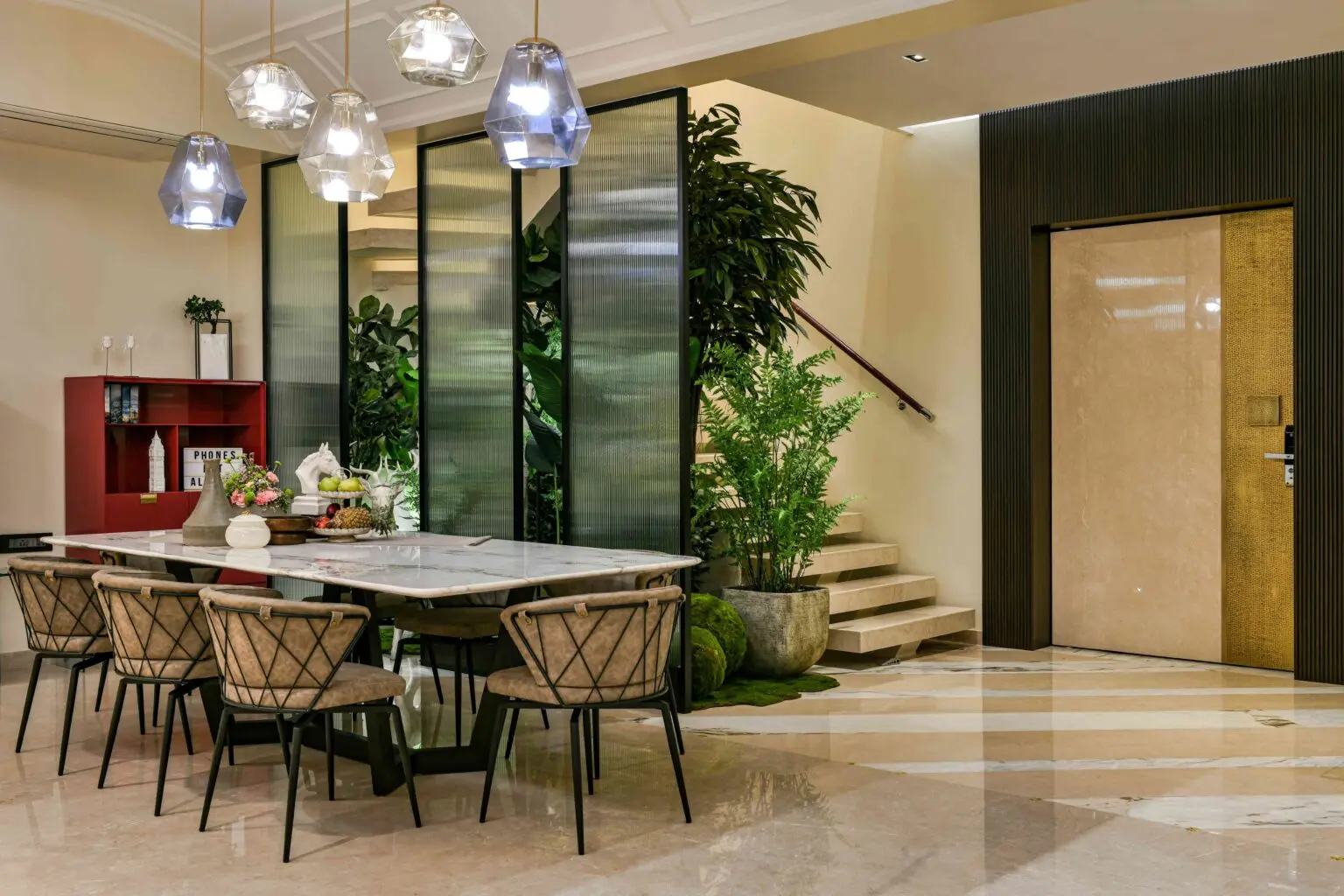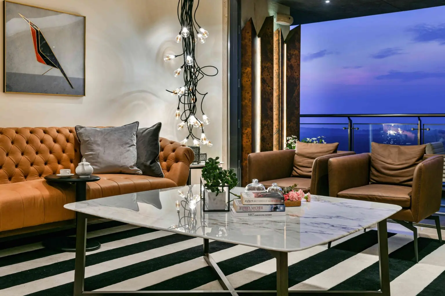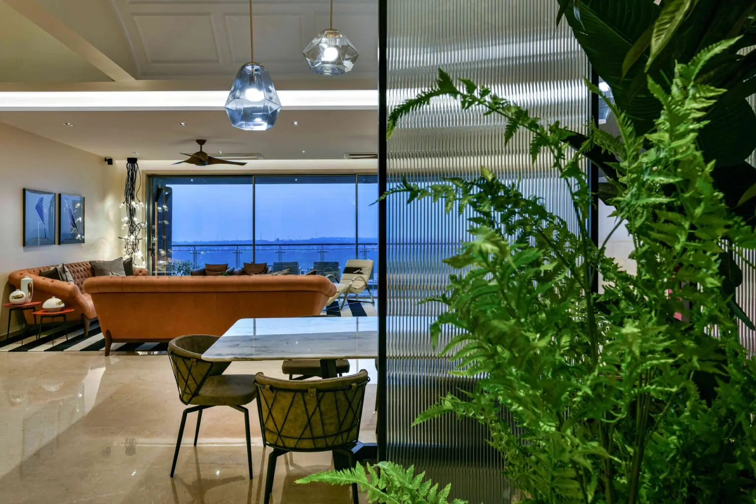 The floor-to-ceiling windows in most of the rooms add up its beauty, highlighting it more by vertical furniture designs and panelling.