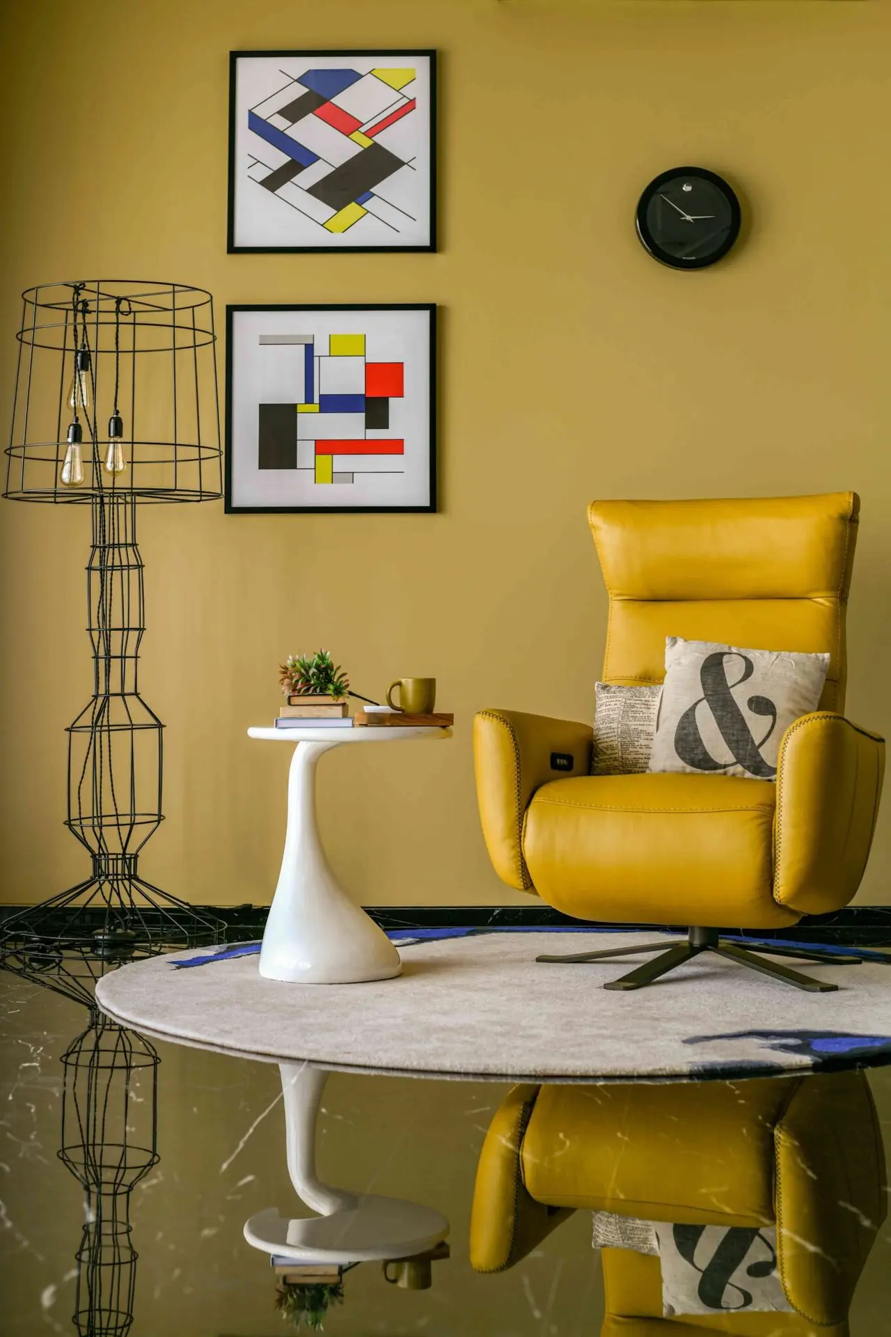 A wire mesh tall floor lamp and wall art adore the wall. An armchair in leather and coffee table complete is a relaxing and comfy corner in the bedroom.
