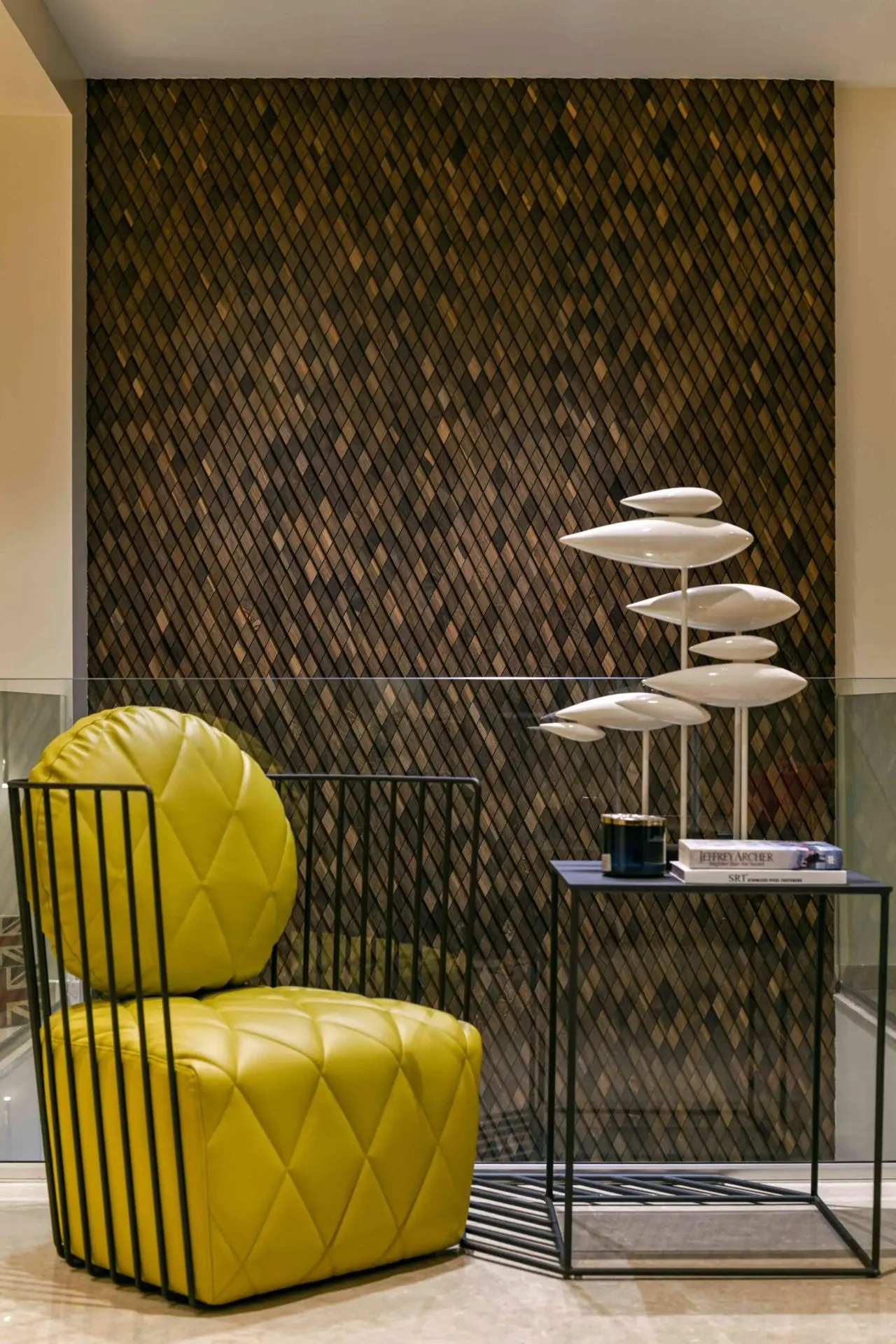The double height Void overlooking the breakfast table at the lower level has been cladded with diamond-shaped wooden pieces.