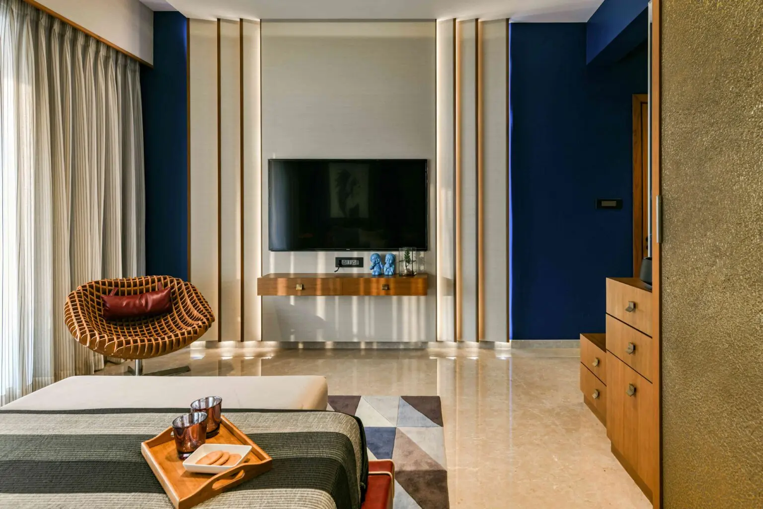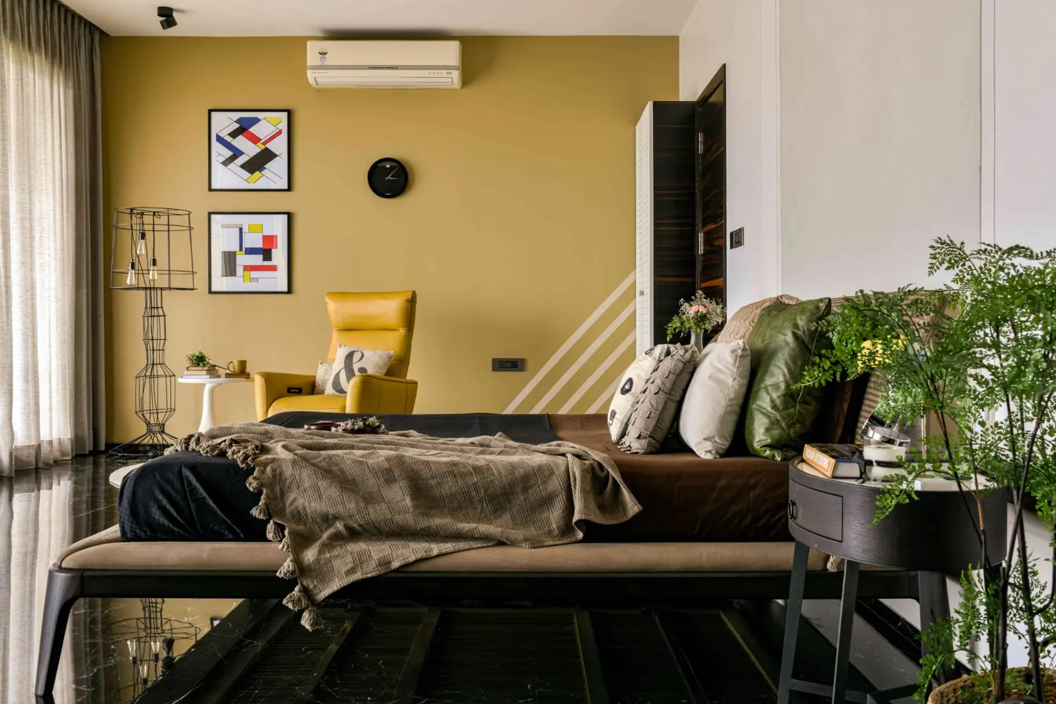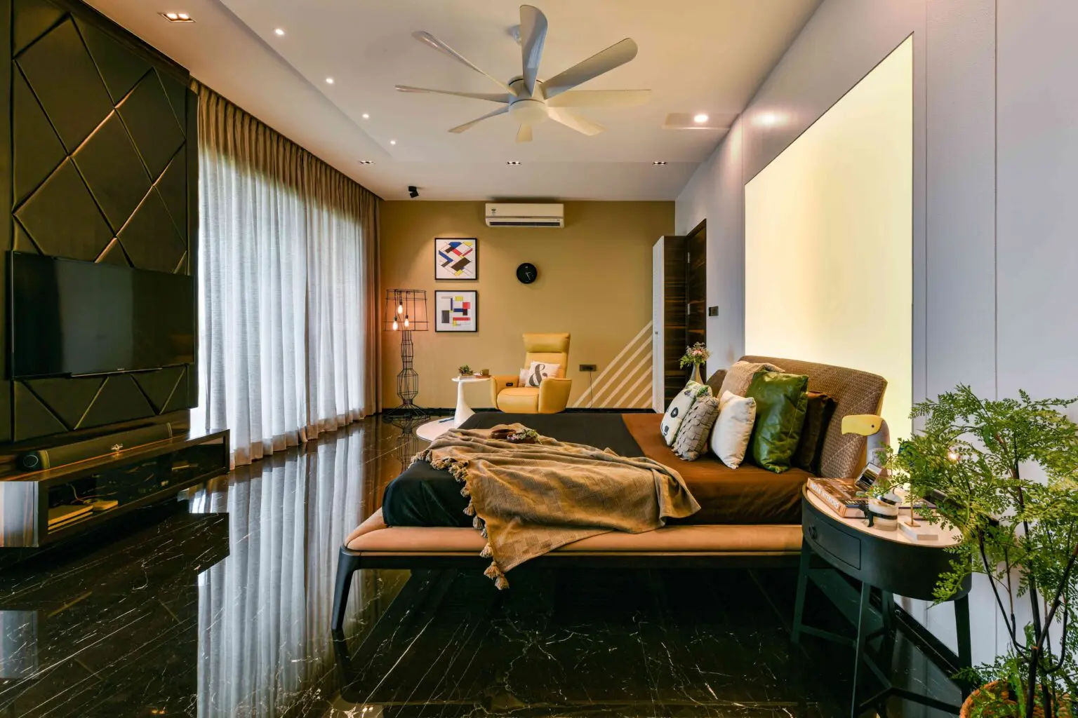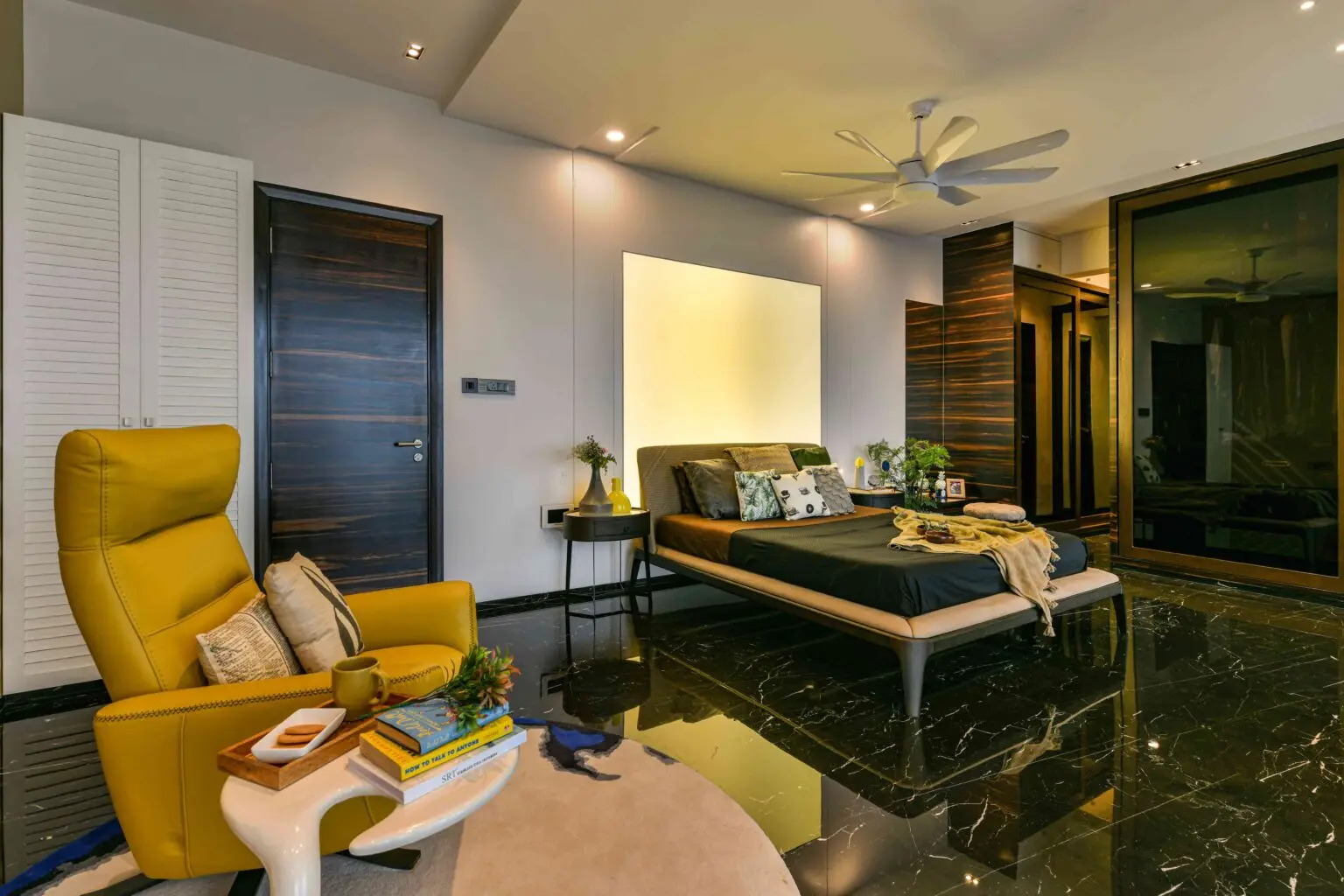 The master bedroom has a stark black Marquina marble flooring. Coloured accents inspired from a very tropical take have been used.