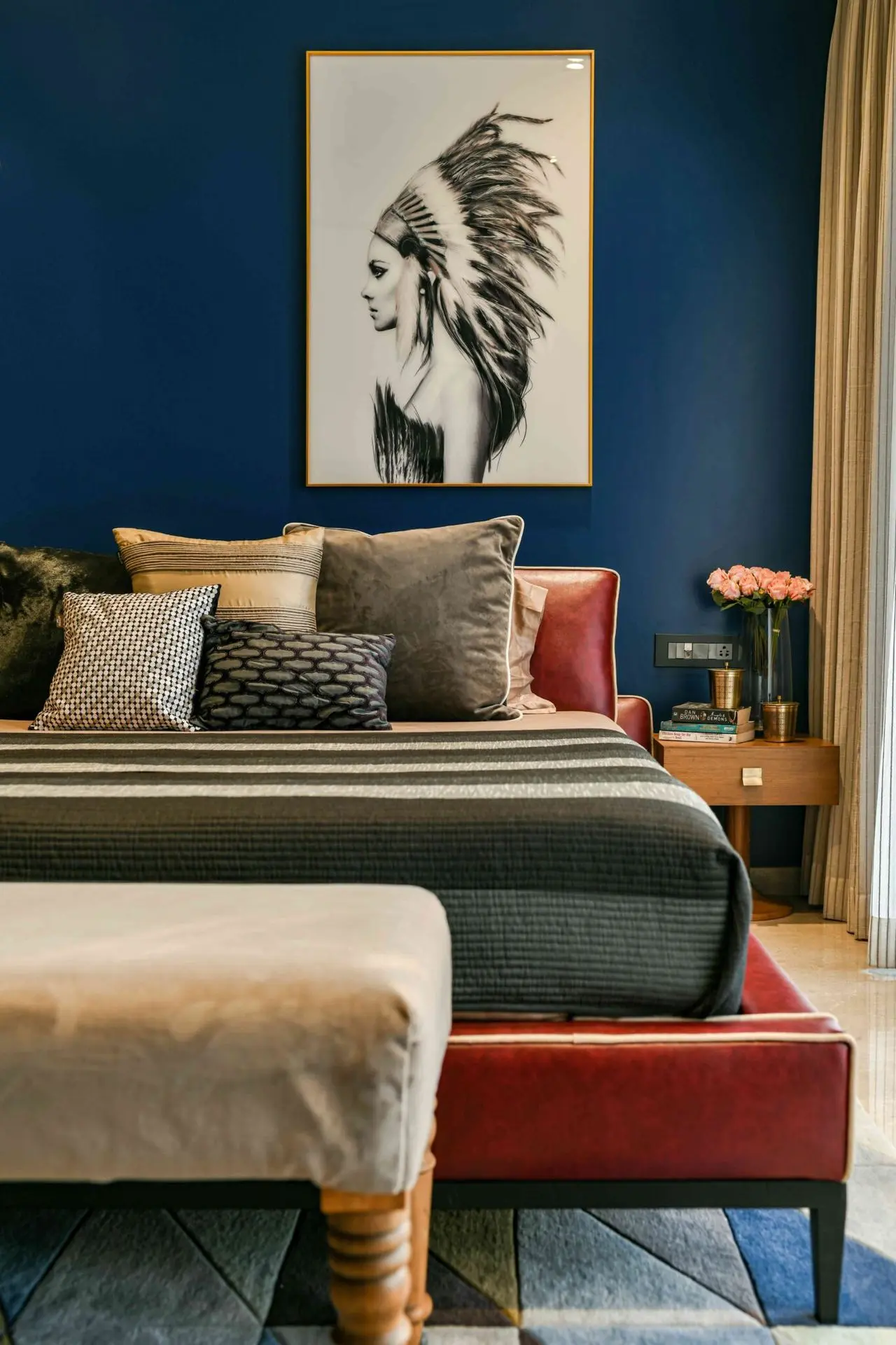 The bed back has a backlit panel. The bed itself has been cladded in suede leather. The master bedroom has a very rich South American accent and inspiration.