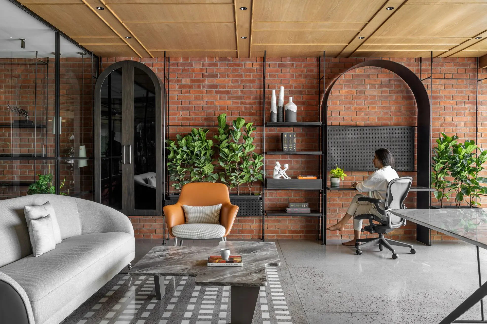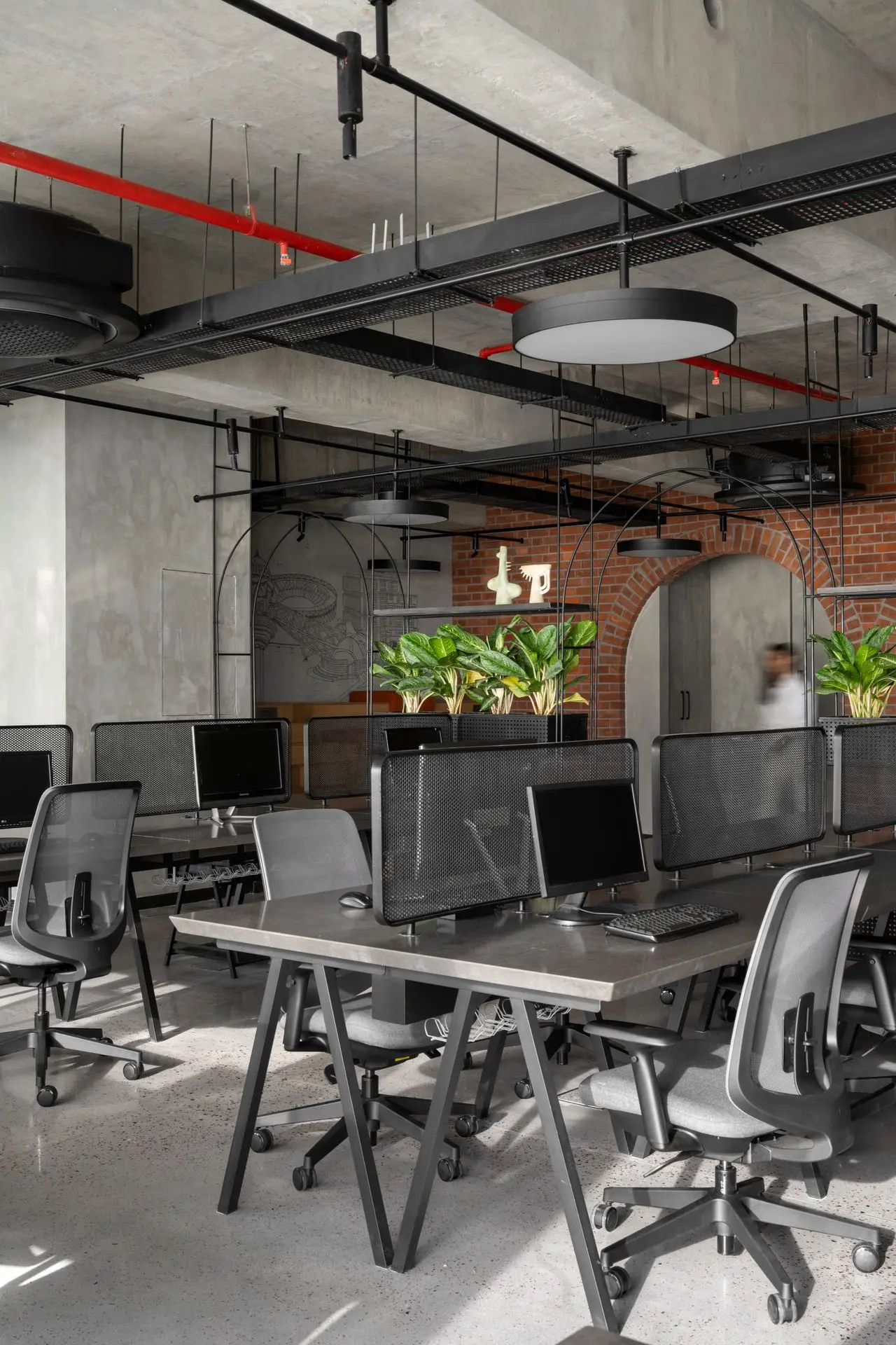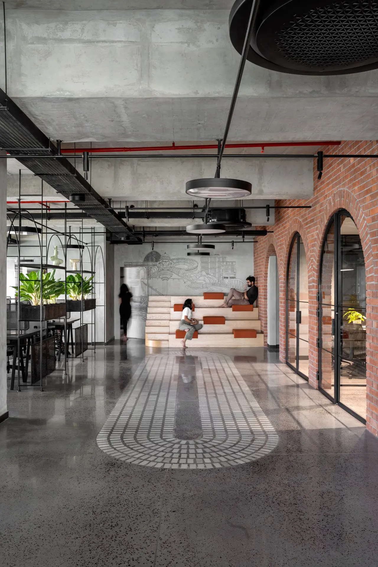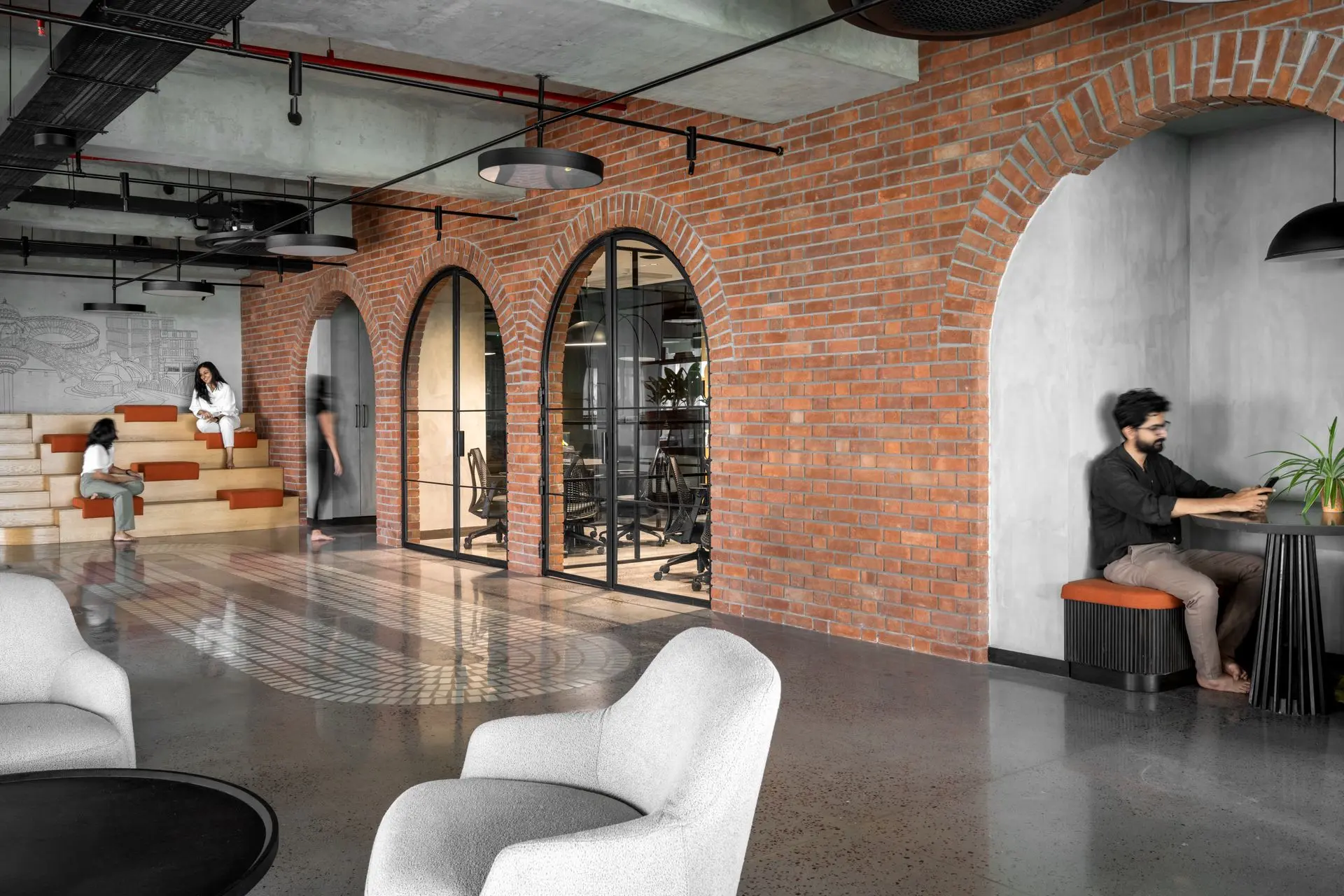 Materiality plays a defining role in shaping the character of the office. Exposed concrete ceilings and floors establish a raw, industrial base, complemented by textured brick walls arranged in an extruded pattern for added warmth and depth. Polished concrete floors inlaid with marble chips introduce subtle elegance, with patterns that follow the rhythm of the arches and enhance spatial continuity.