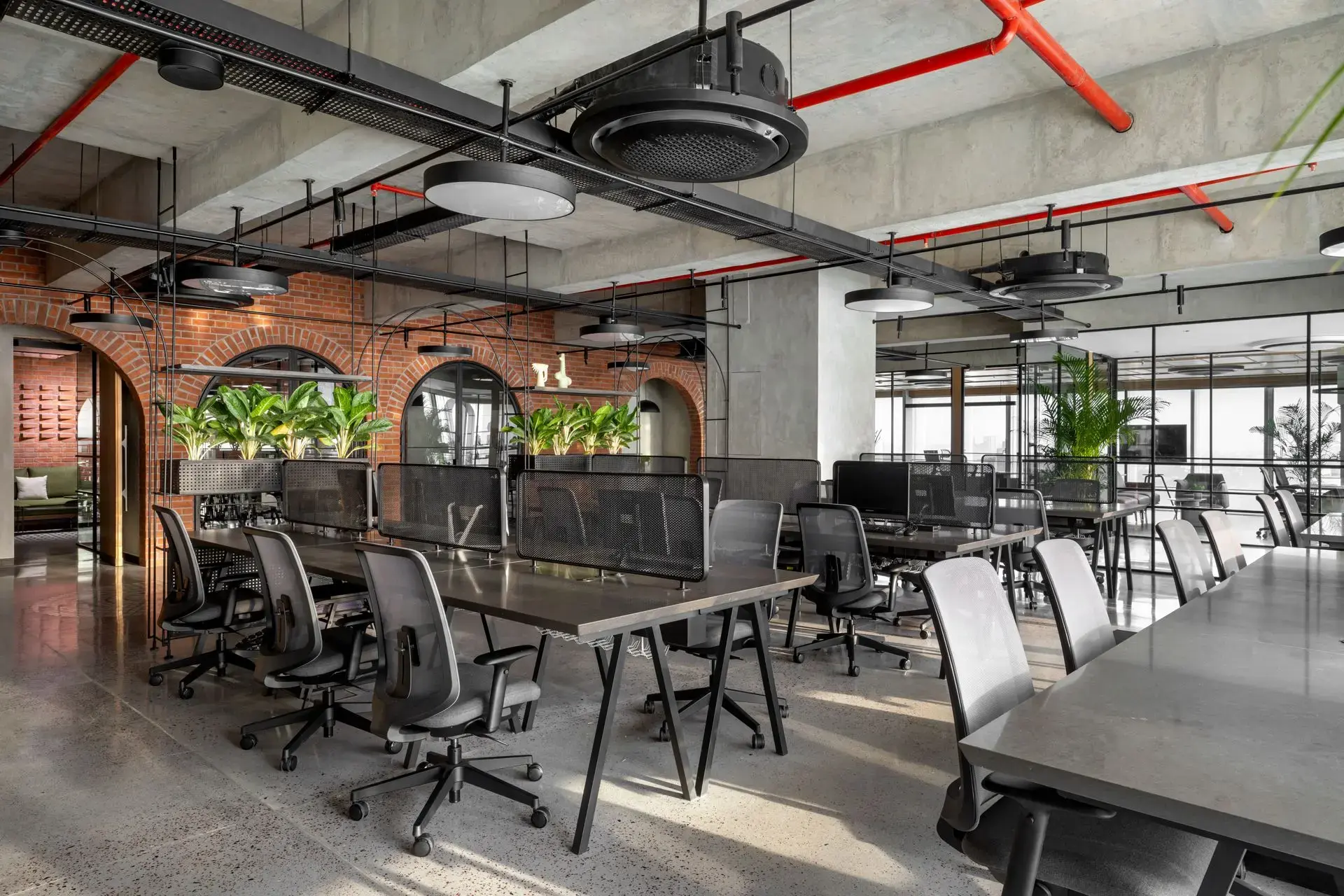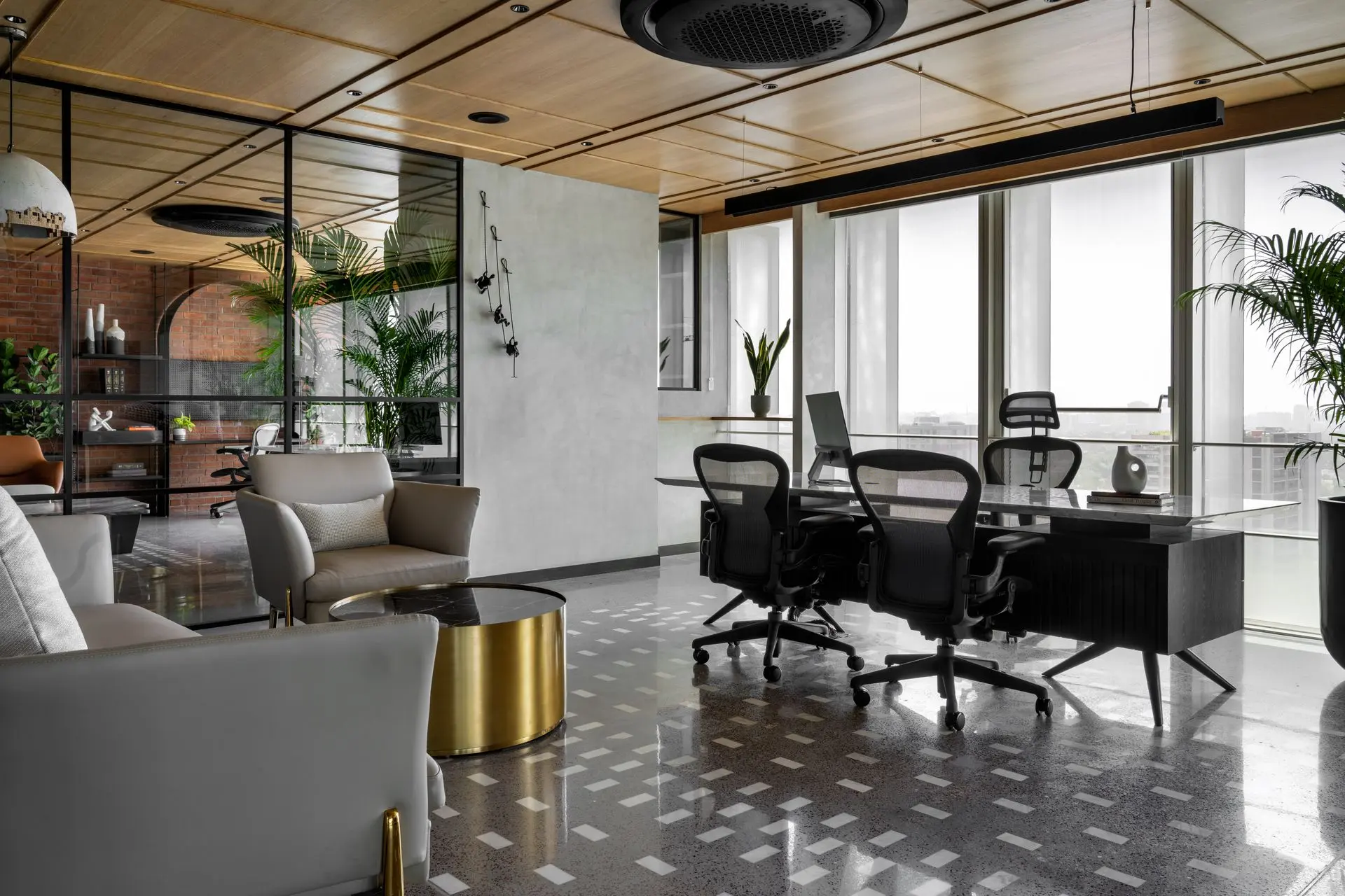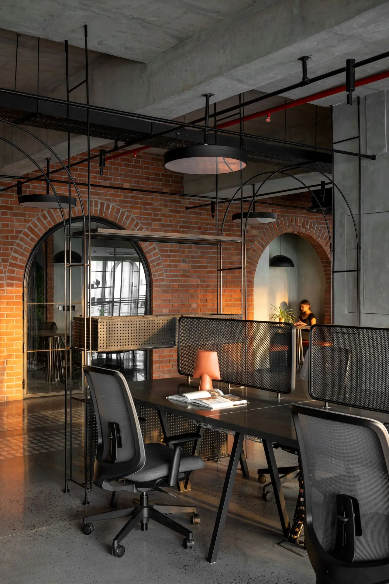 Materiality plays a defining role in shaping the character of the office. Exposed concrete ceilings and floors establish a raw, industrial base, complemented by textured brick walls arranged in an extruded pattern for added warmth and depth. Polished concrete floors inlaid with marble chips introduce subtle elegance, with patterns that follow the rhythm of the arches and enhance spatial continuity.