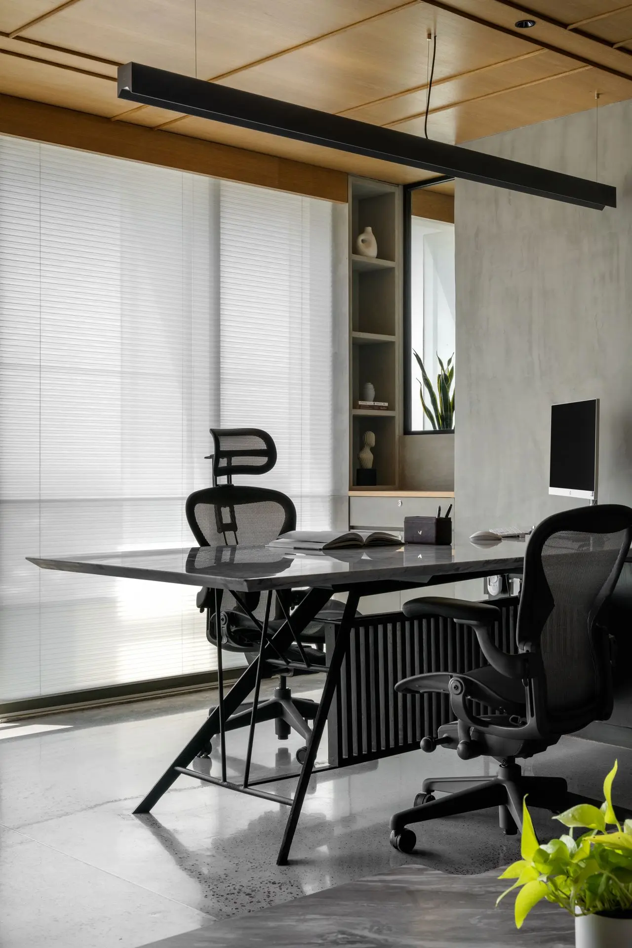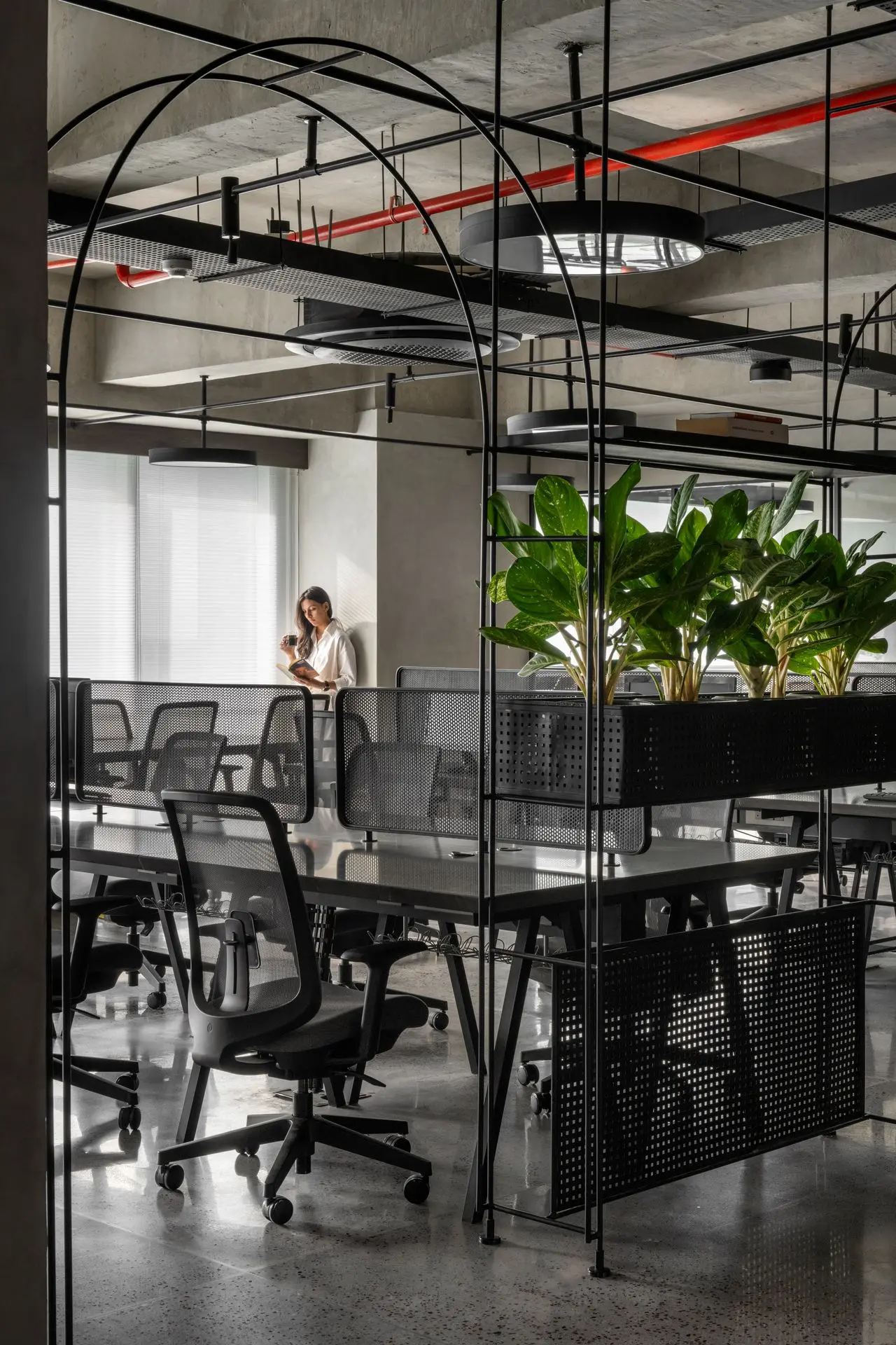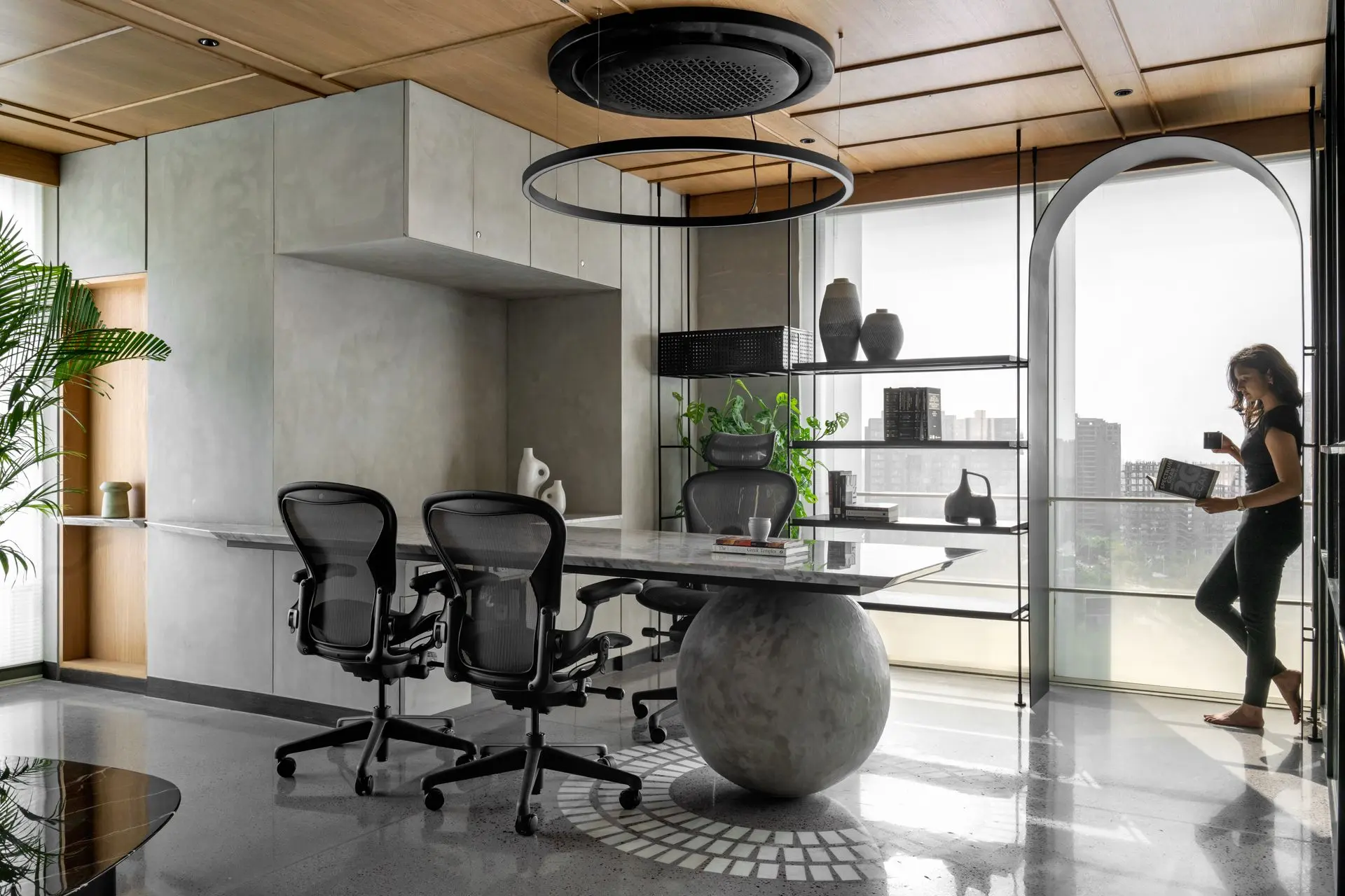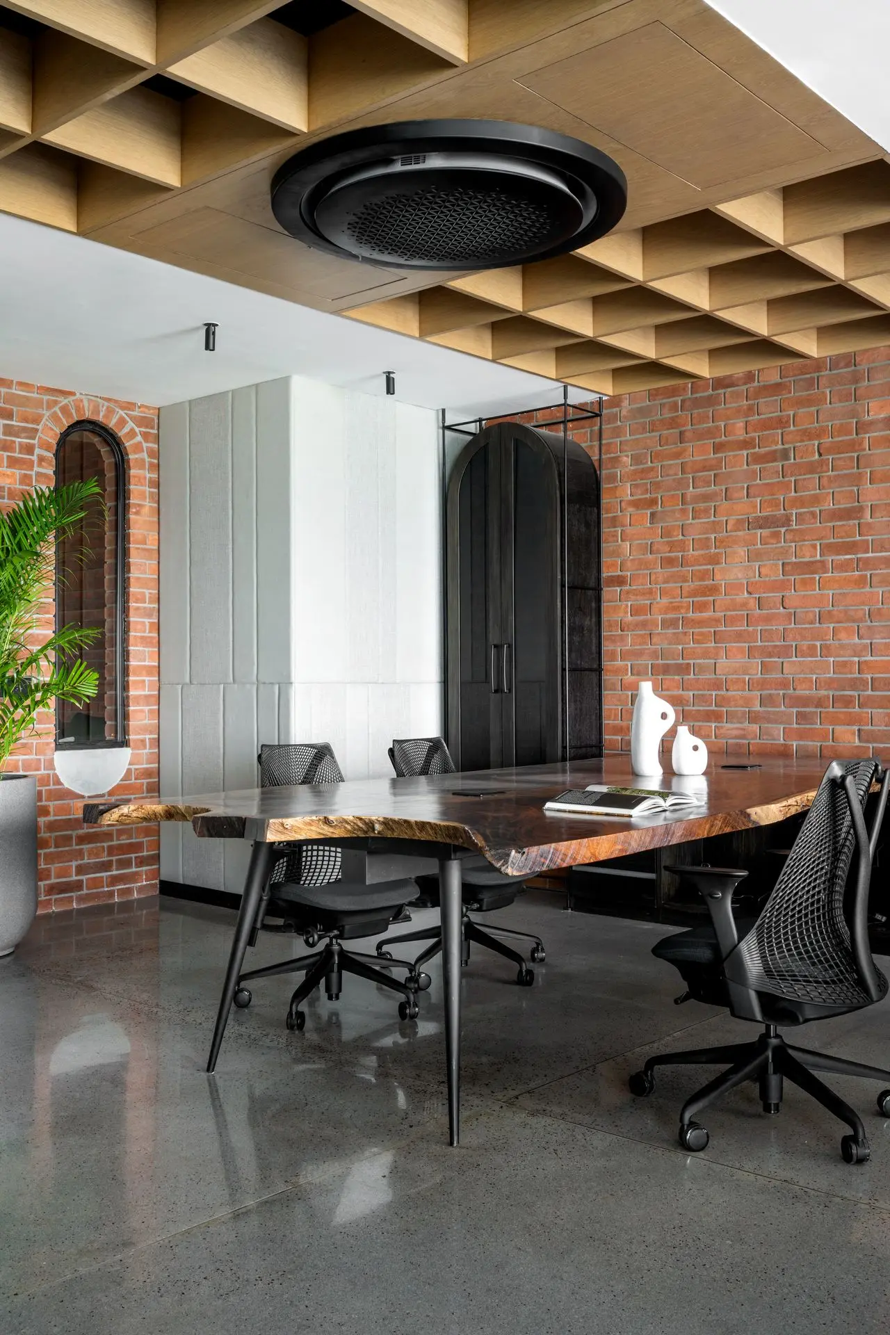 Materiality plays a defining role in shaping the character of the office. Exposed concrete ceilings and floors establish a raw, industrial base, complemented by textured brick walls arranged in an extruded pattern for added warmth and depth. Polished concrete floors inlaid with marble chips introduce subtle elegance, with patterns that follow the rhythm of the arches and enhance spatial continuity.