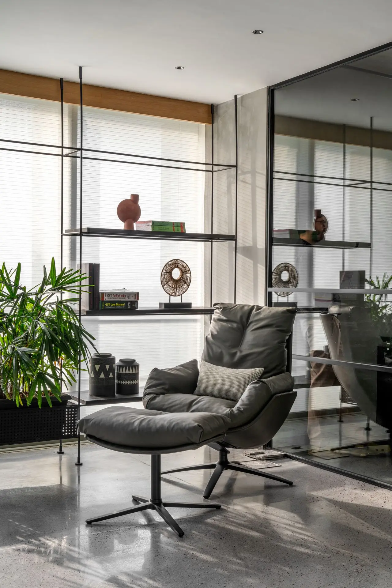 The office is organized into three distinct zones—public, interactive, and core—defined by levels of privacy and porosity. The public zone welcomes visitors with a clean reception desk and a comfortable waiting area designed for short stays. Minimal natural light and uncluttered interiors ensure a calm first impression, allowing the space to function efficiently without visual distractions.