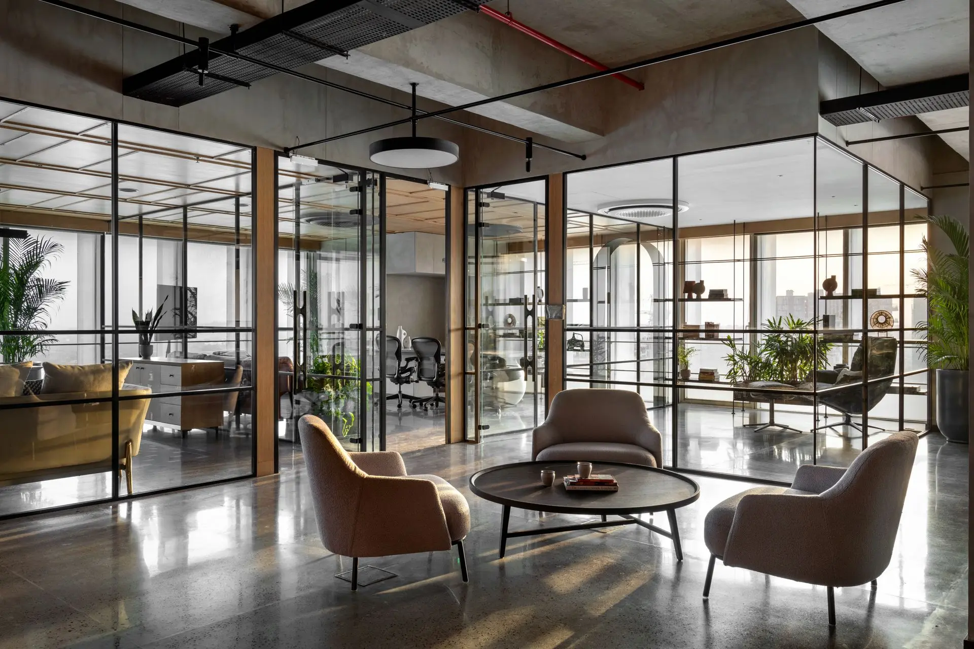 Mild steel elements appear throughout the space in the form of arches, partitions, furniture, and lighting frameworks, reinforcing a cohesive design language. Custom furniture balances durability with refinement, while thoughtful lighting enhances the industrial aesthetic. Stepped seating areas, acoustically treated conference rooms, curated art, and warm finishes collectively enrich the workspace, resulting in an environment where functionality and design come together seamlessly.
