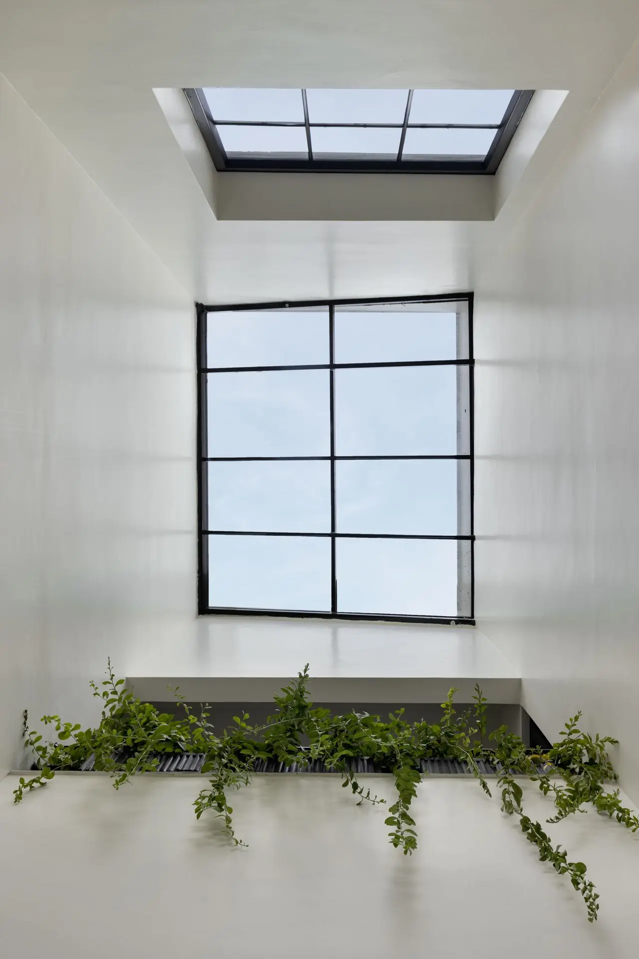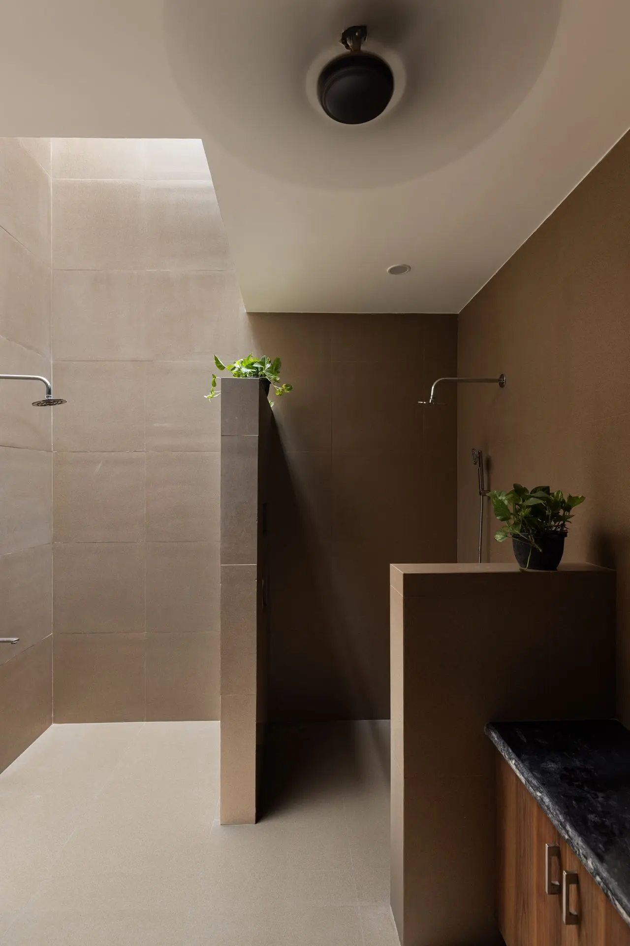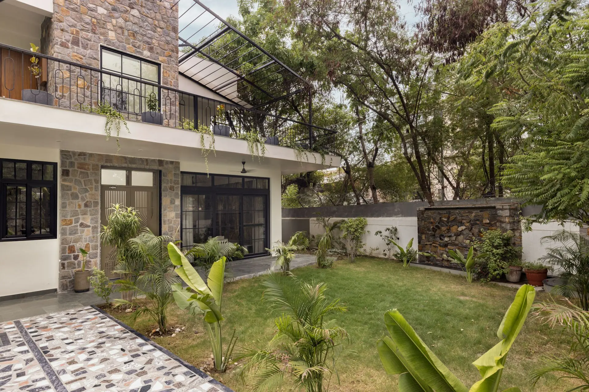 The first floor houses two bedrooms and a shared lounge, connected by a corridor that overlooks the spaces below, reinforcing vertical dialogue. A standout feature here is the open-to-sky bath court, offering a private, naturally lit retreat. The journey continues upward to the second floor, where a multipurpose hall opens onto a terrace shaded by a lightweight metal pergola, designed to host creeping greens and evolve into a breathable rooftop garden.