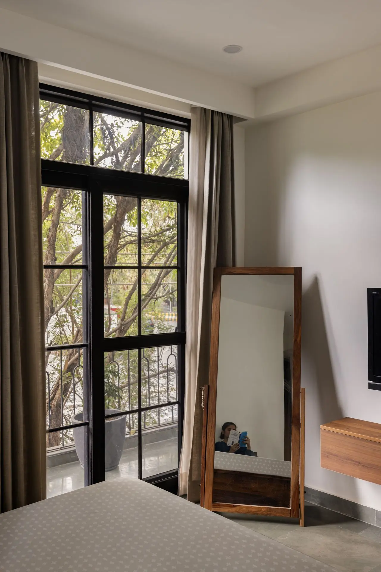 Circulation within the house is effortless and visually engaging. A centrally placed staircase, paired with a natural light well, anchors movement across floors while maintaining continuity between levels. At the rear, the master bedroom remains secluded yet connected, framing green views toward the northwest without direct exposure. This balance of privacy and openness defines the spatial experience of the ground floor.