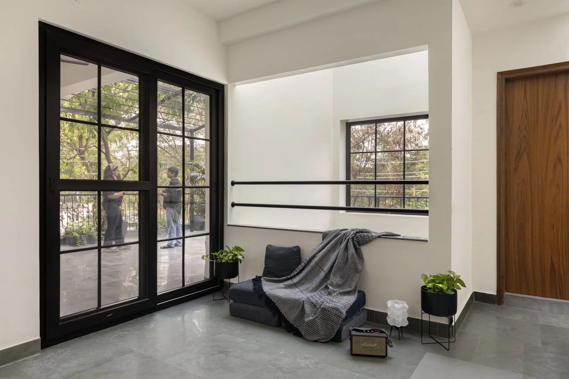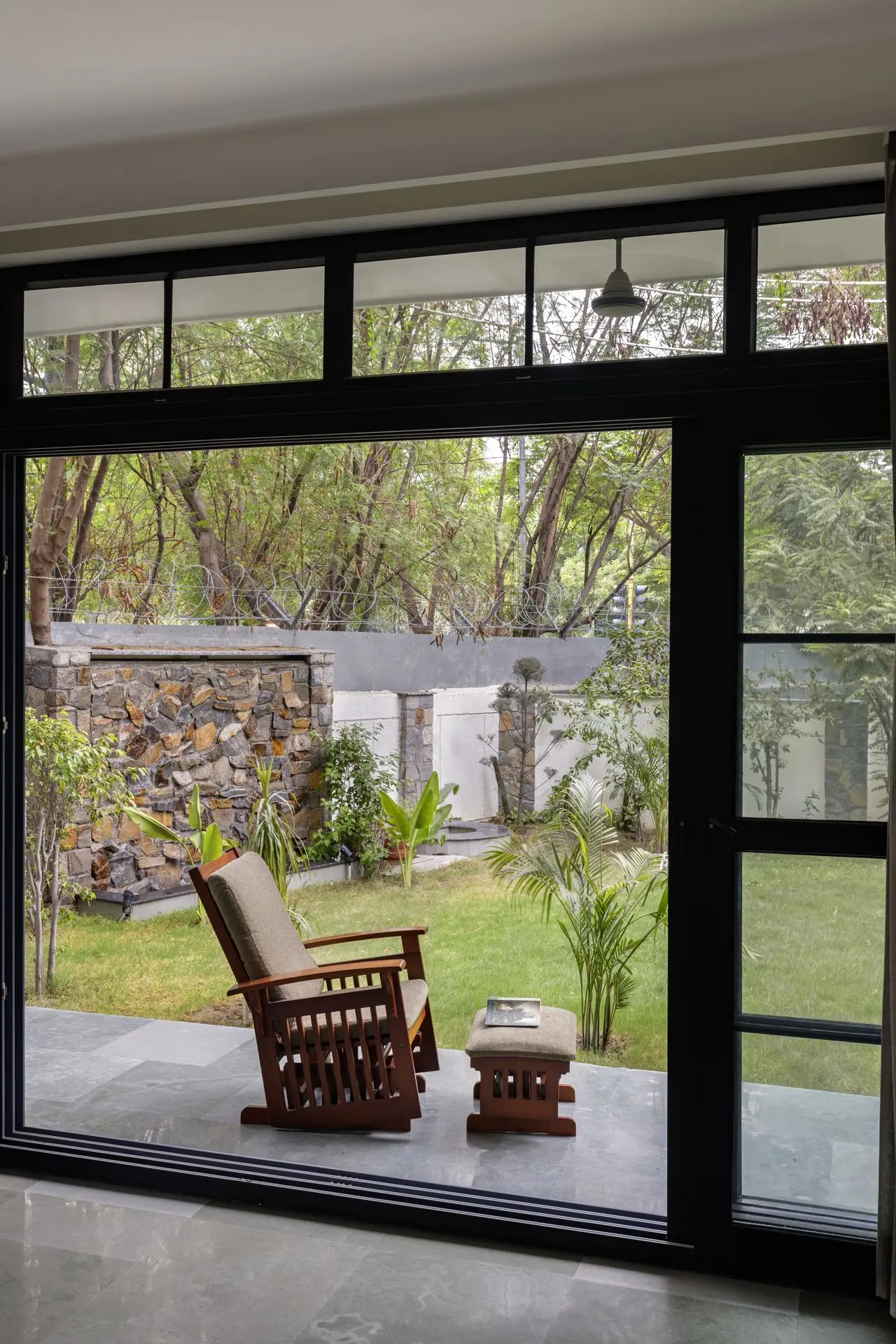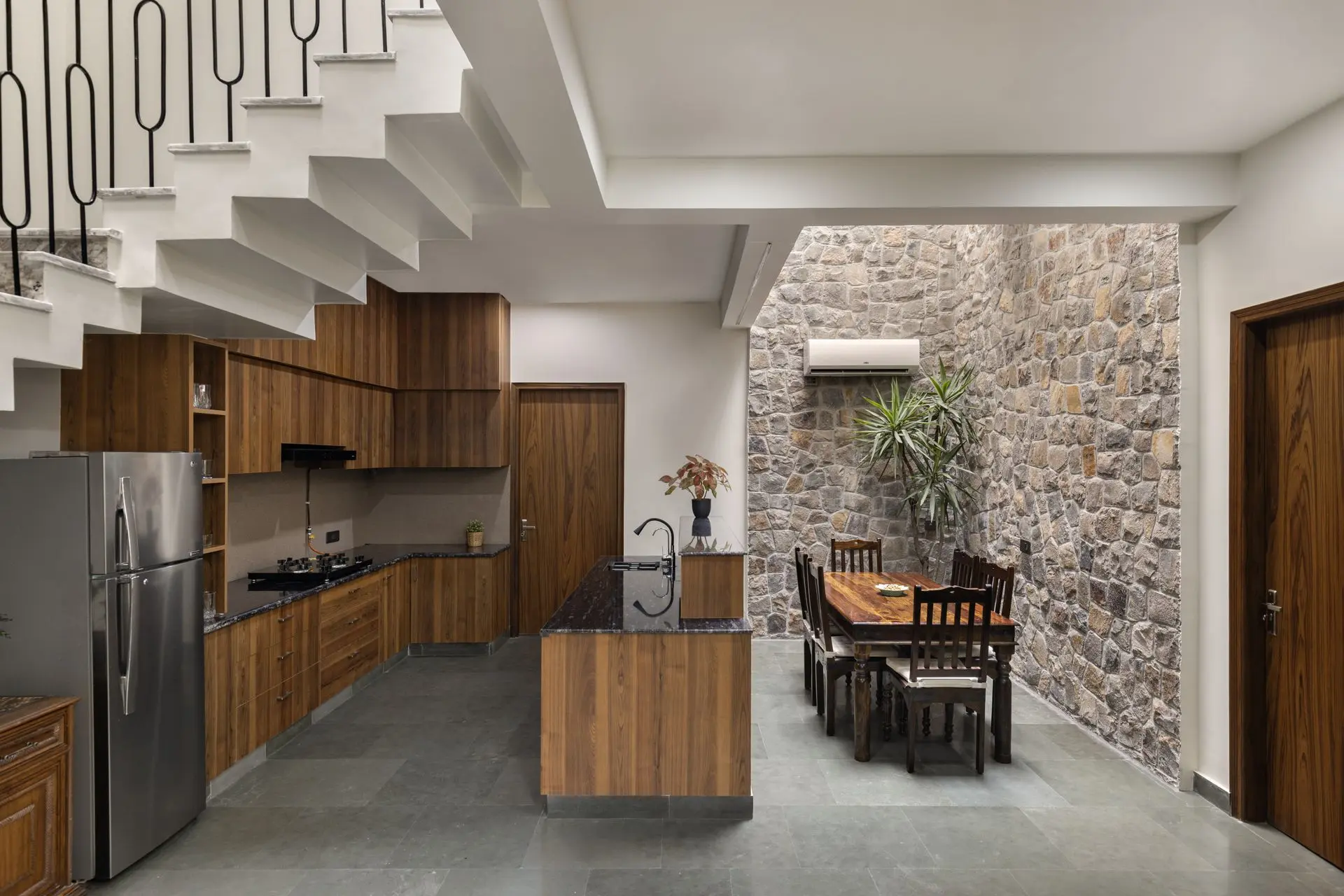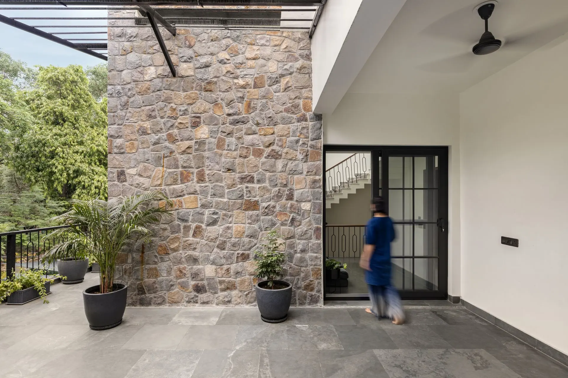 Light, ventilation, and materiality play a defining role throughout the home. Four open-to-sky voids placed at the foyer, dining area, staircase, and first-floor bathroom act as spatial lungs, bringing daylight, passive cooling, and visual continuity across floors. Locally sourced Aravalli stone grounds the exterior and dining spaces, while Kota stone flooring lends thermal comfort inside. Even construction waste finds new purpose, reused in flooring and water features. Together, these choices reinforce Sukoon as a home that absorbs its surroundings with quiet grace offering stillness in a city that rarely slows down