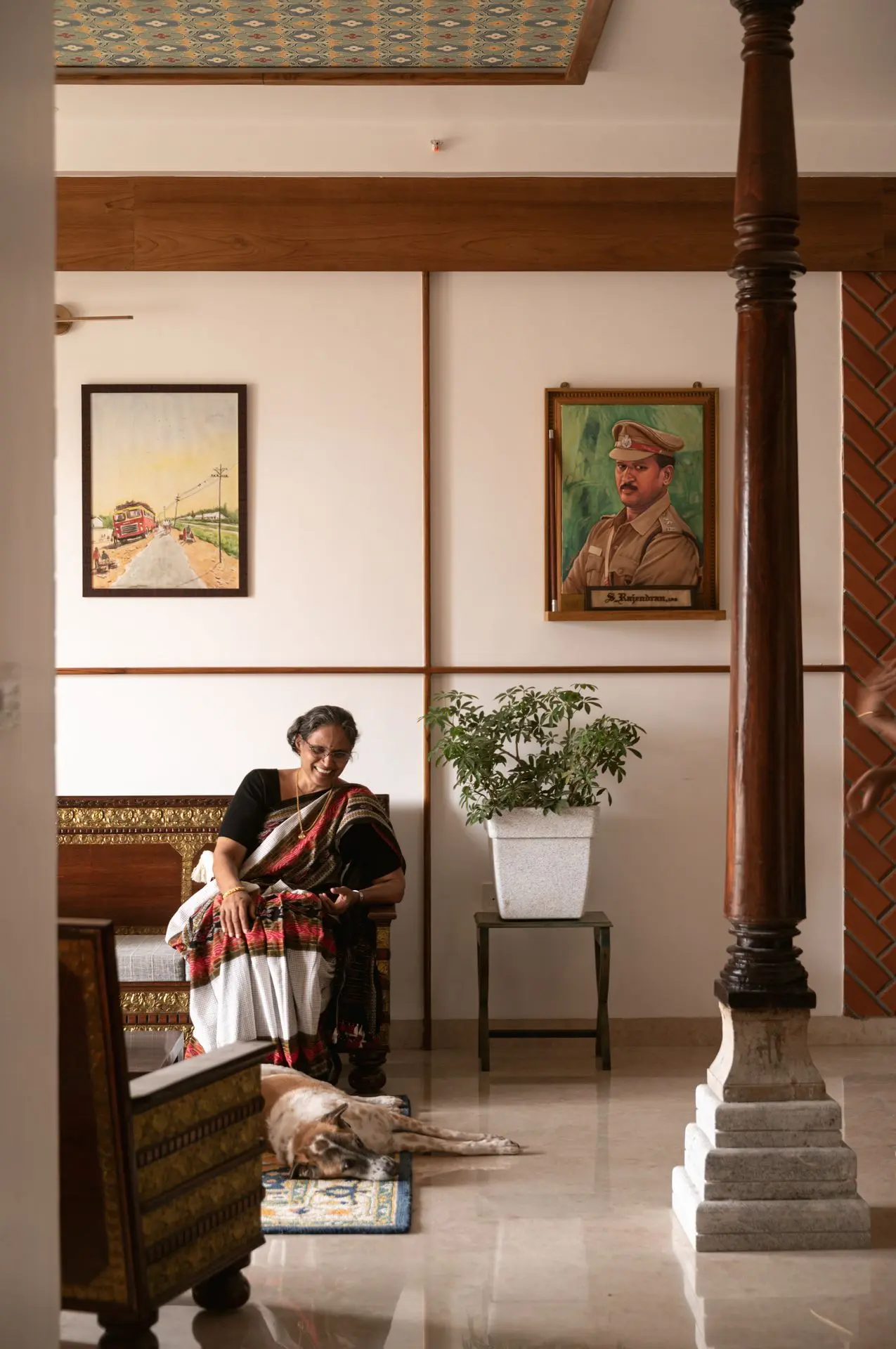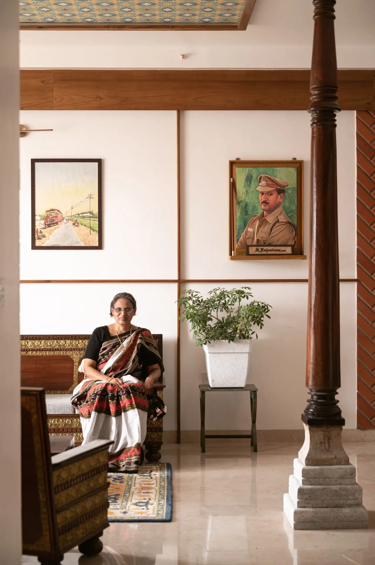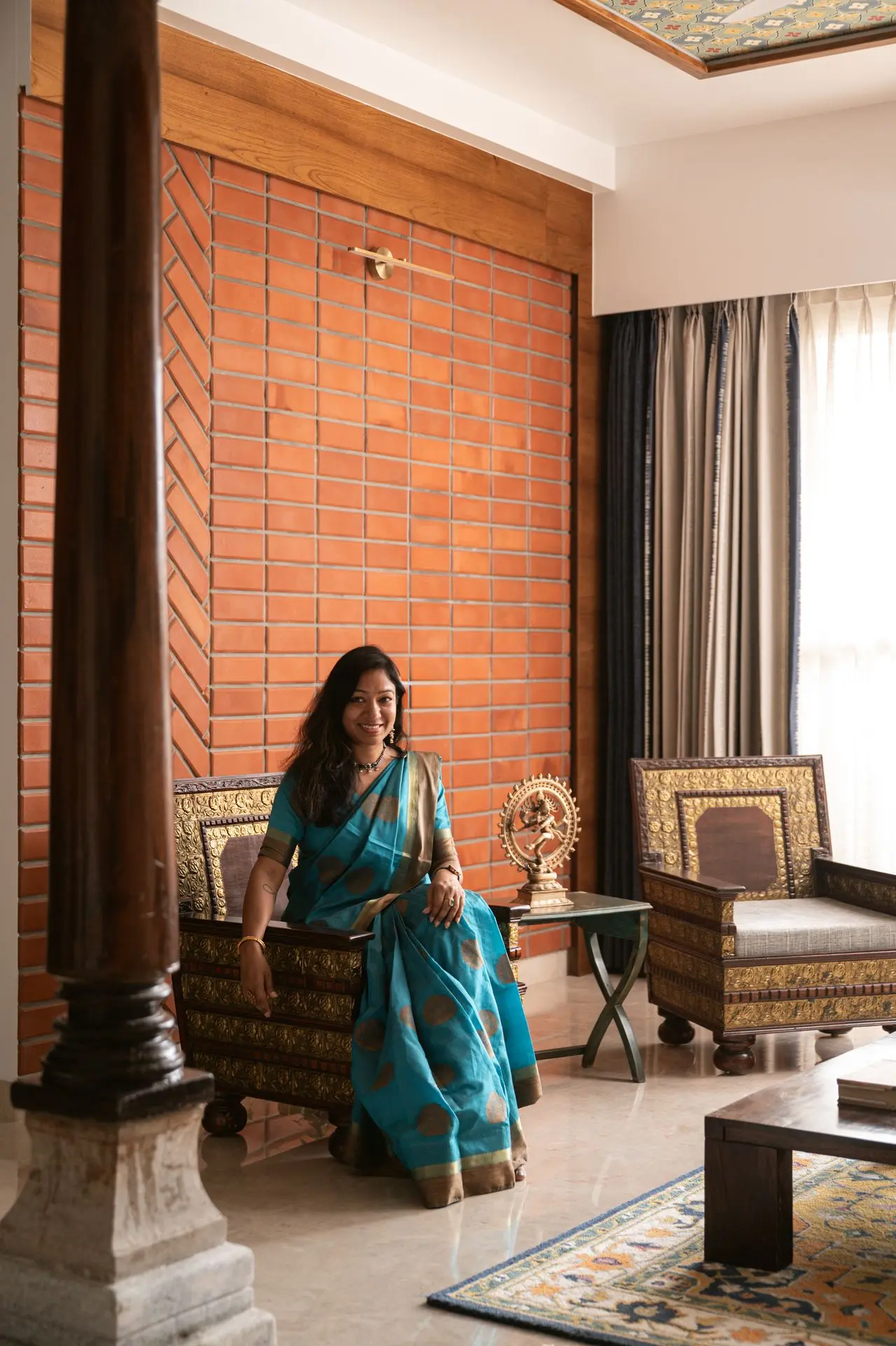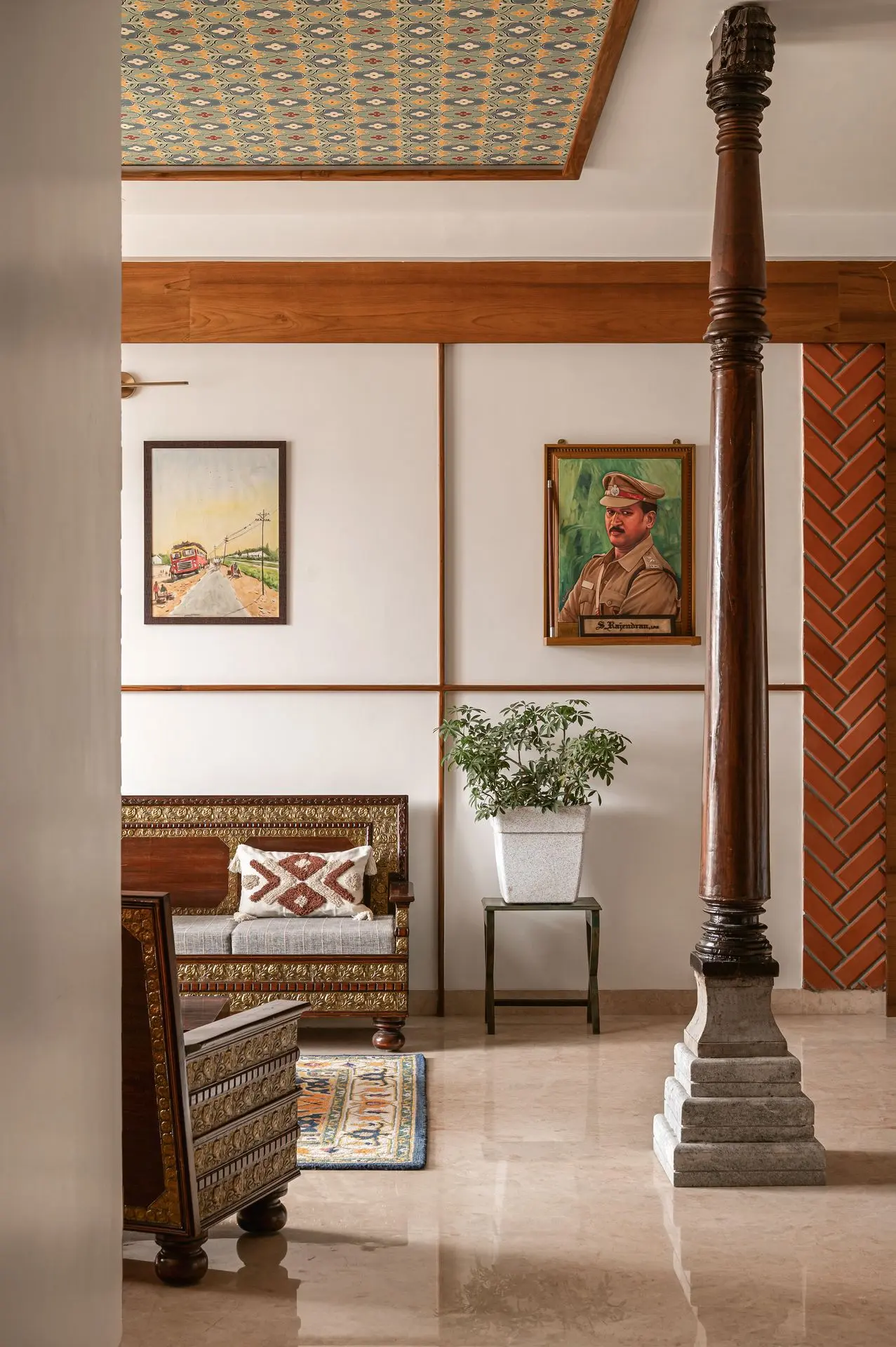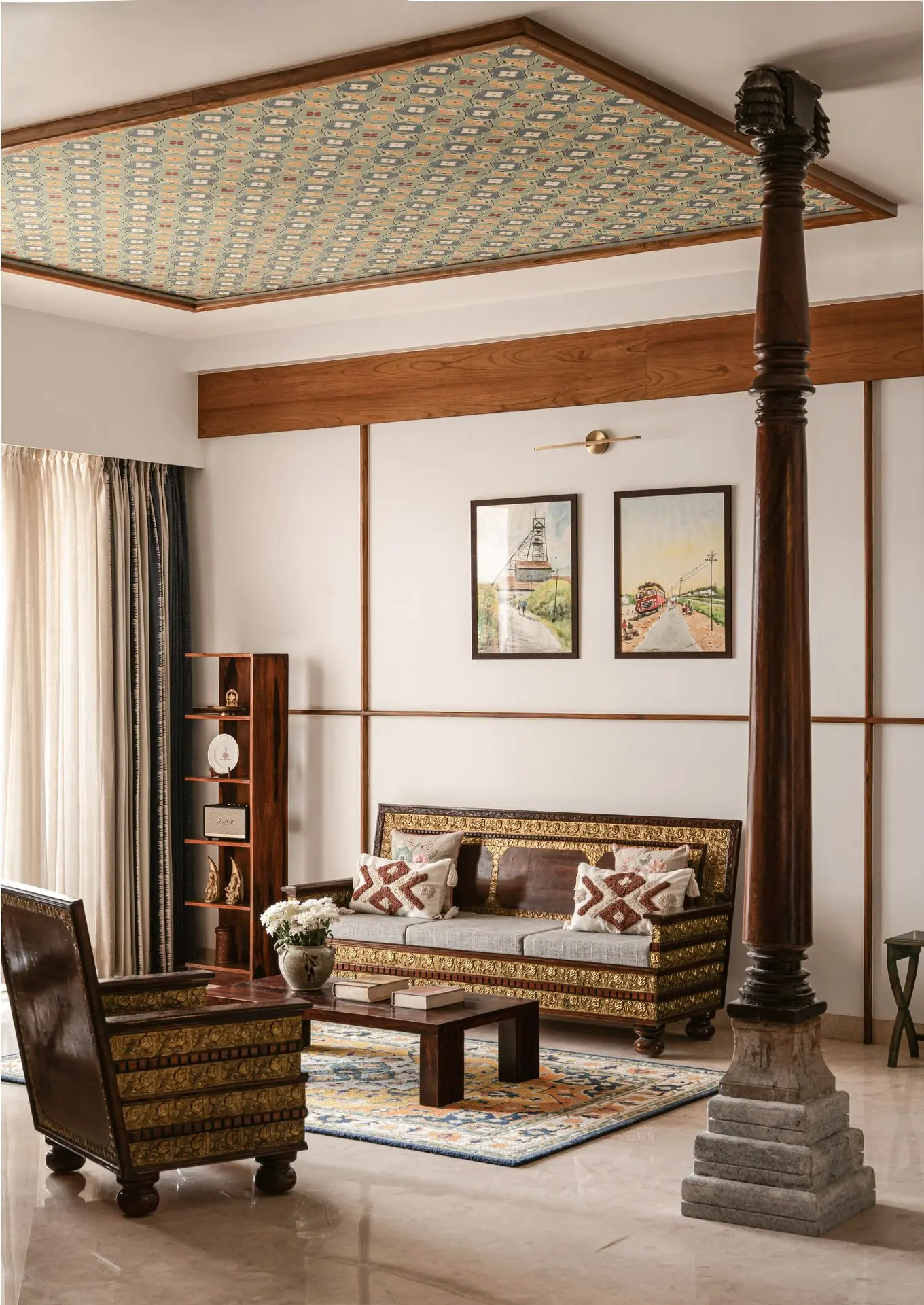 South Indian tradition forms the backbone of the design. Chettinad pillars, carved furniture, and brass accents are paired with vibrant colours to create a balance between boldness and calm, structure and softness. The design weaves lineage and culture into modern living.