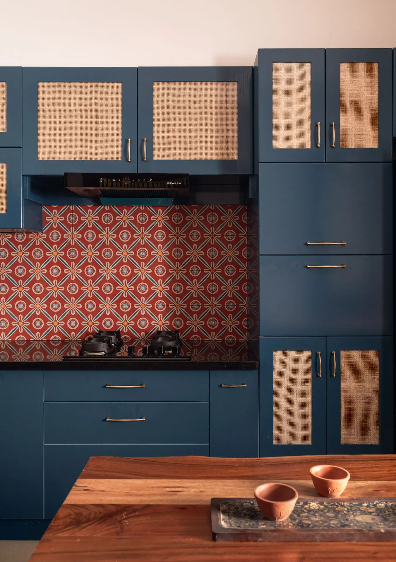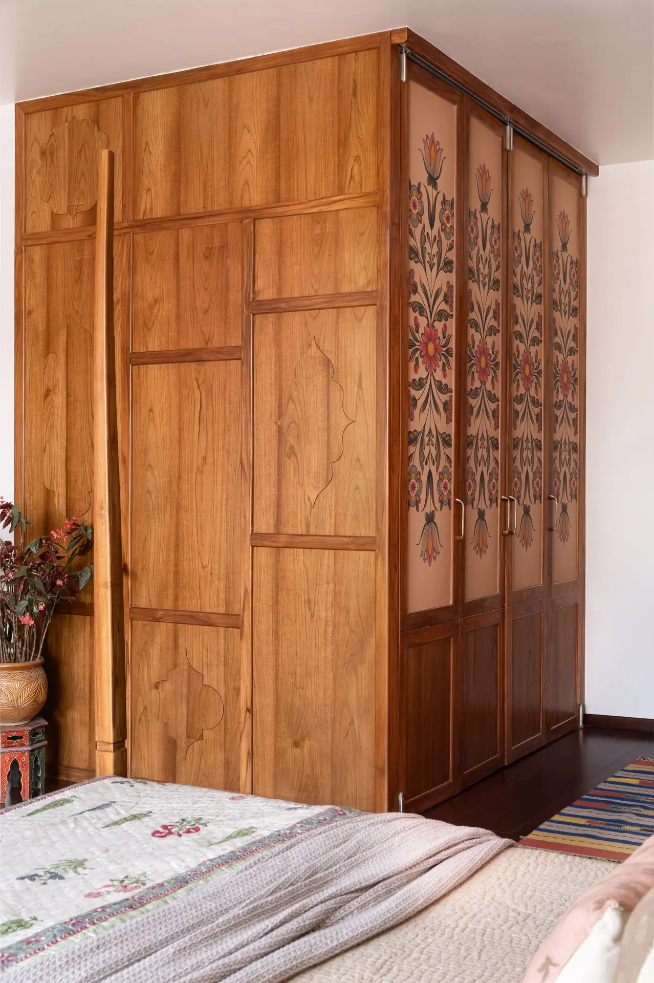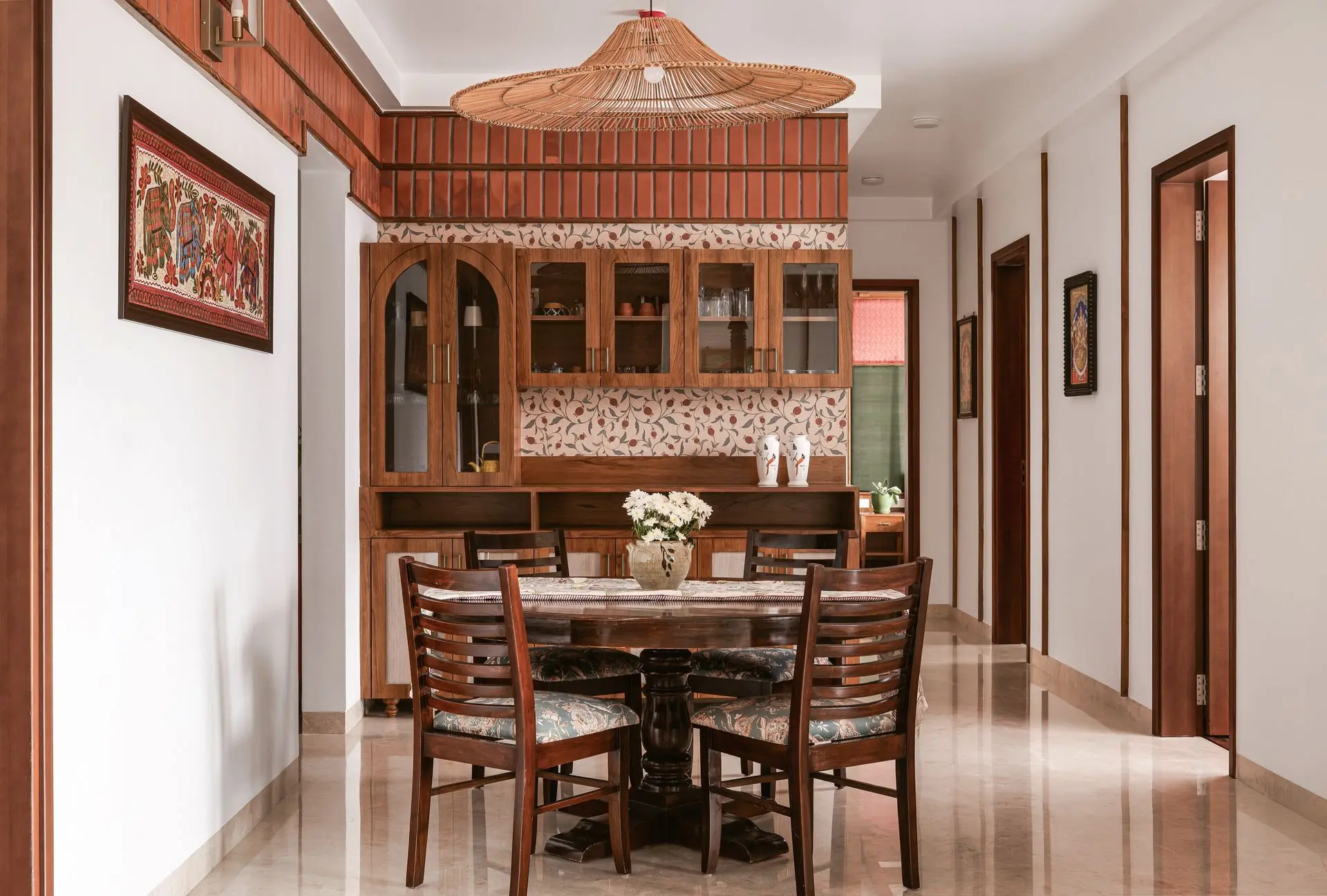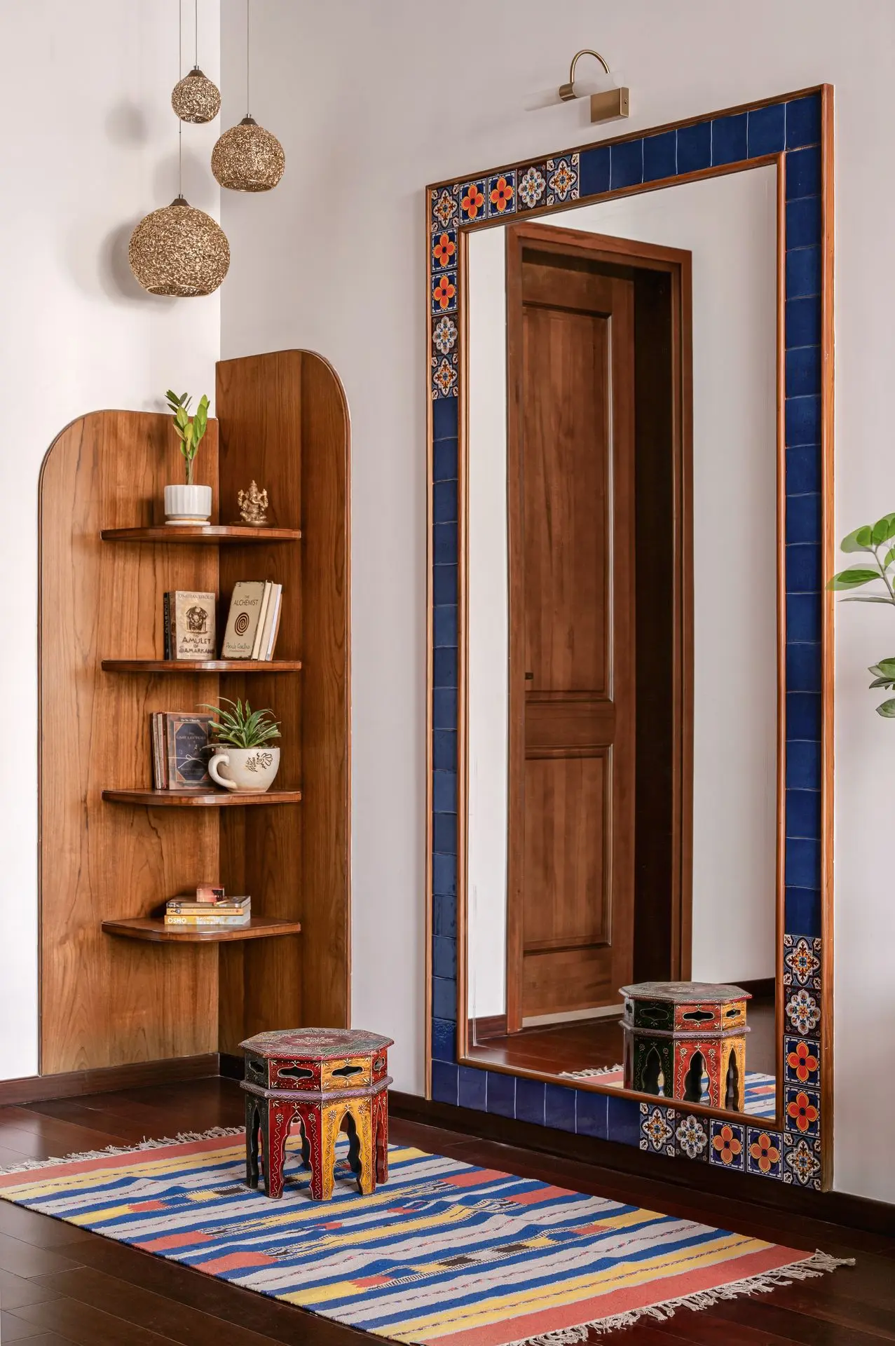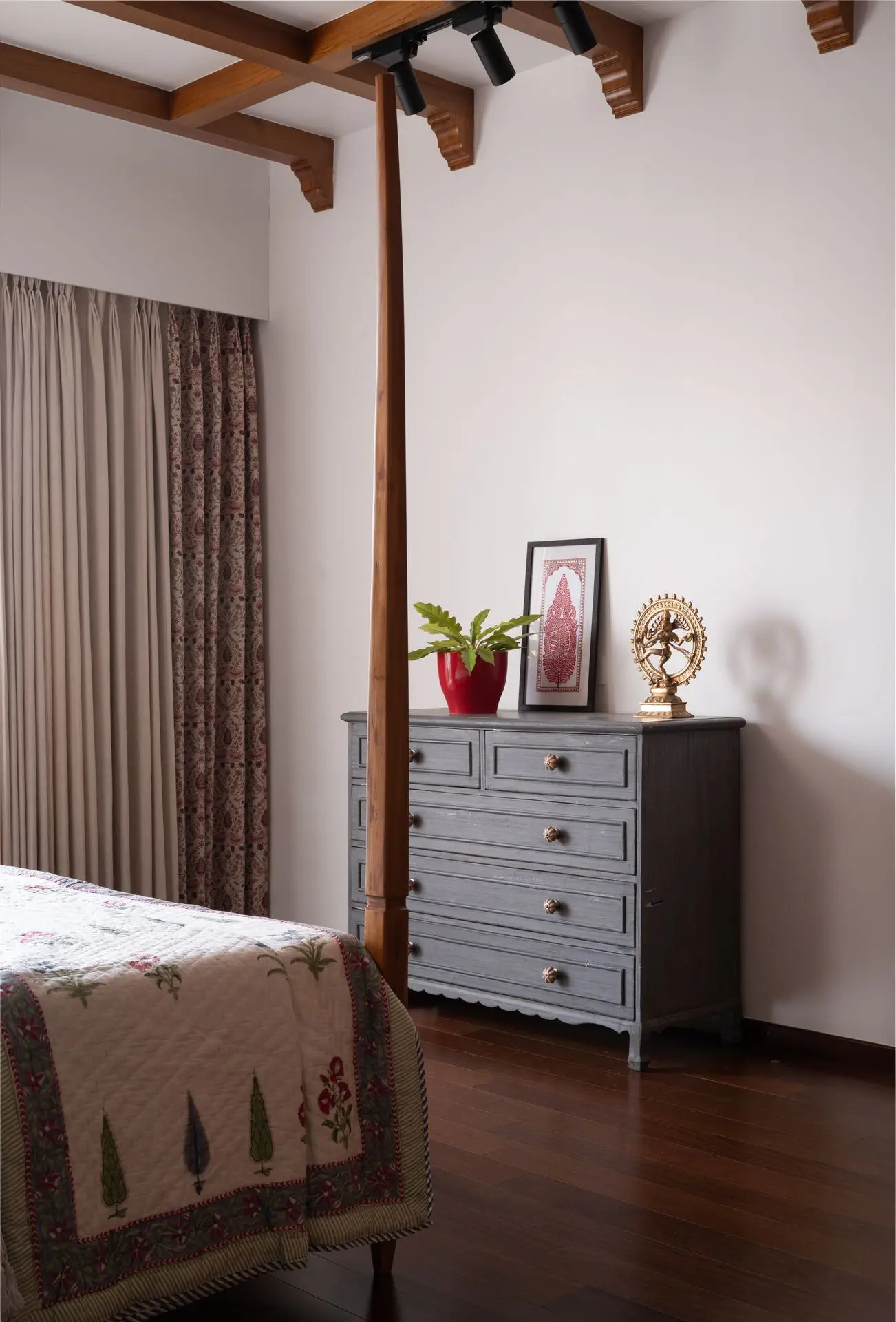 South Indian tradition forms the backbone of the design. Chettinad pillars, carved furniture, and brass accents are paired with vibrant colours to create a balance between boldness and calm, structure and softness. The design weaves lineage and culture into modern living.