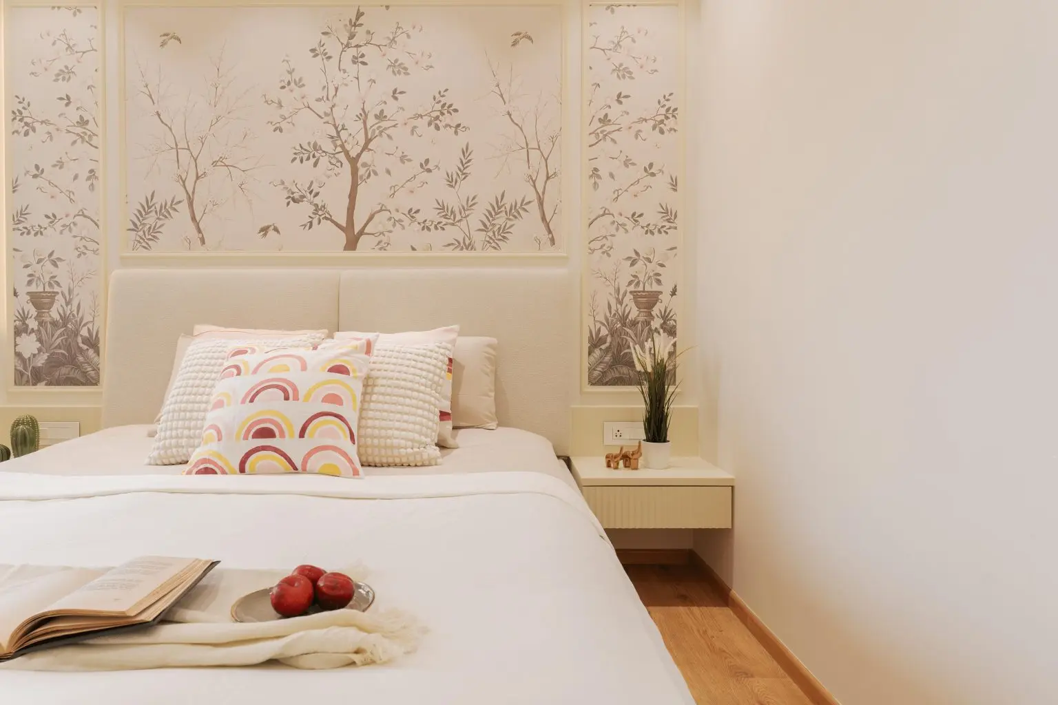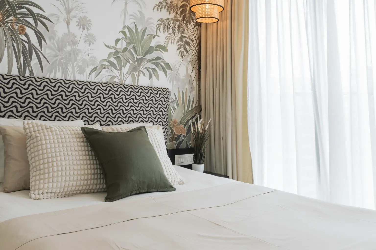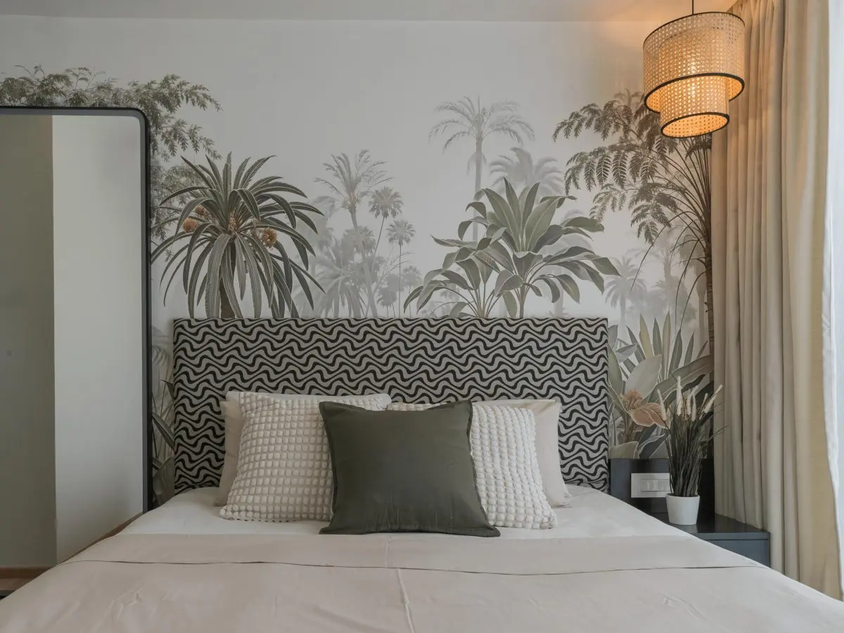 Throughout, wooden flooring, soft ivory-toned walls, and layered patterns add depth and warmth, creating an atmosphere that encourages rest, reflection, and a gentle connection to the outdoors.