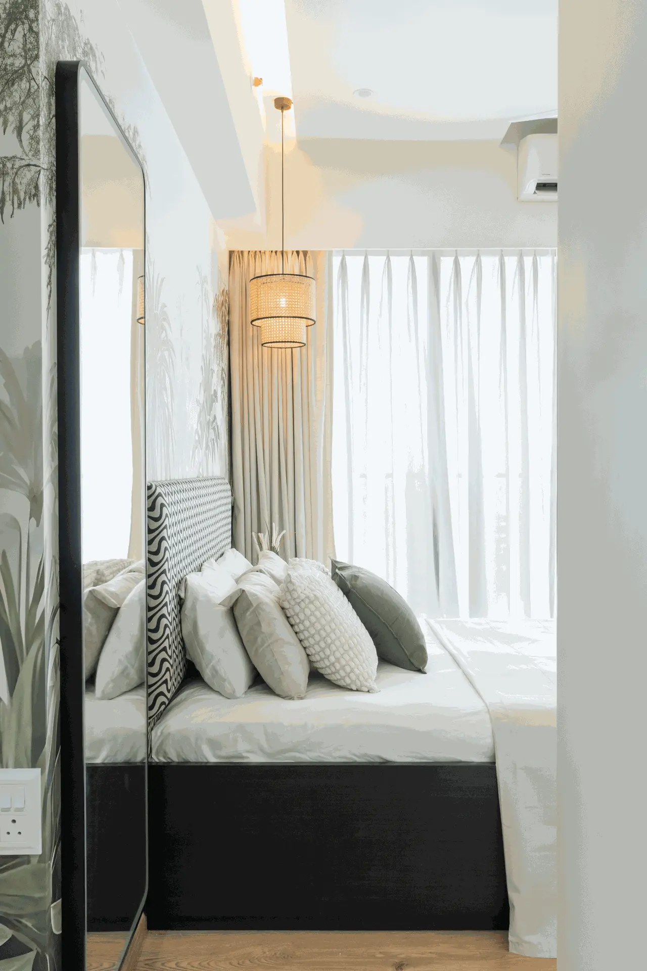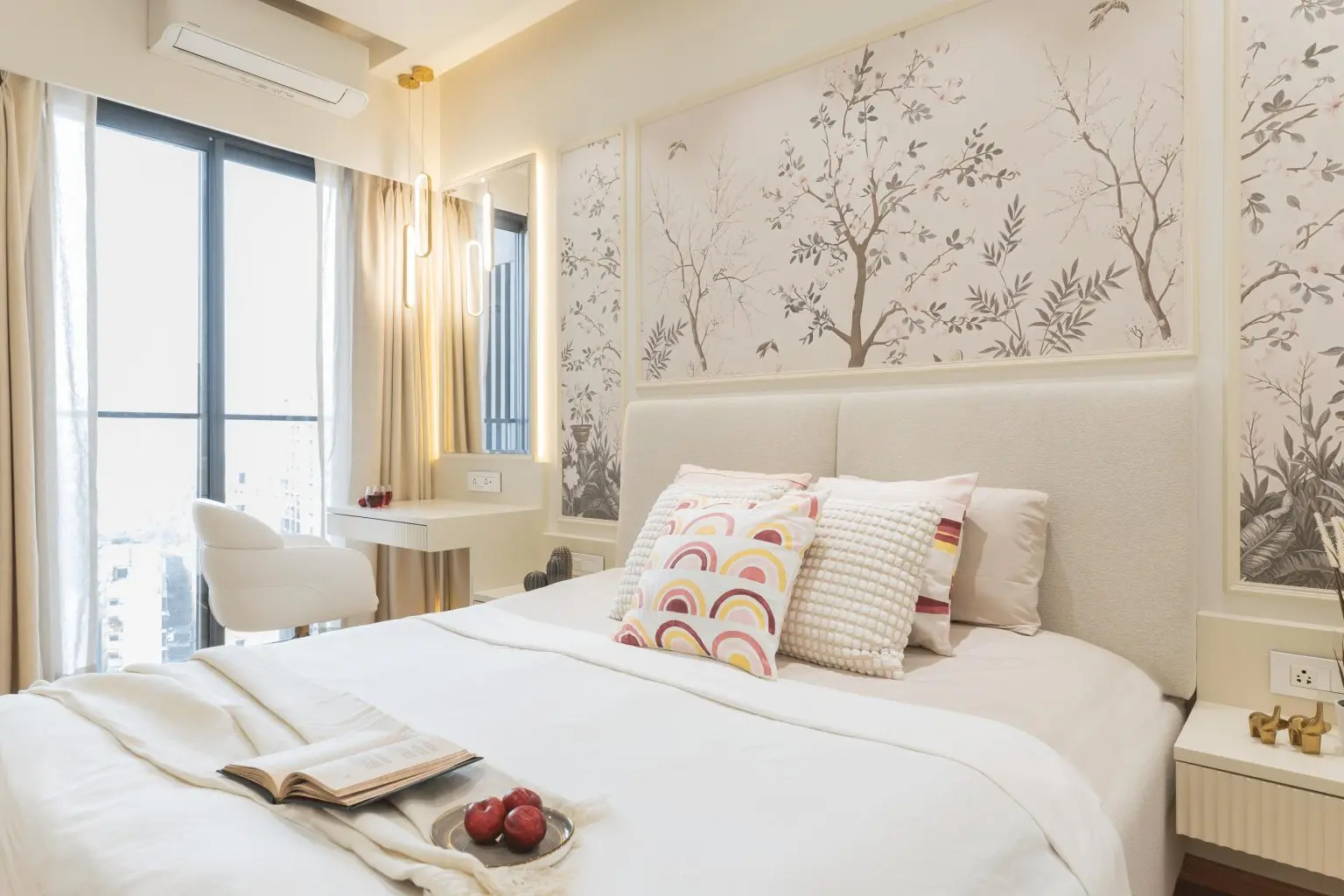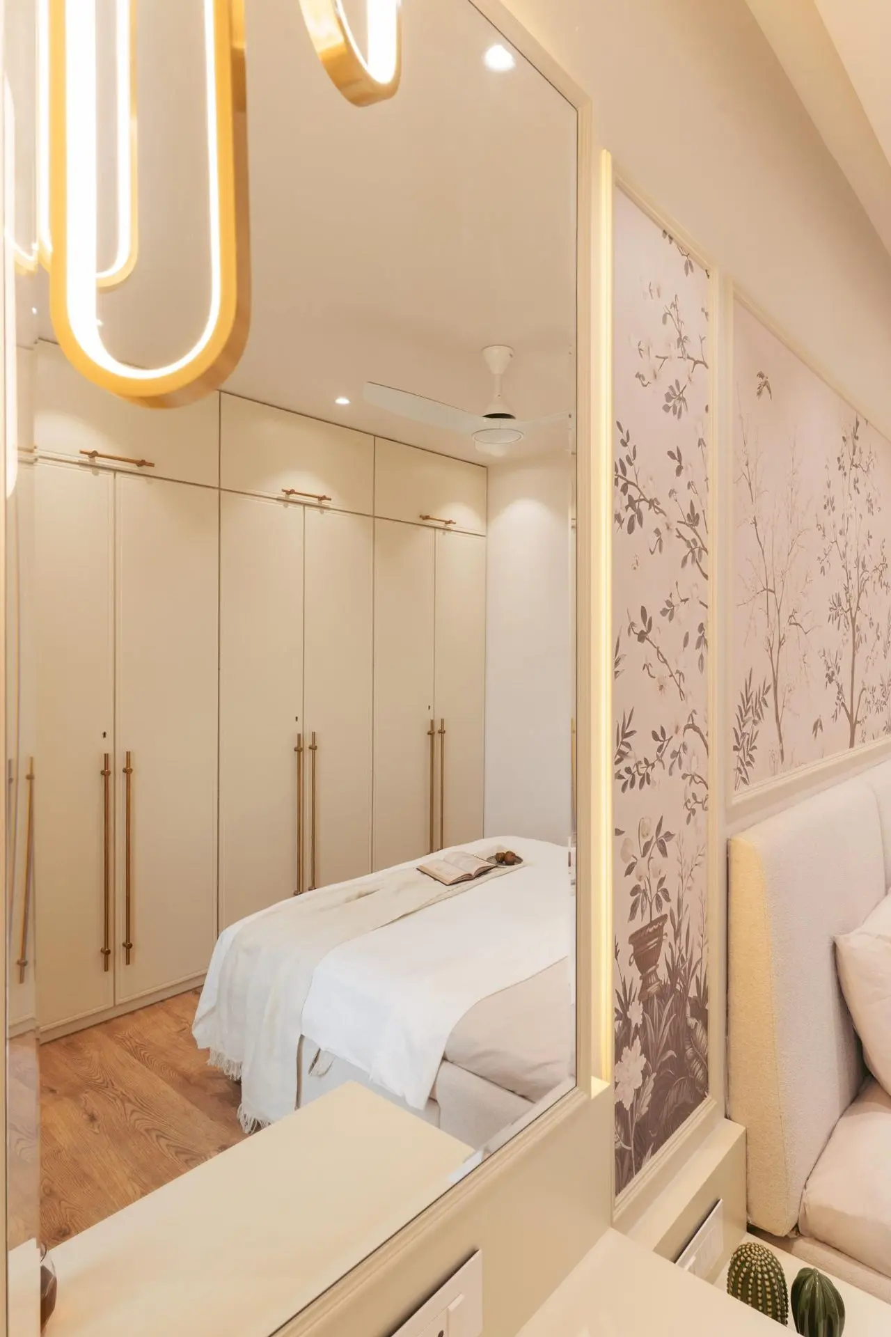 Throughout, wooden flooring, soft ivory-toned walls, and layered patterns add depth and warmth, creating an atmosphere that encourages rest, reflection, and a gentle connection to the outdoors.