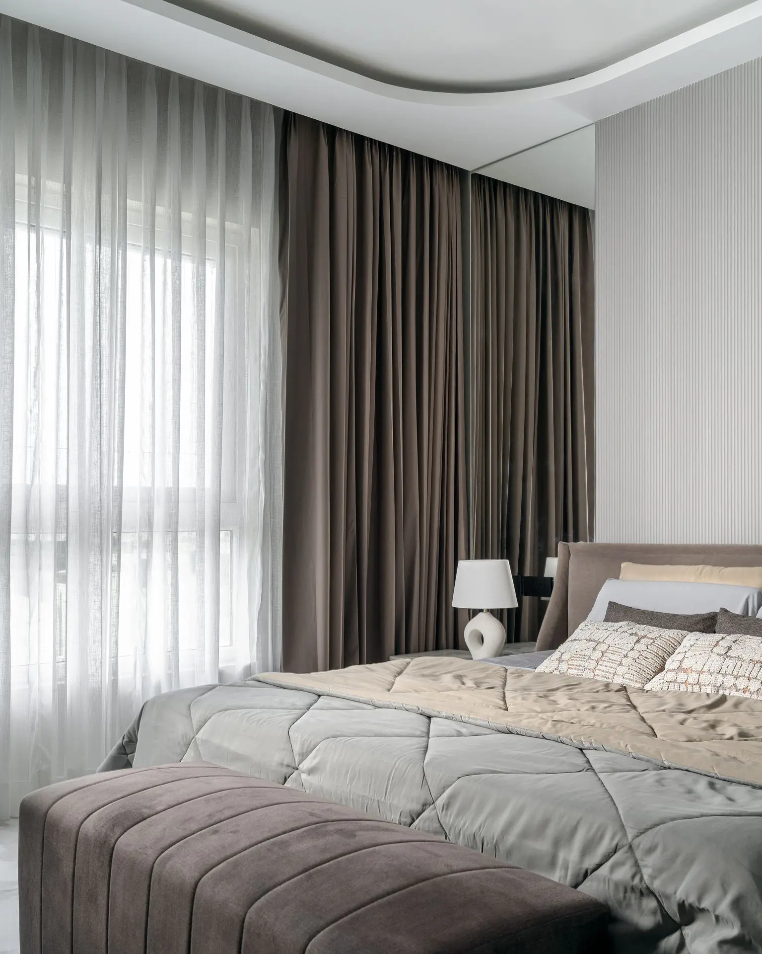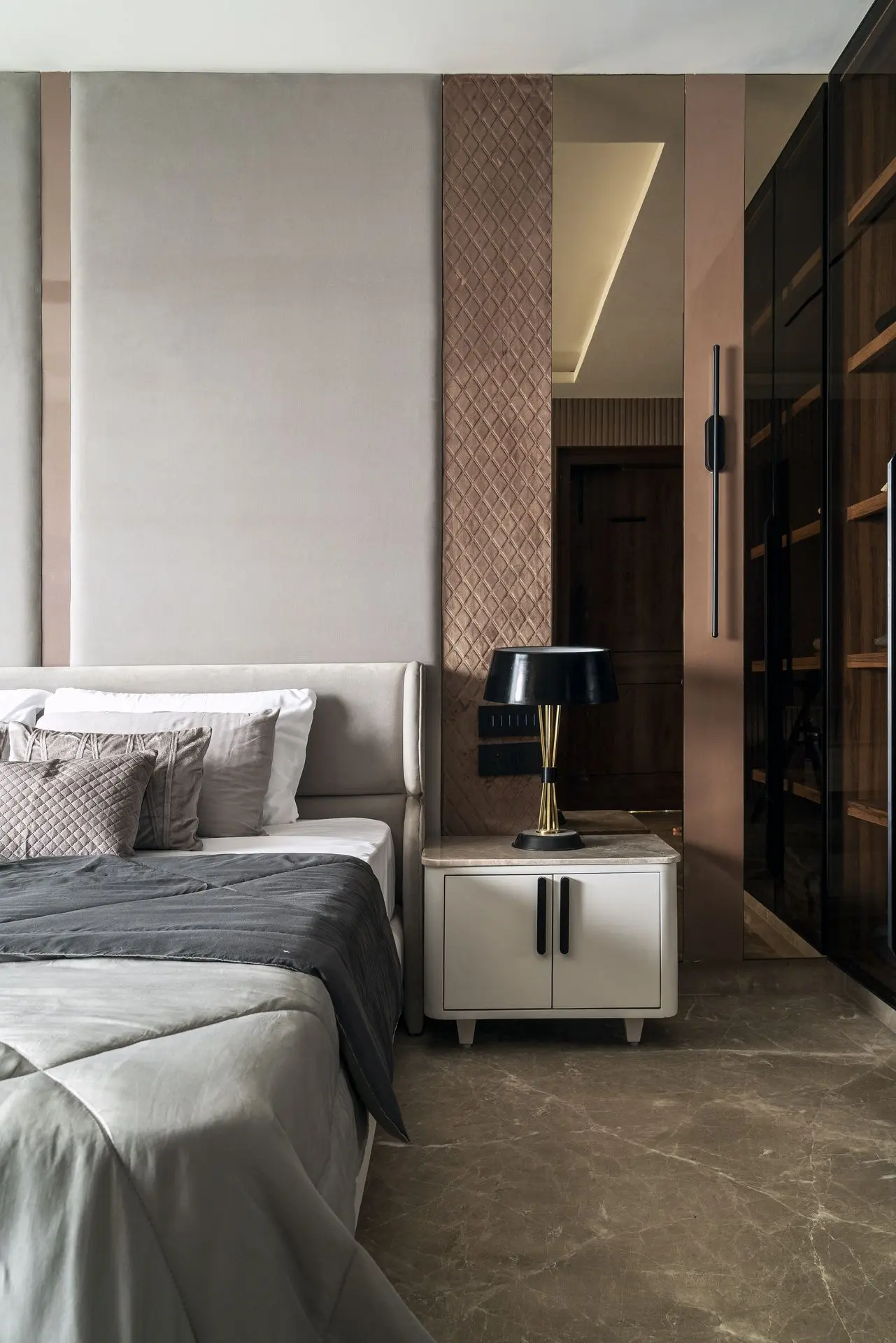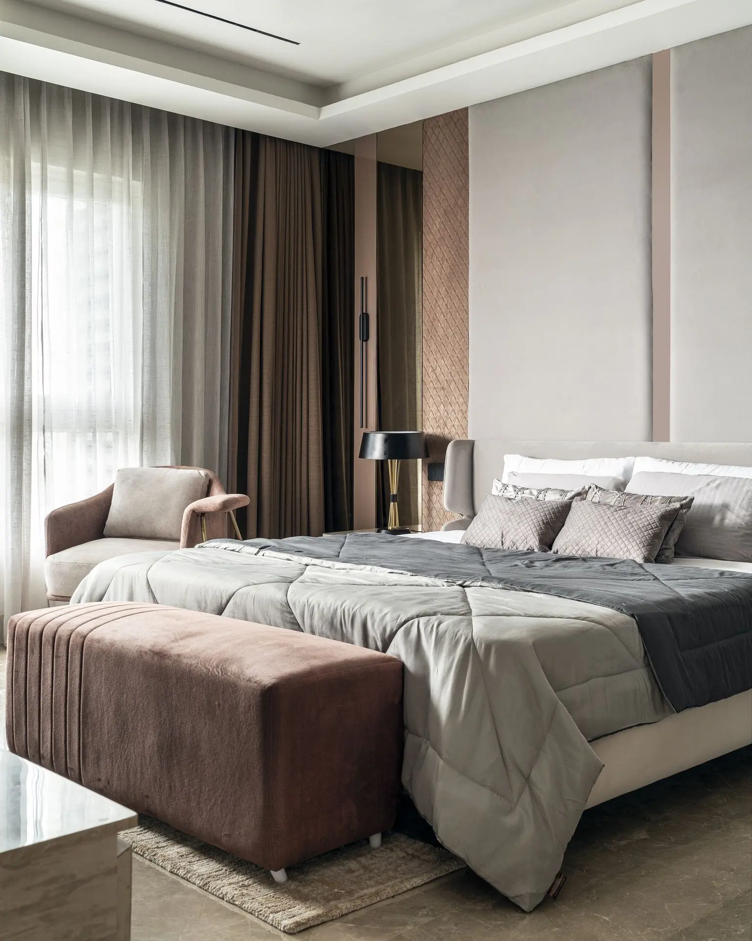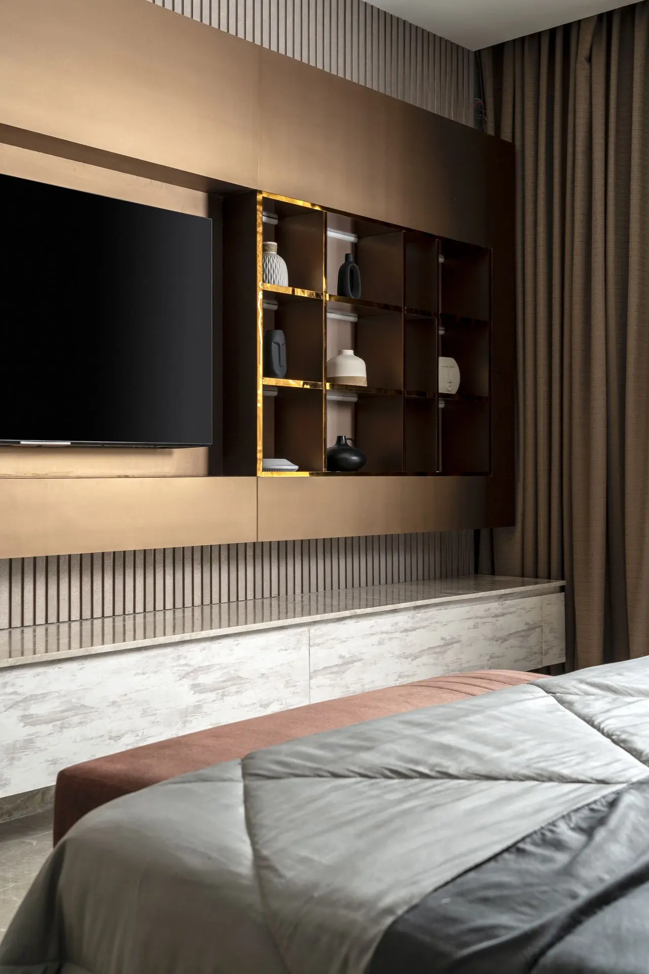 Bedrooms follow a clean, linear design language, exuding a sense of understated richness. Thoughtful detailing ensures the spaces feel composed and visually light.