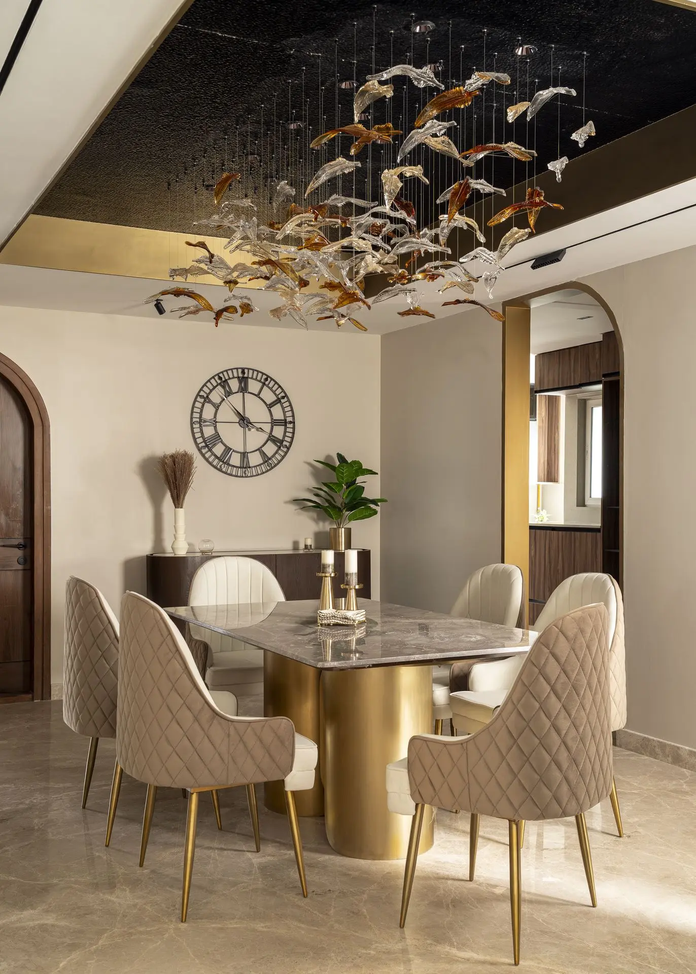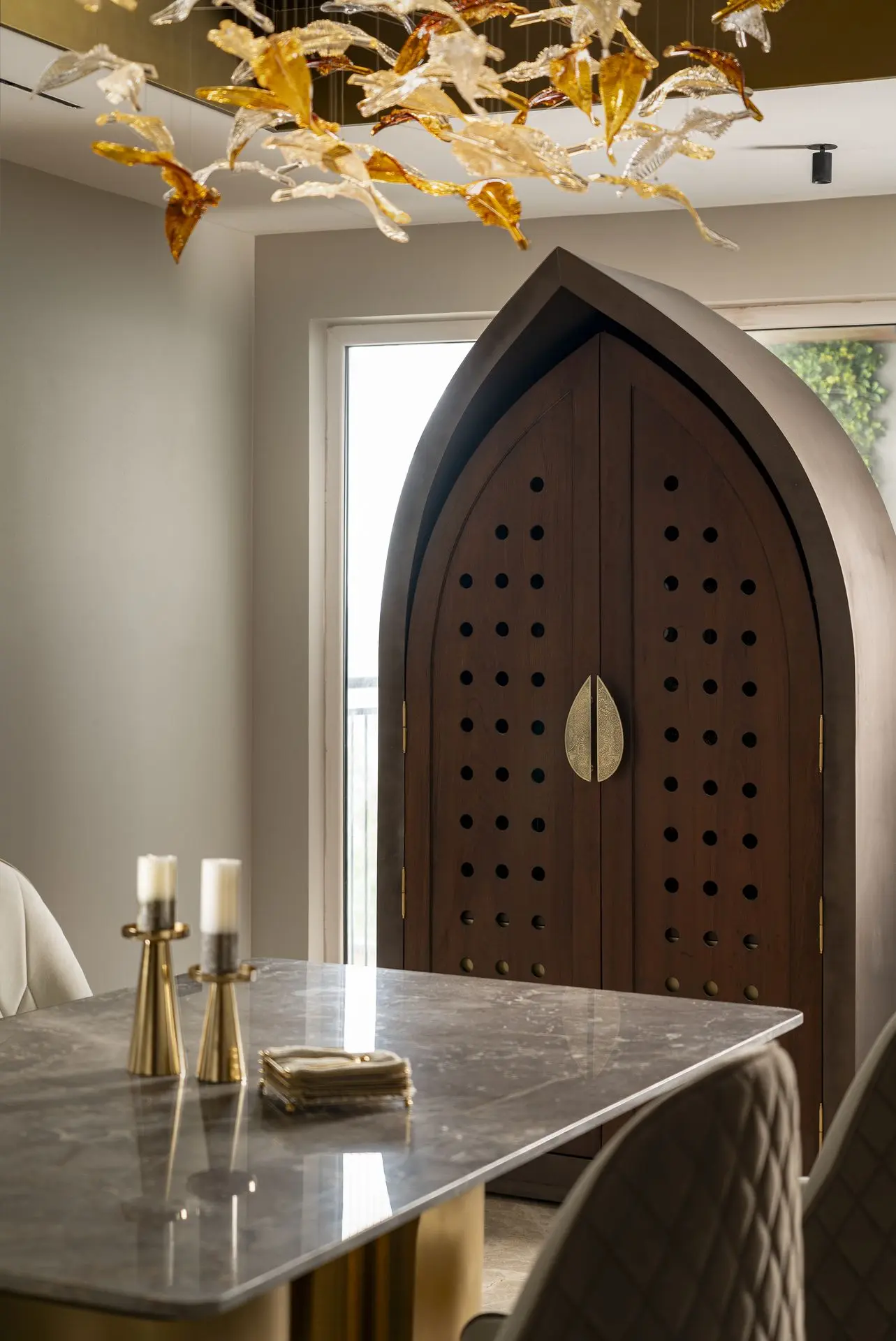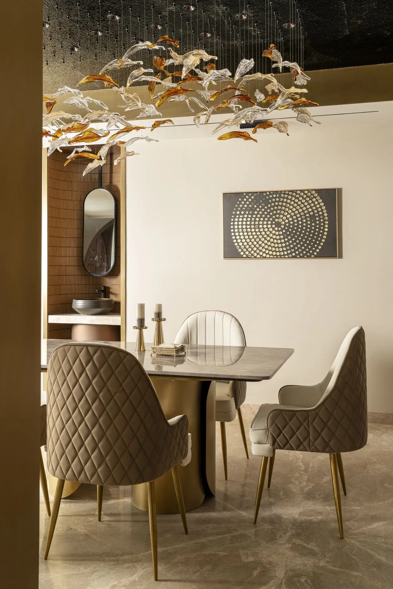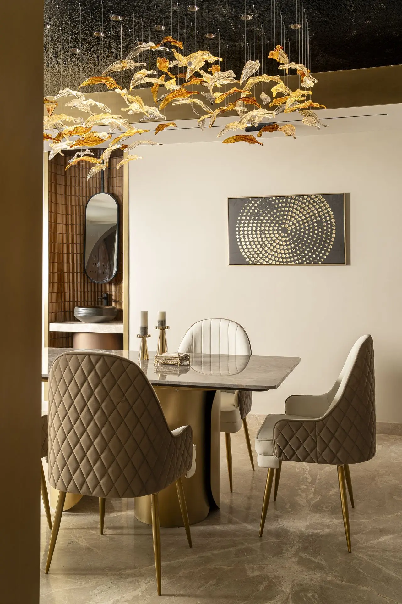 The dining area is designed around symmetry and structure, anchored by a substantial table and well-composed seating. The result is a space that feels grounded, elegant, and ideal for both everyday dining and special occasions.