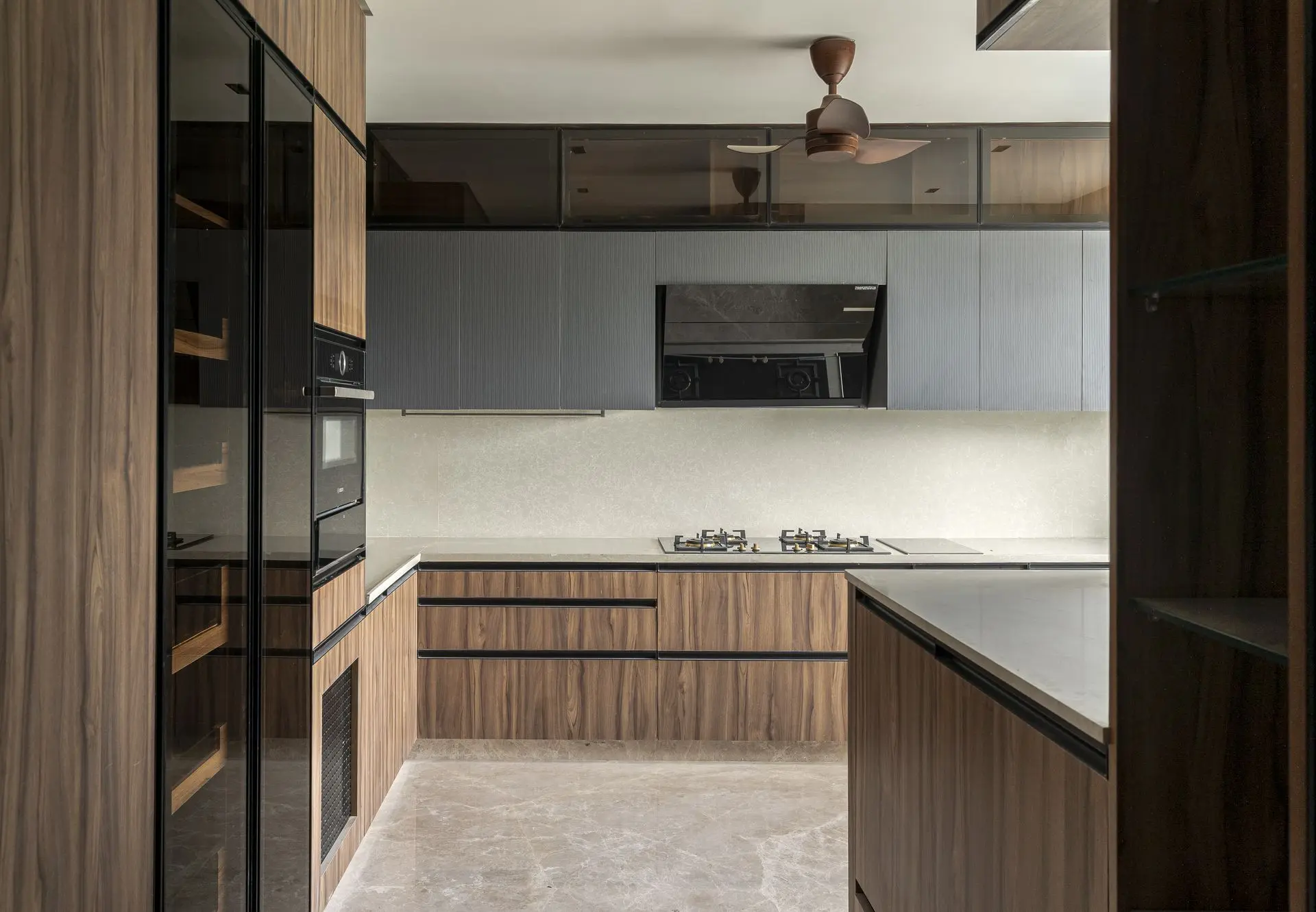 In the kitchen, a soothing palette of greys, neutrals, and whites creates a classic, fail-proof backdrop. Modern cabinetry in matte and high-shine finishes adds subtle contrast while maintaining a refined, uncluttered look.
