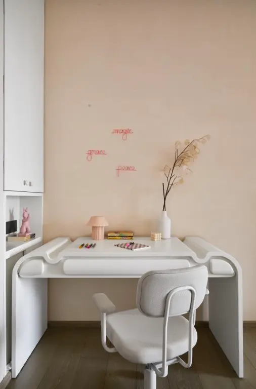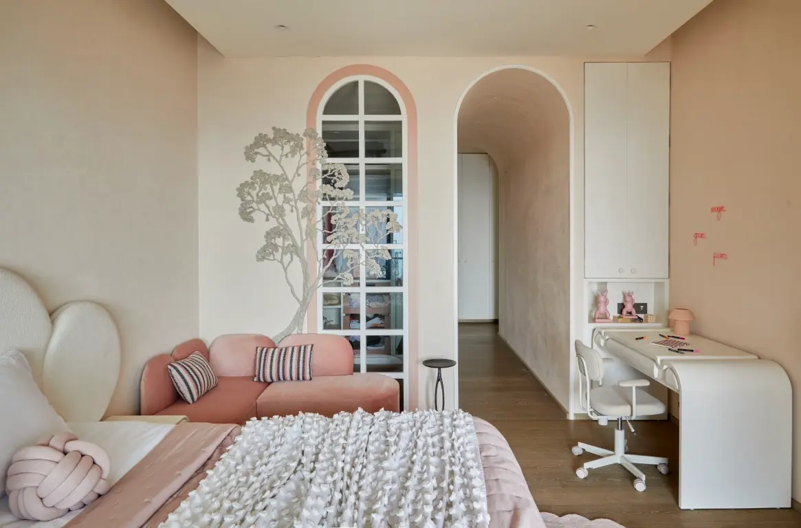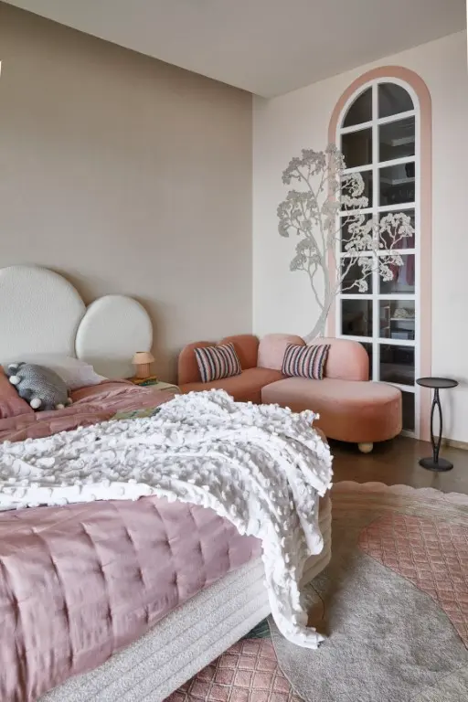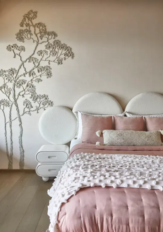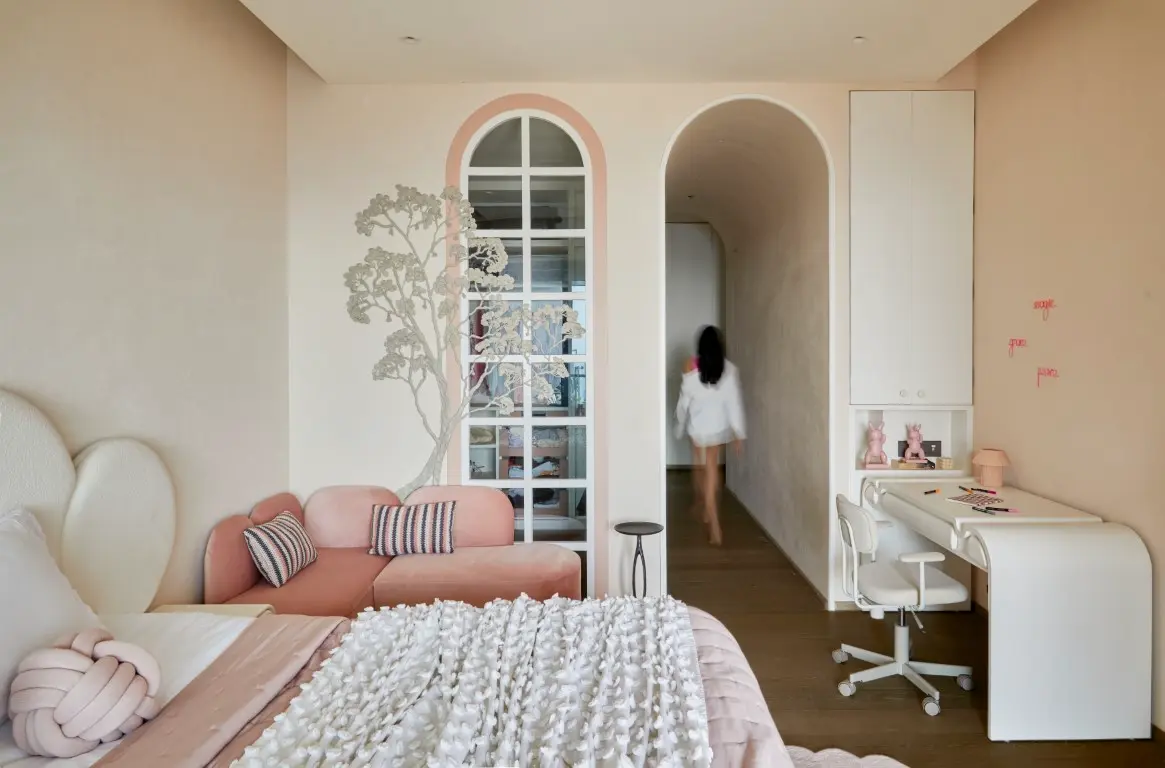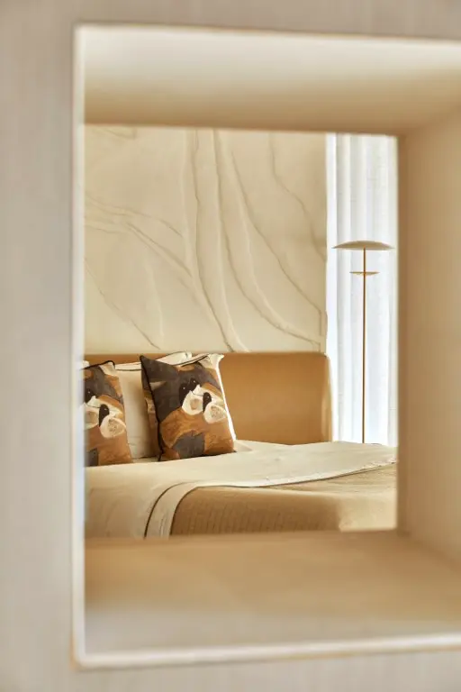 A ‘macaroon bed’ takes centre stage in the daughter’s room, flanked by bespoke clay tree murals that add whimsy without sacrificing sophistication. The parents’ room strikes a balance between the home’s overall organic aesthetic and a touch of traditional luxury, featuring acid- washed marble and textured wall panels.