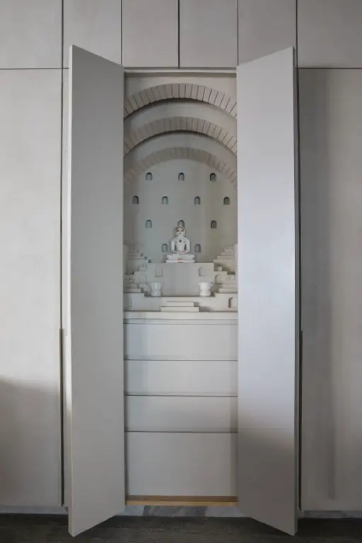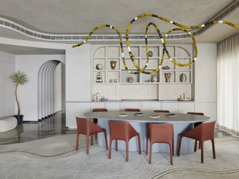 The design team has crafted a truly expansive heart for the home by merging two additional rooms with the original living space. This 1,350-square-foot area serves multiple functions without feeling cluttered or overwhelming. Zones for formal seating, television viewing, dining, and even a hidden limestone mandir coexist harmoniously, delineated by a bespoke contoured carpet that resembles an undulating ocean. Interspersed throughout are ‘islands’ of marble flooring, adding visual interest and practical definition to the space.